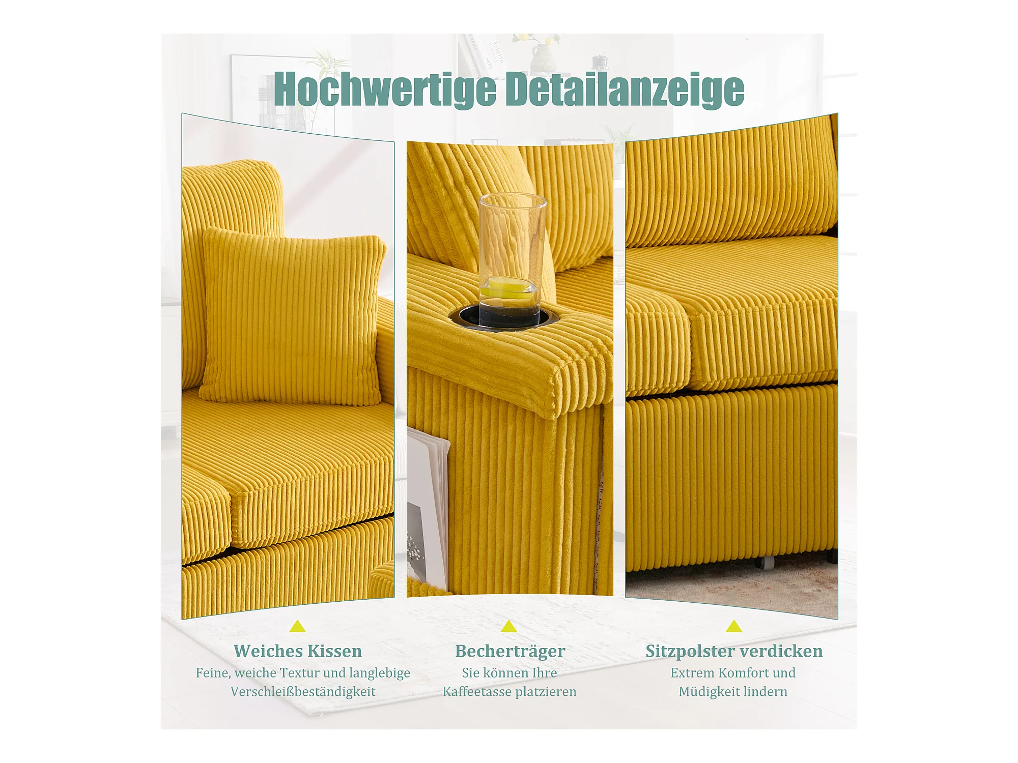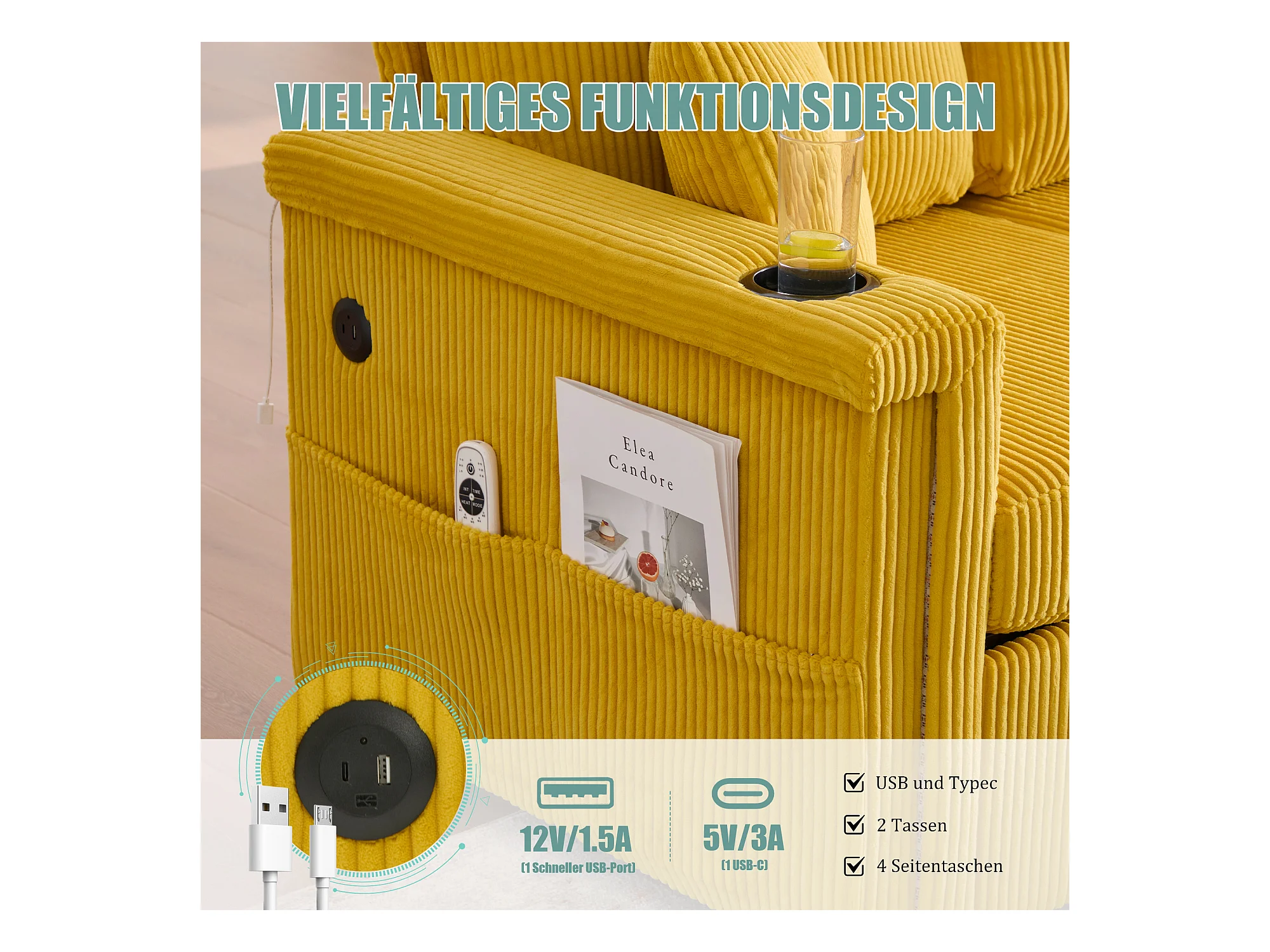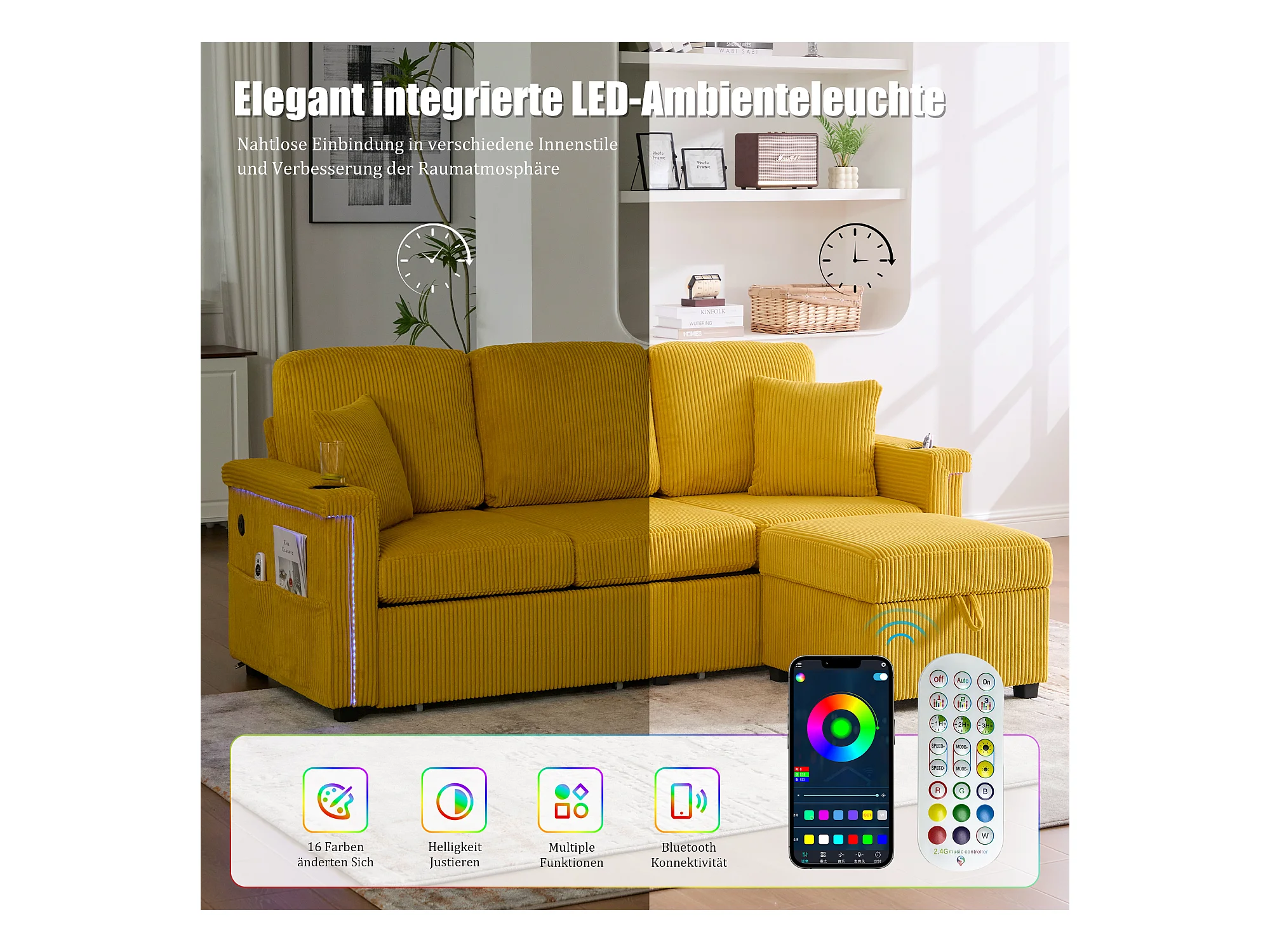 Canapé 4 places - 194 x 73 x 81 cm - avec Leds + USB + repose-pieds avec rangement + 2 tiroirs - Velours - jaune