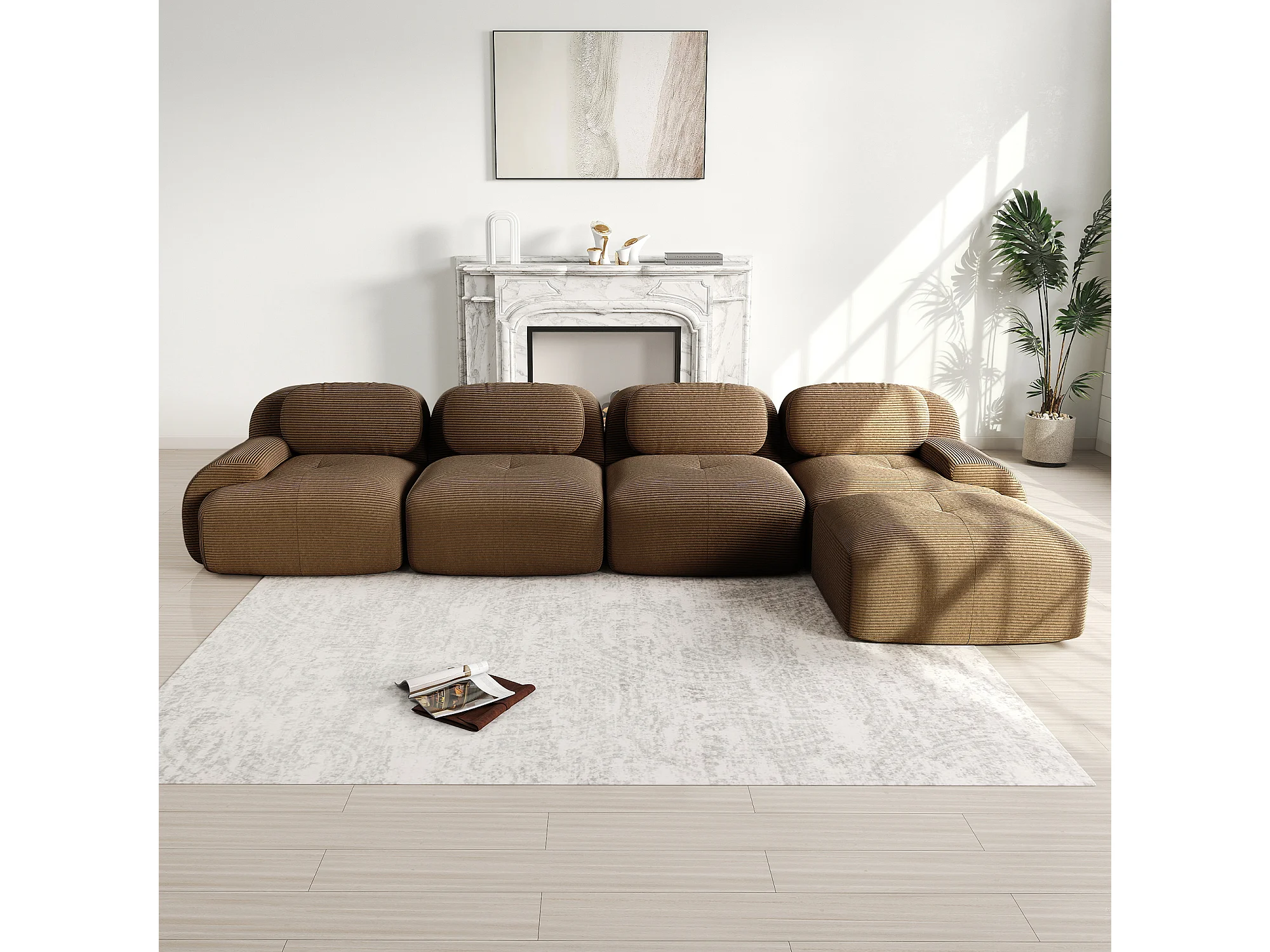 Canapé 4 places d'angle modulable - en Velours côtelé - avec 4 oreillers et pouf - 388x178x70cm - Marron