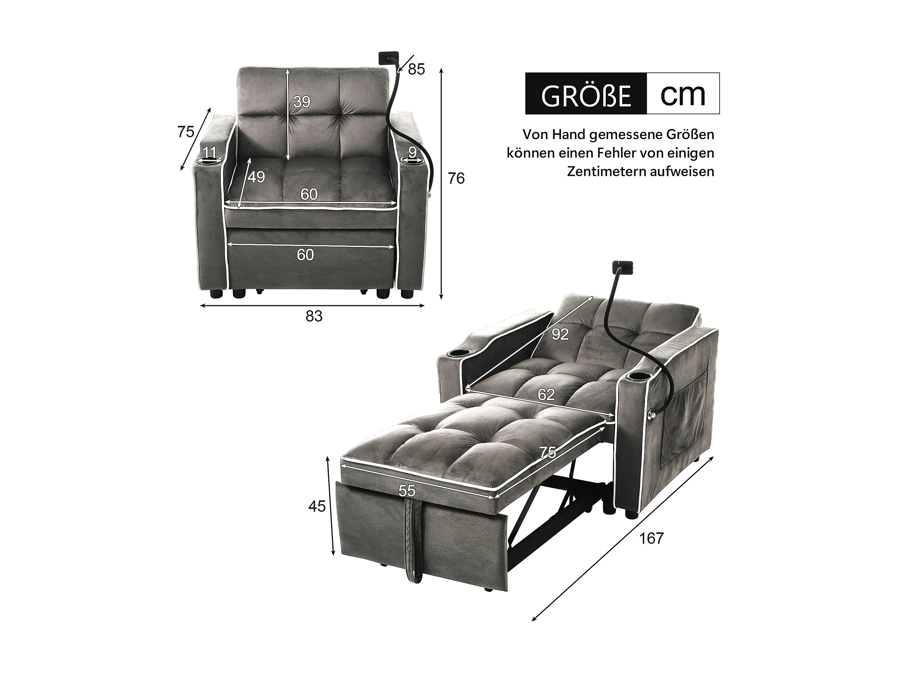 Fauteuil convertible 83x167x76 cm, 3 en 1, dossier réglable, porte gobelets, support téléphone, mousse, gris anthracite
