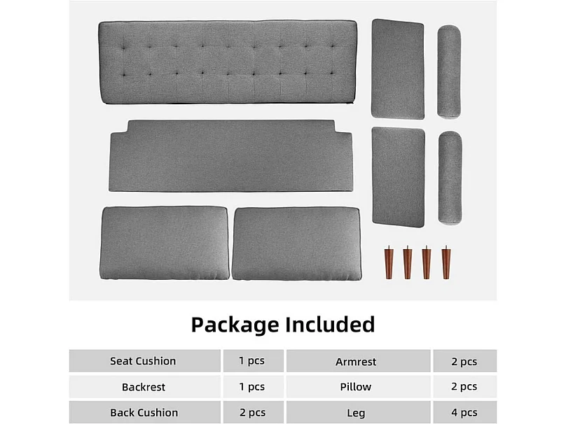 Canapé 3 places en tissu Lin gris - Scandinave - avec 2 Oreillers et Accoudoirs - Pieds bois massif - 173x77x84cm