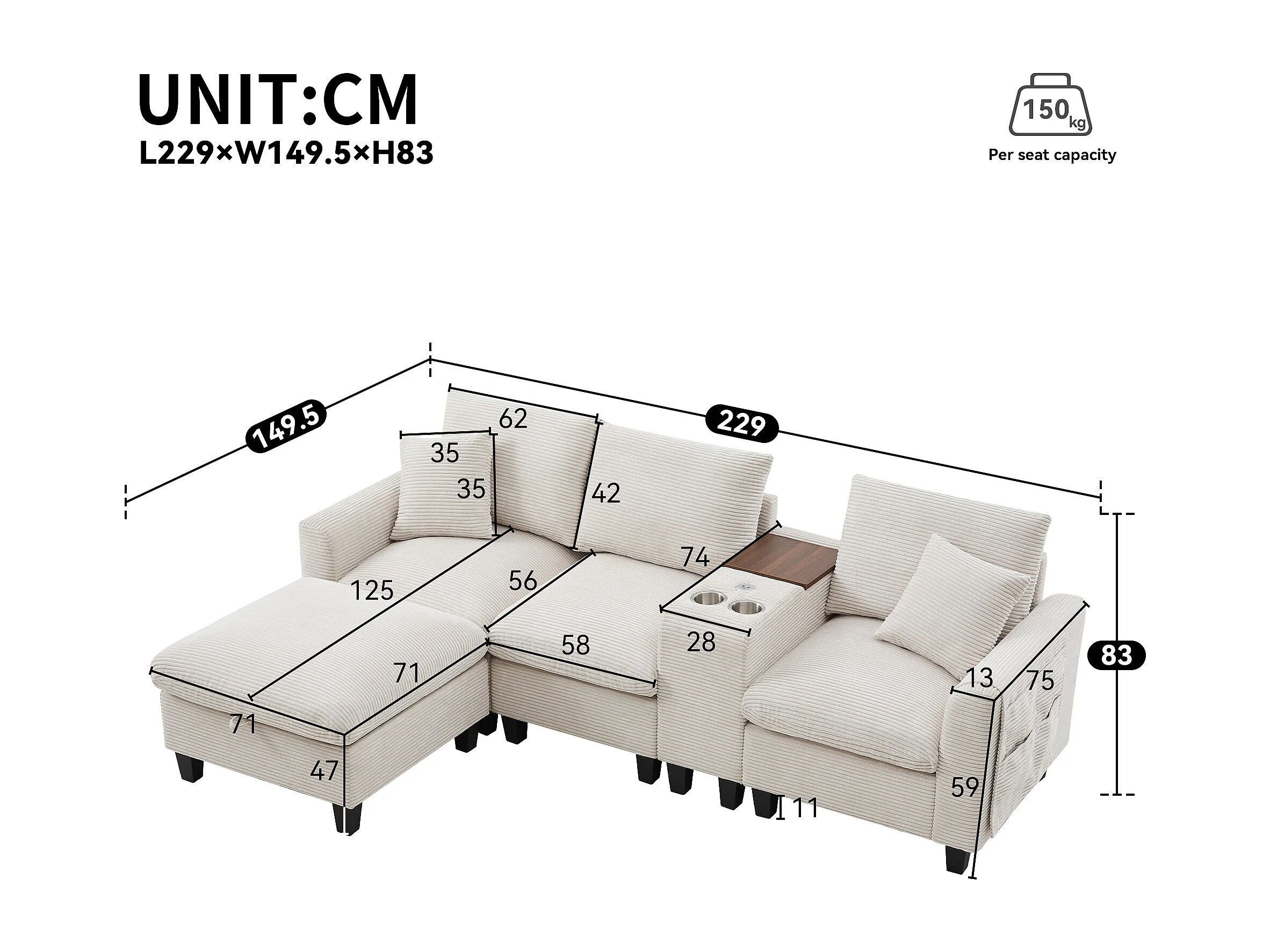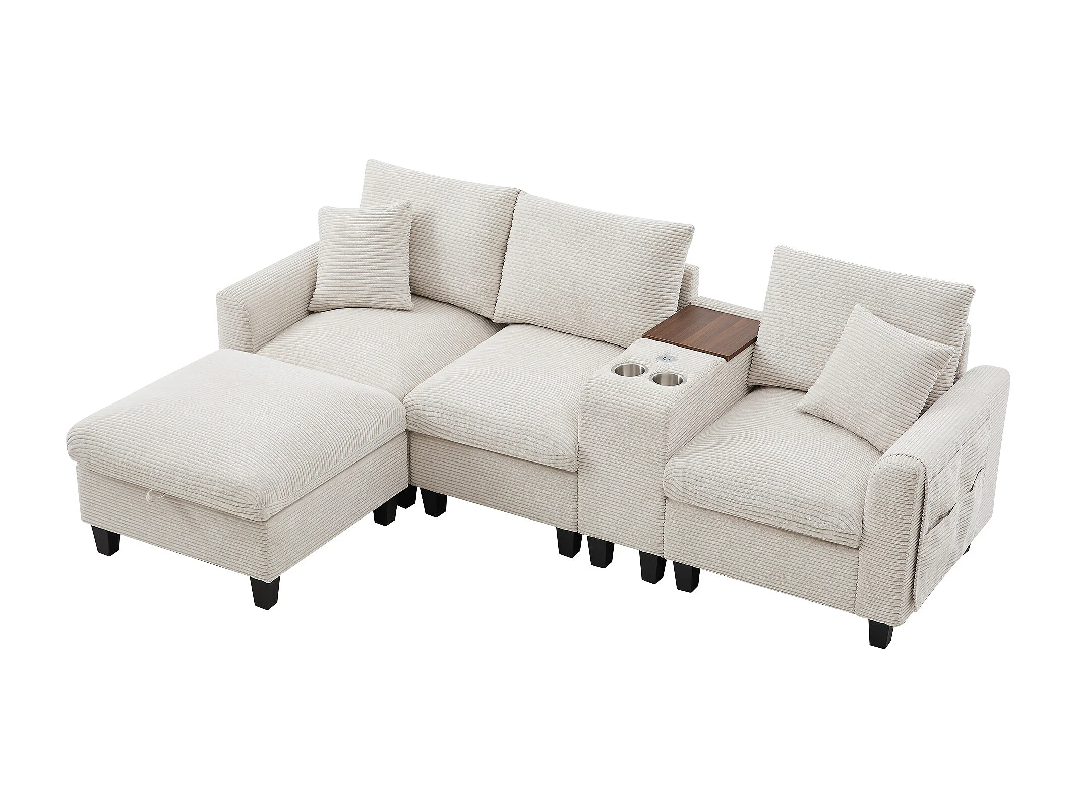 Canapé d’angle 229x149.5x83 cm, console avec 2 porte gobelets et 2 USB, pouf coffre, velours côtelé beige