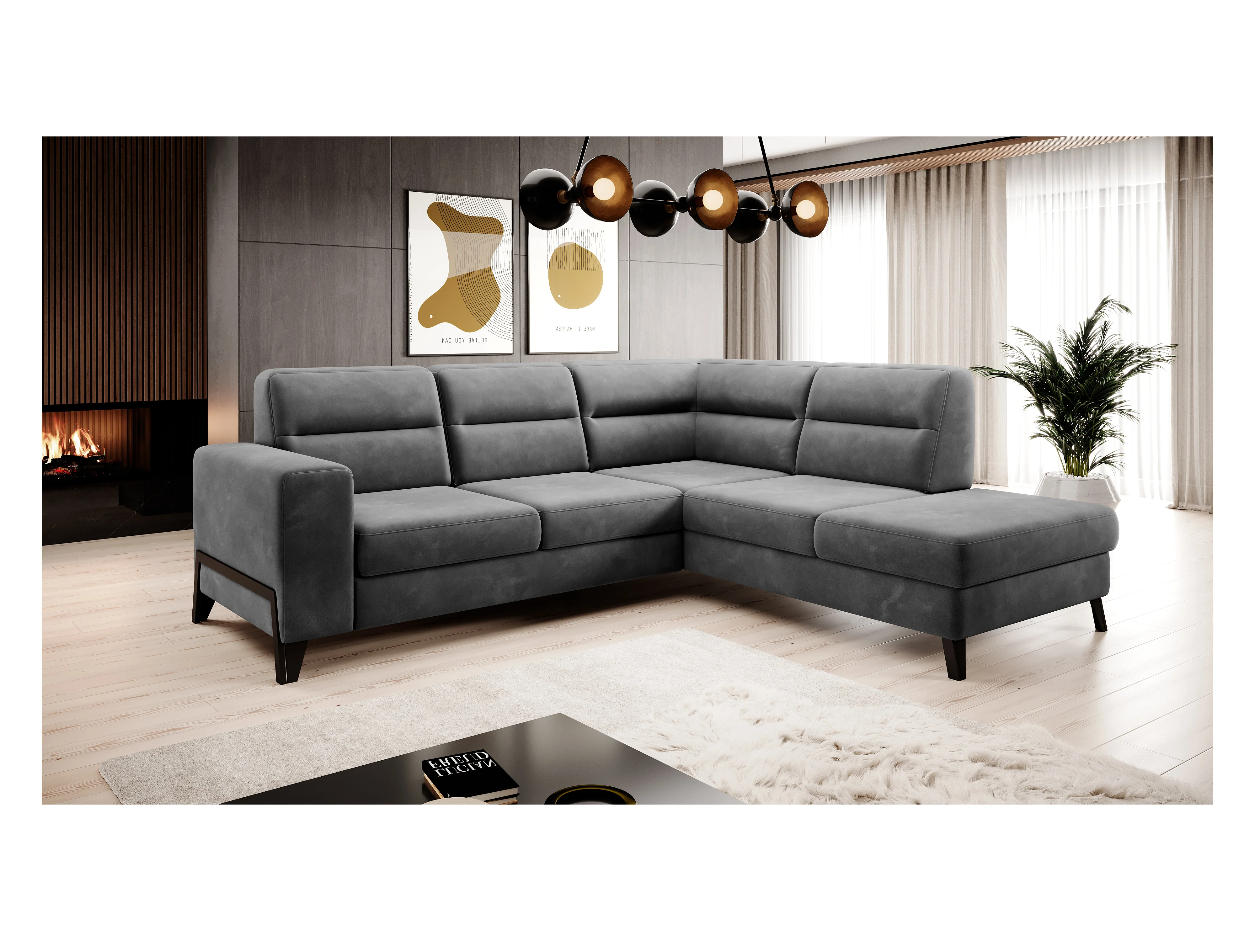 Canapé angle droit convertible velours gris foncé et pieds acier noir Kassidi 277cm