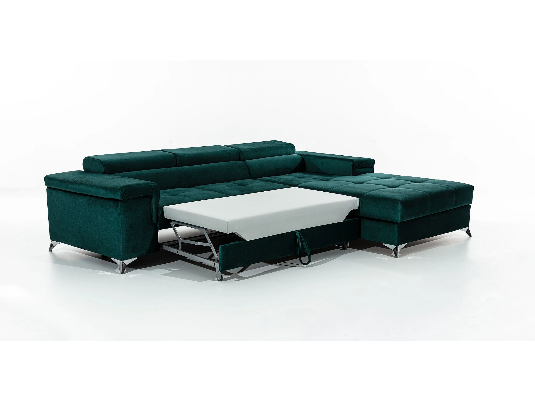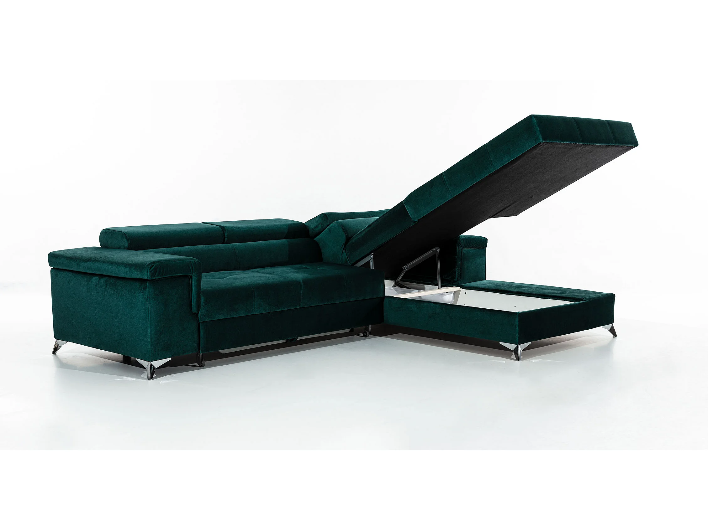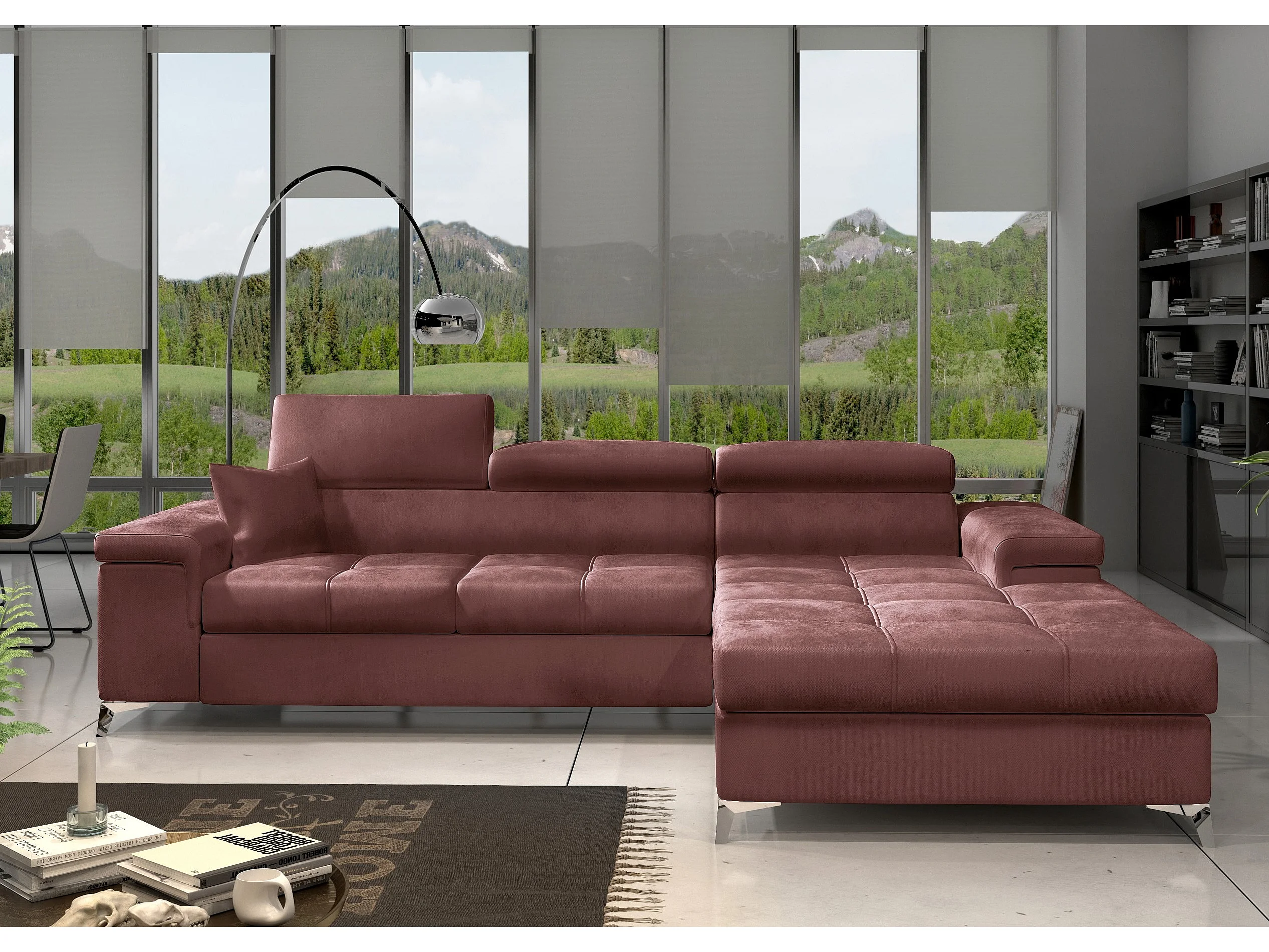 Canapé d'angle convertible velours appuis-tête réglables RIKARO - Coffre et pieds acier chromé-Vieux rose-angle droit
