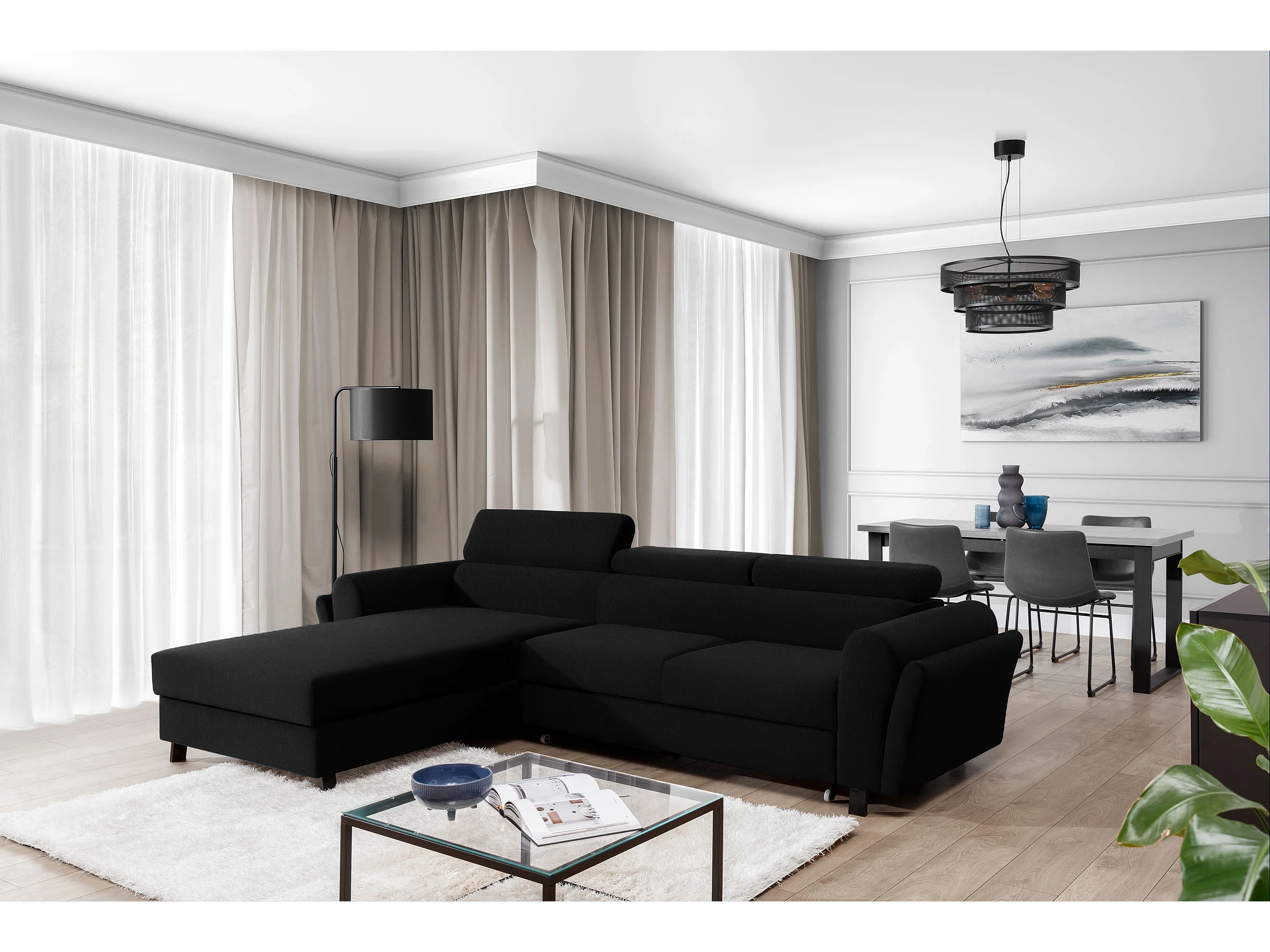 Canapé d’angle convertible MAZALI tissu- Appuis-tête réglables et rangement-Noir-Méridienne A gauche