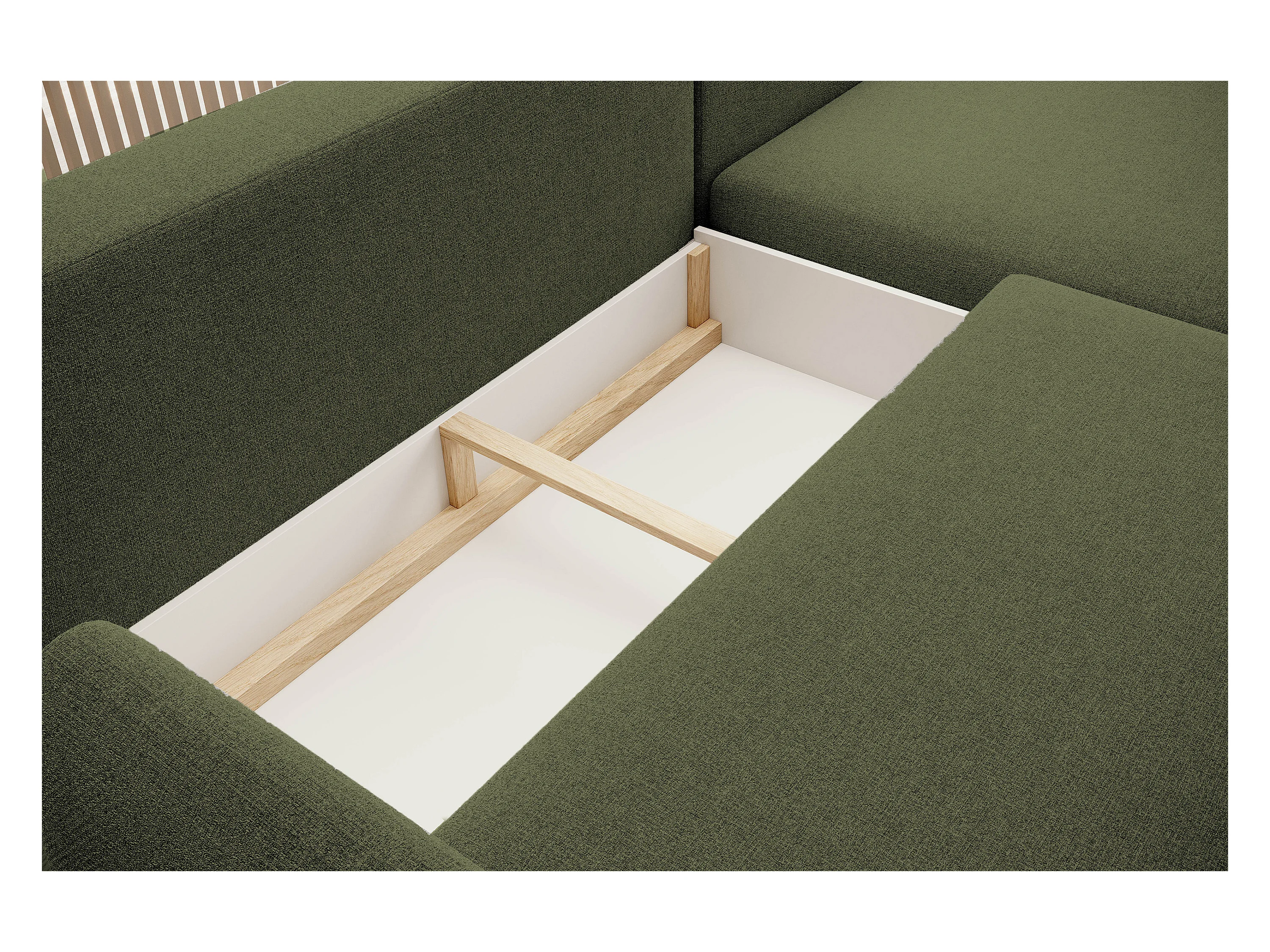 Canapé RAVEN L avec fonction de couchage, compartiment à literie, indépendant, rembourré avec têtières réglables 257x198x96 cm Côté droit Vert foncé