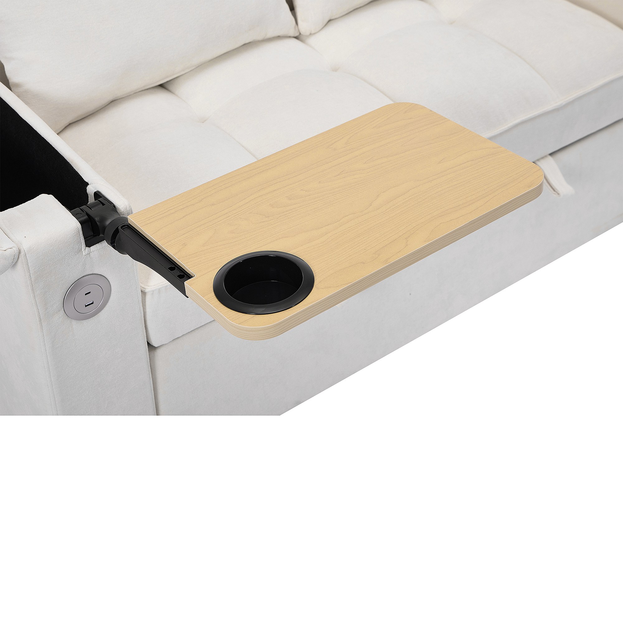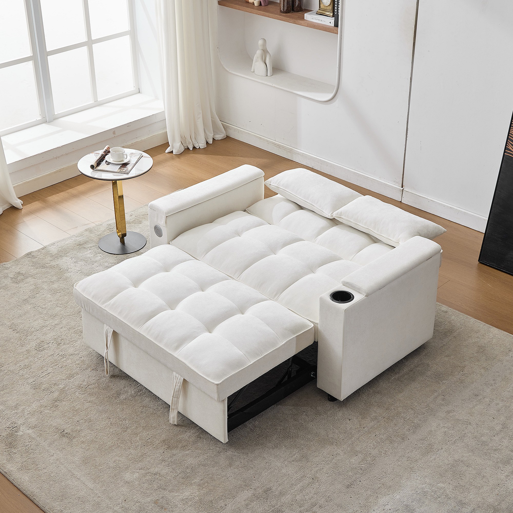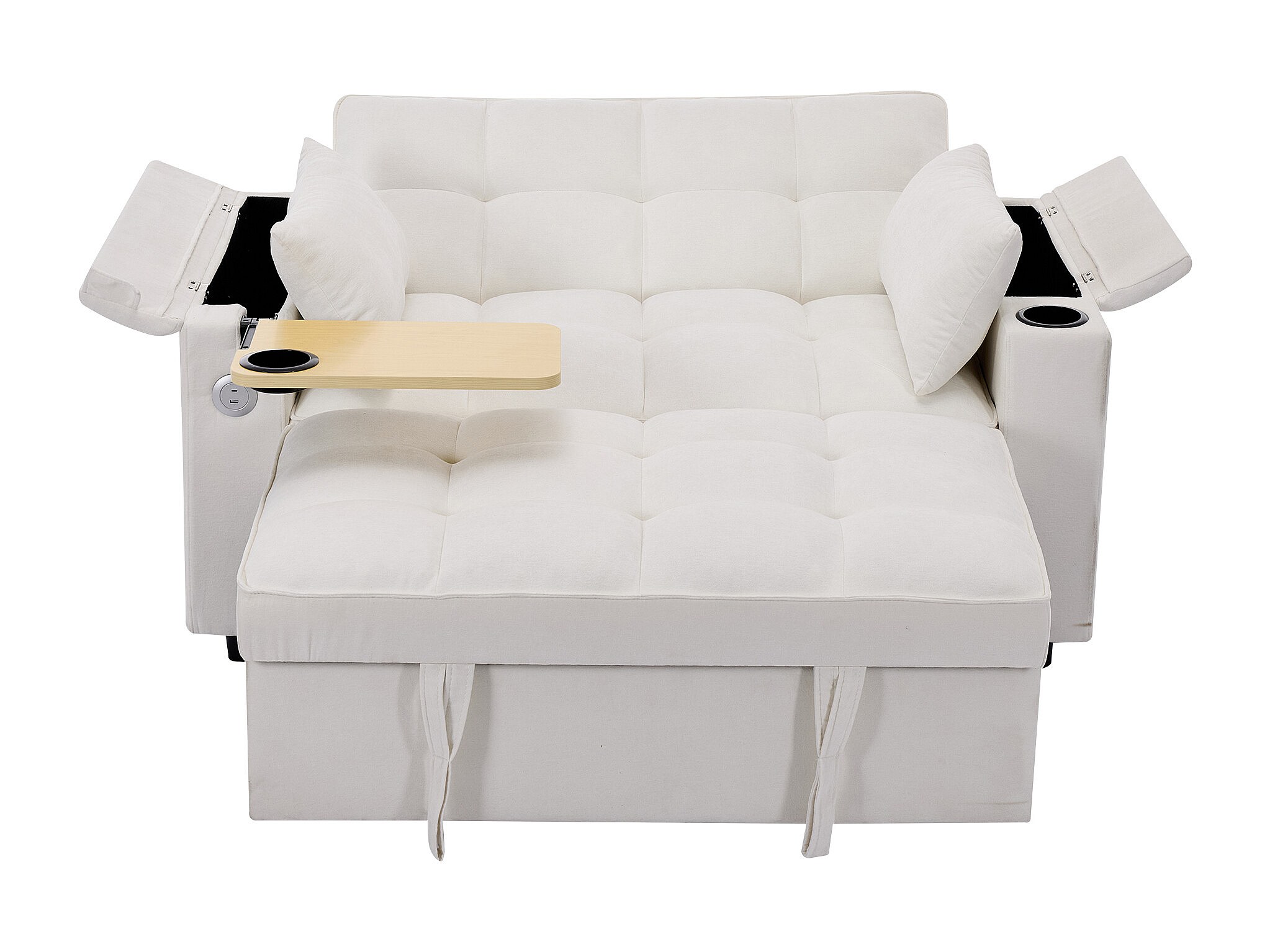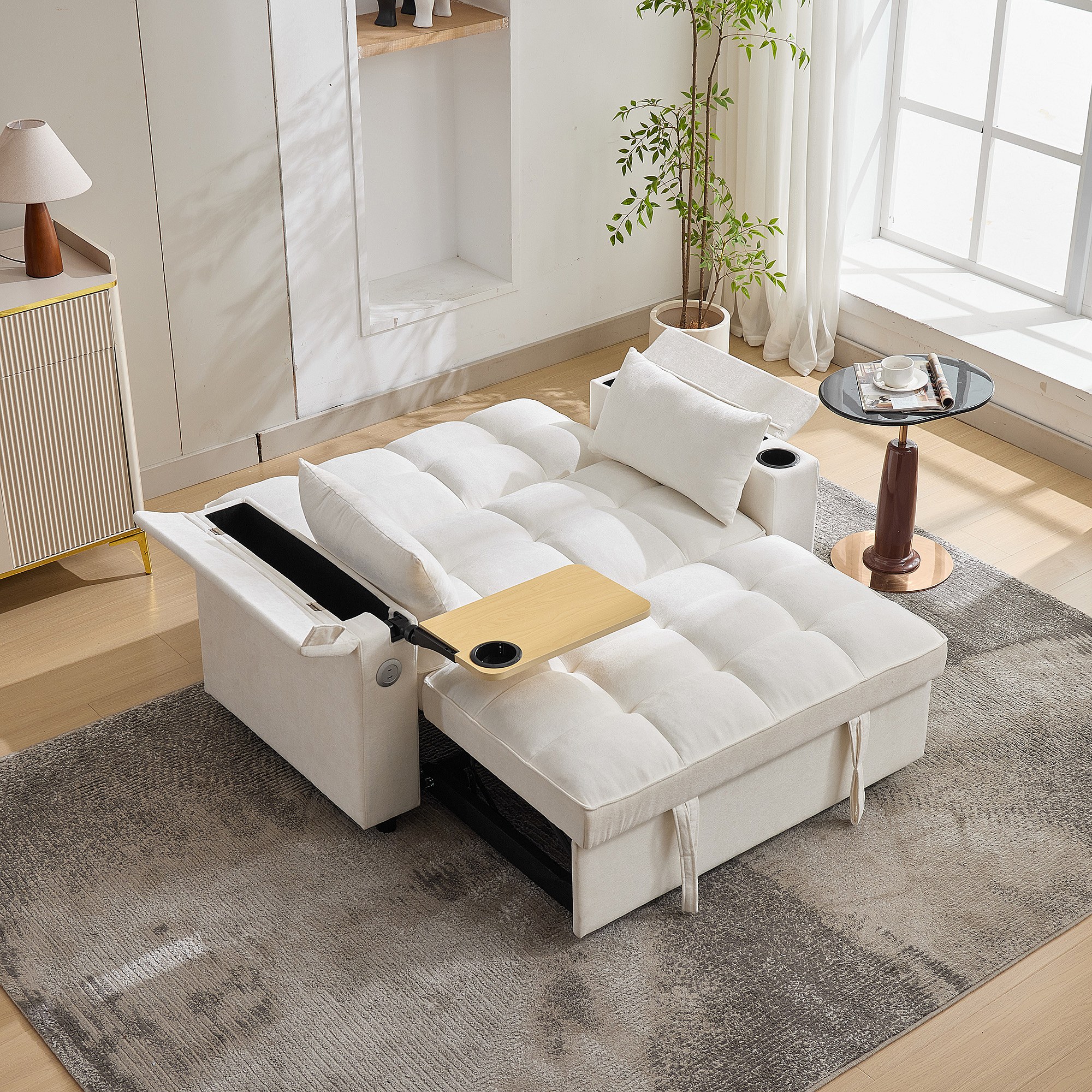 Canapé convertible 2 personnes 140.5x74x82 cm - Dossier réglable - Port USB - Porte-gobelet - Petite table d'appoint - Beige