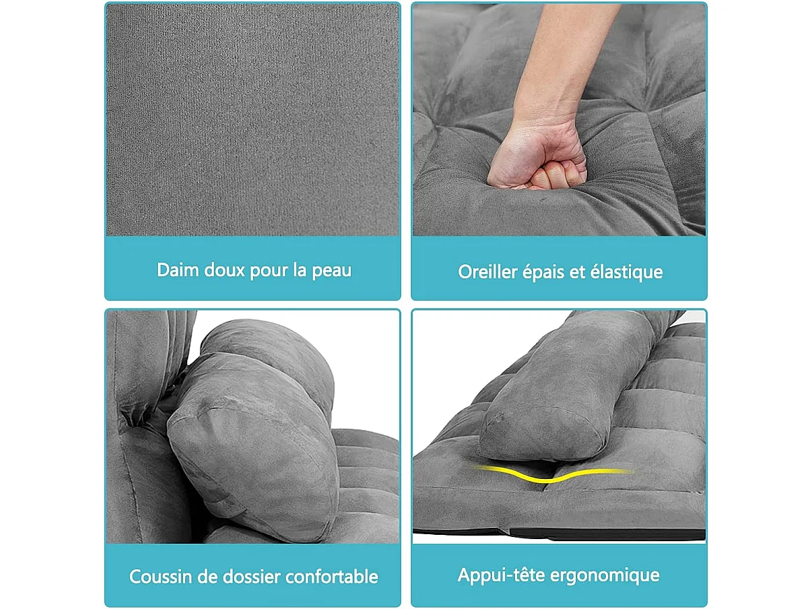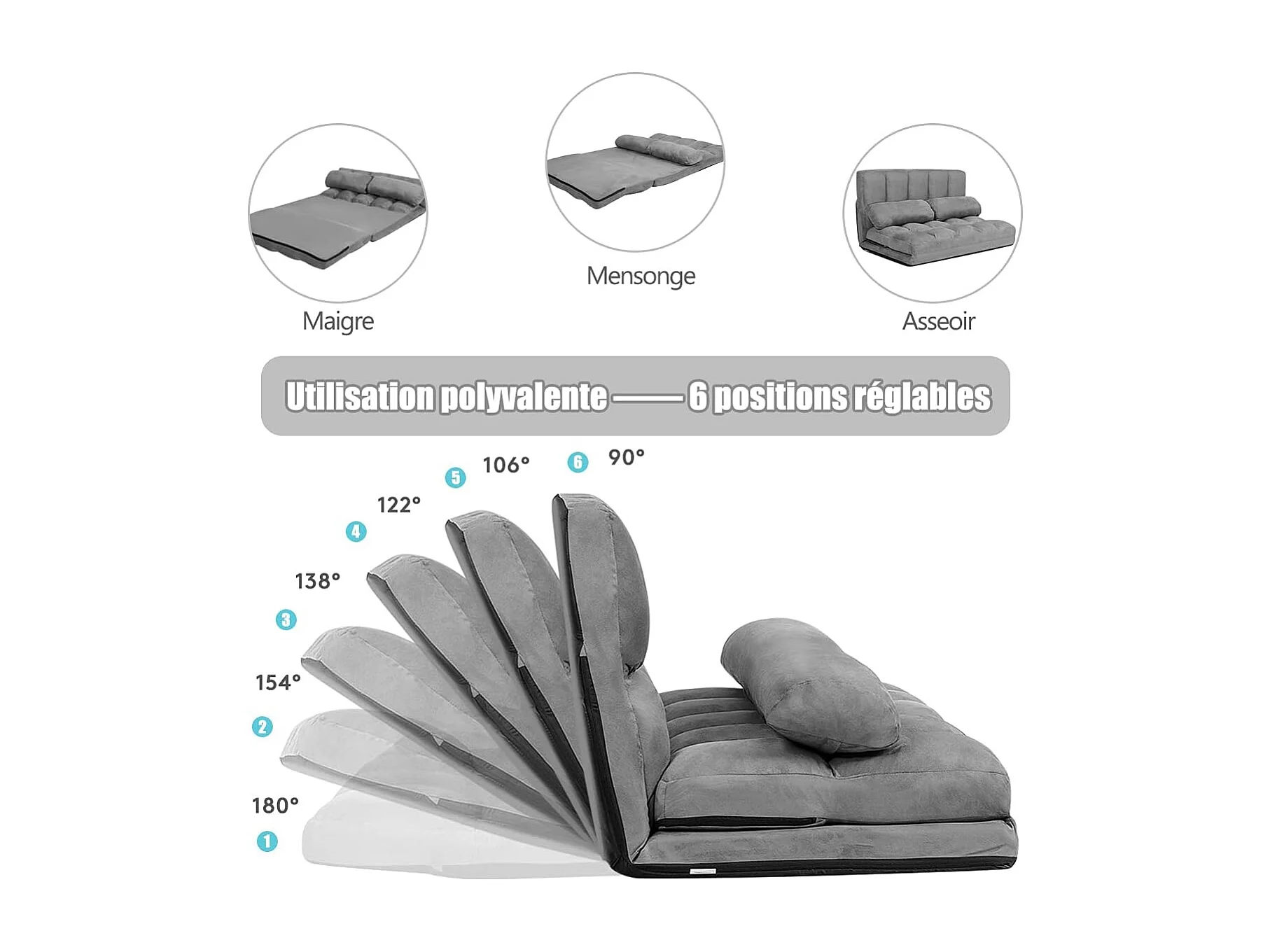 Canapé Convertible 2 Place 113 x 180 cm, Dossier Réglable à 6 Positions, Housse Détachable, Gris
