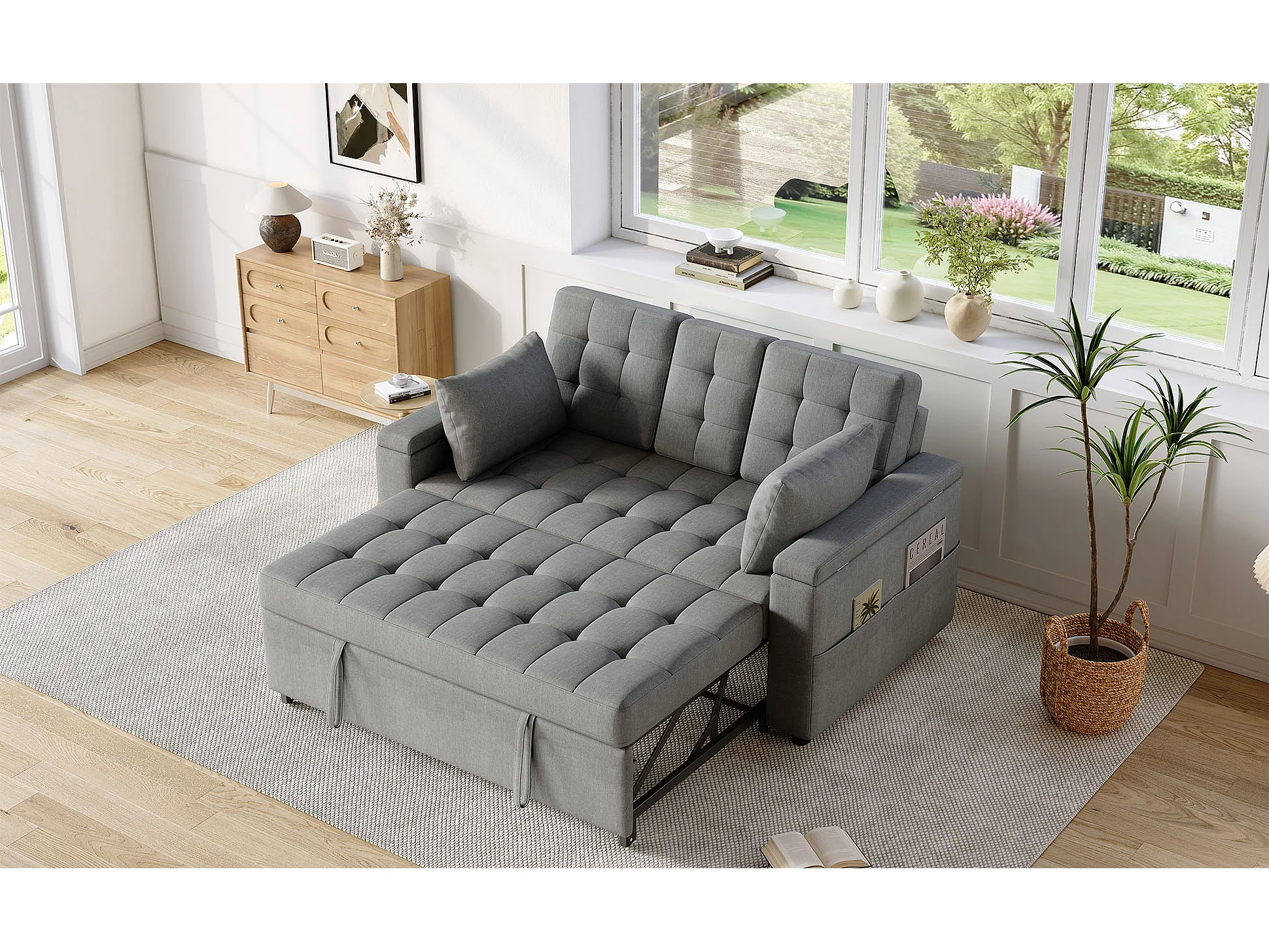 Canapé convertible 2 places avec dossier réglable et porte-gobelet - Tissu coton-lin gris