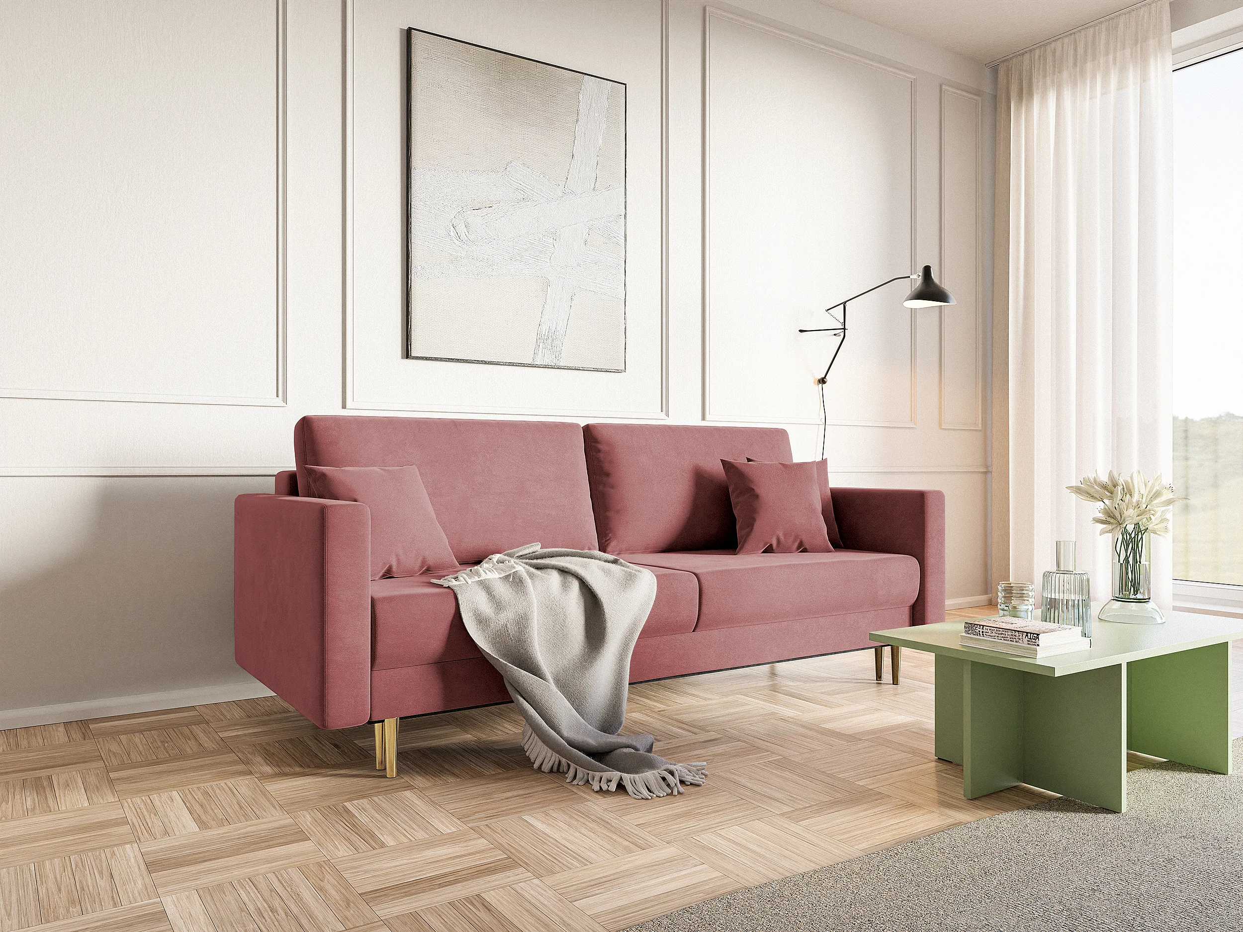 Canapé convertible - 200 cm - 3 places - velours hydrophobe - rose - VALICO