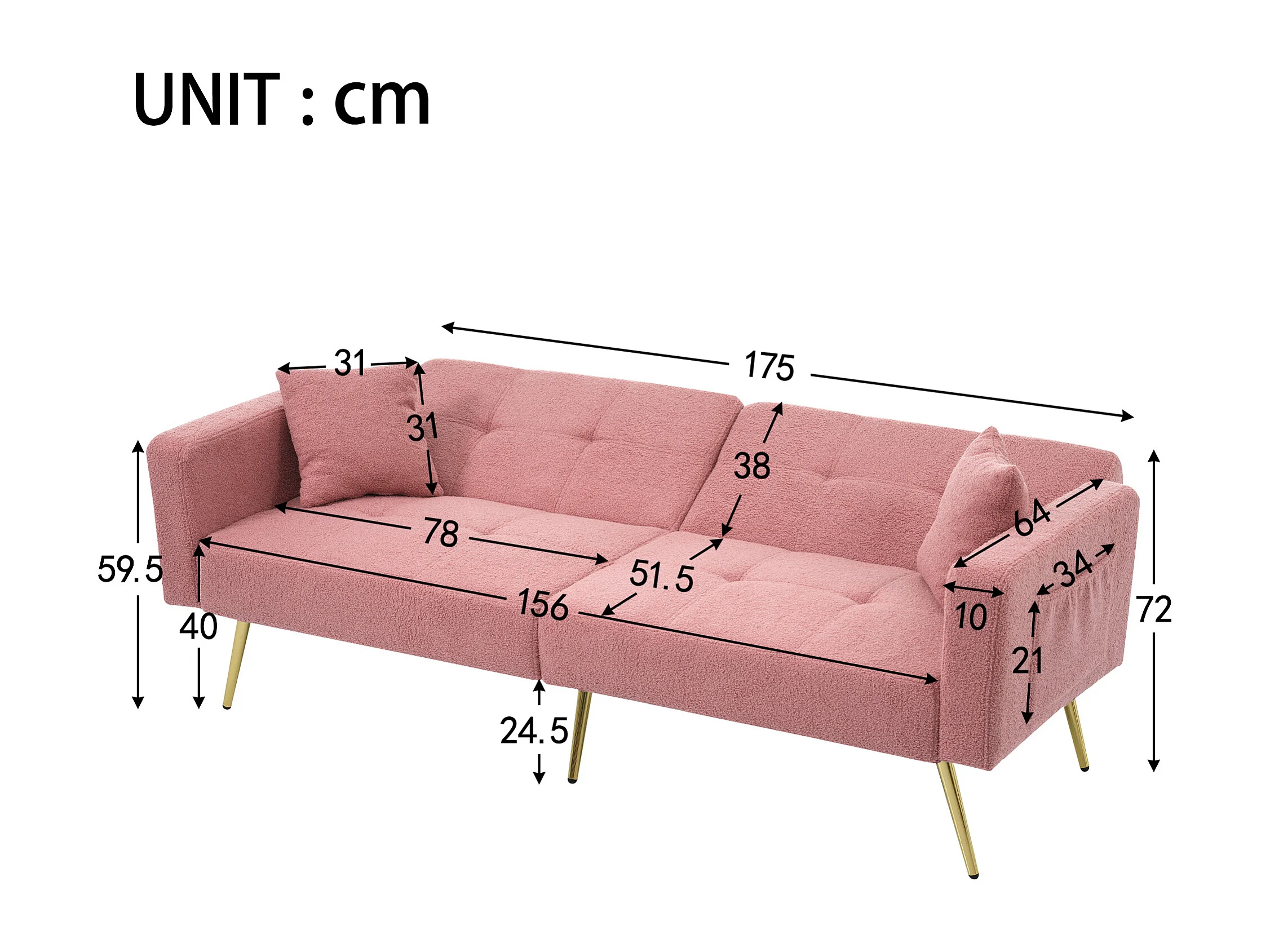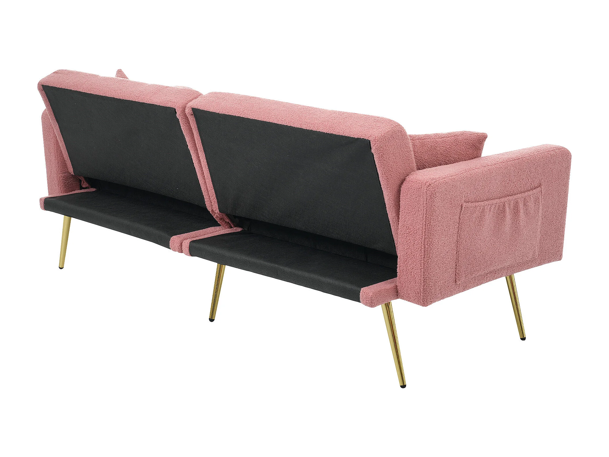 Canapé convertible avec fonction lit, angle réglable, pieds dorés, avec coussins et poches latérales (175x64x72 cm)