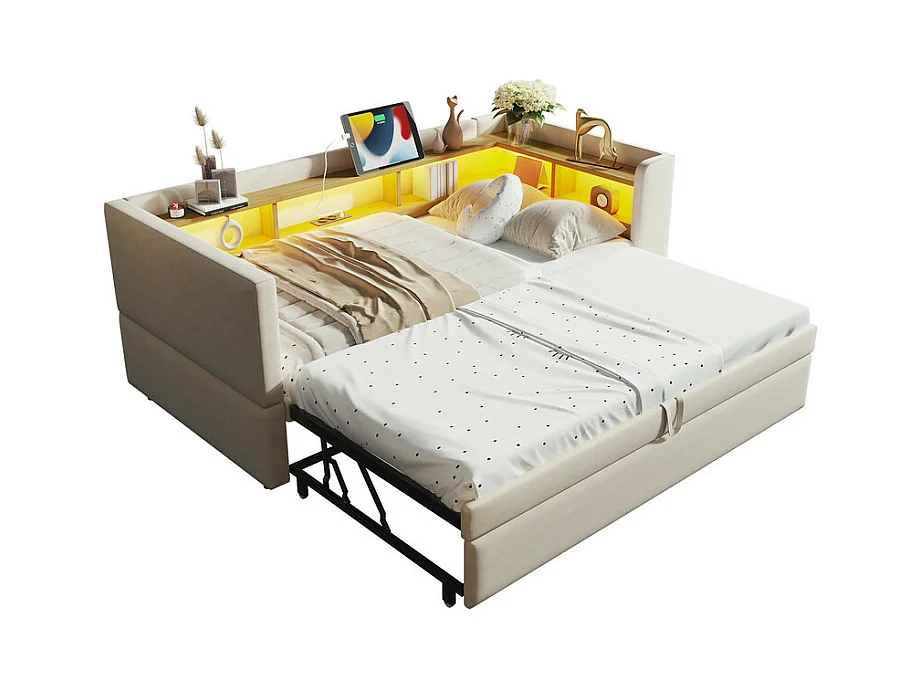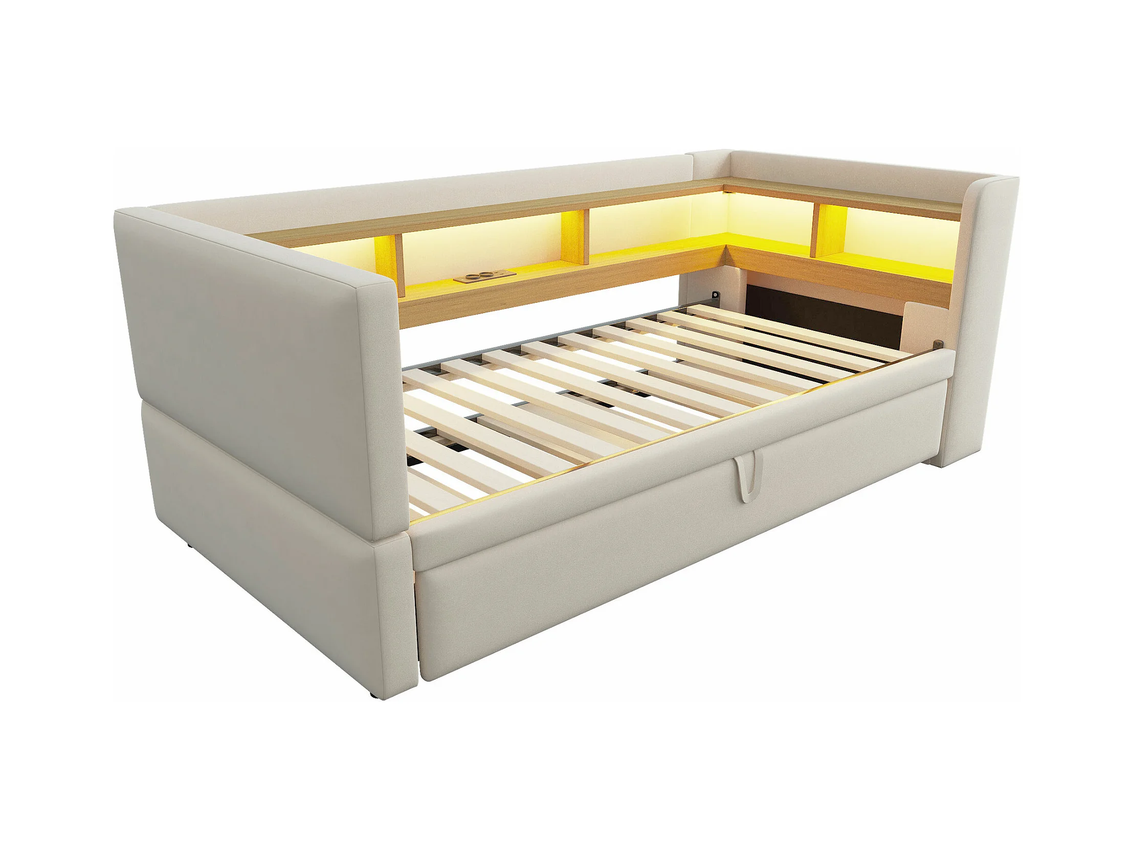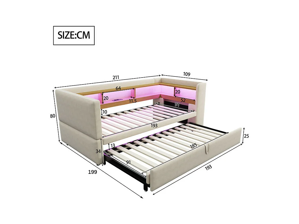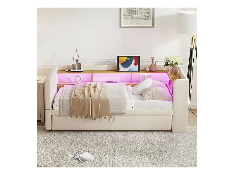Lit banquette 90x190 cm, lin beige, Lit gigogne avec chargement USB, porte-gobelet et étagère de rangement, sans matelas