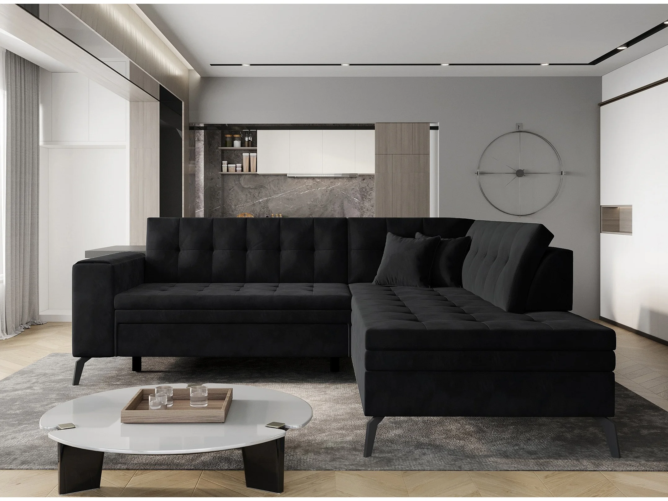 Canapé panoramique convertible KUTTY velours - Rangement et têtières réglables-Noir-Coffre à gauche