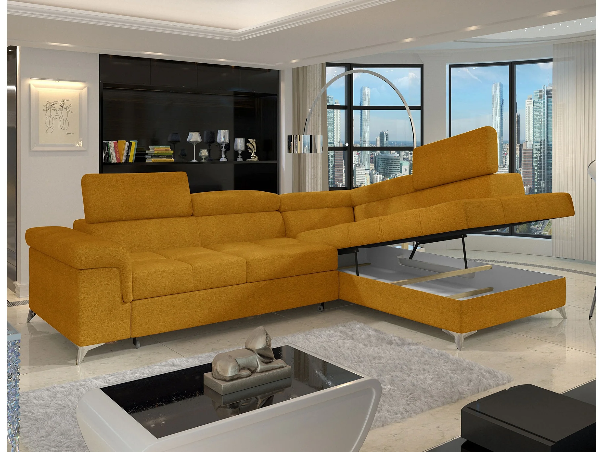 Canapé d'angle convertible tissu MARIDO - Coffre et appuis-tête réglables-Jaune chamoix-angle droit