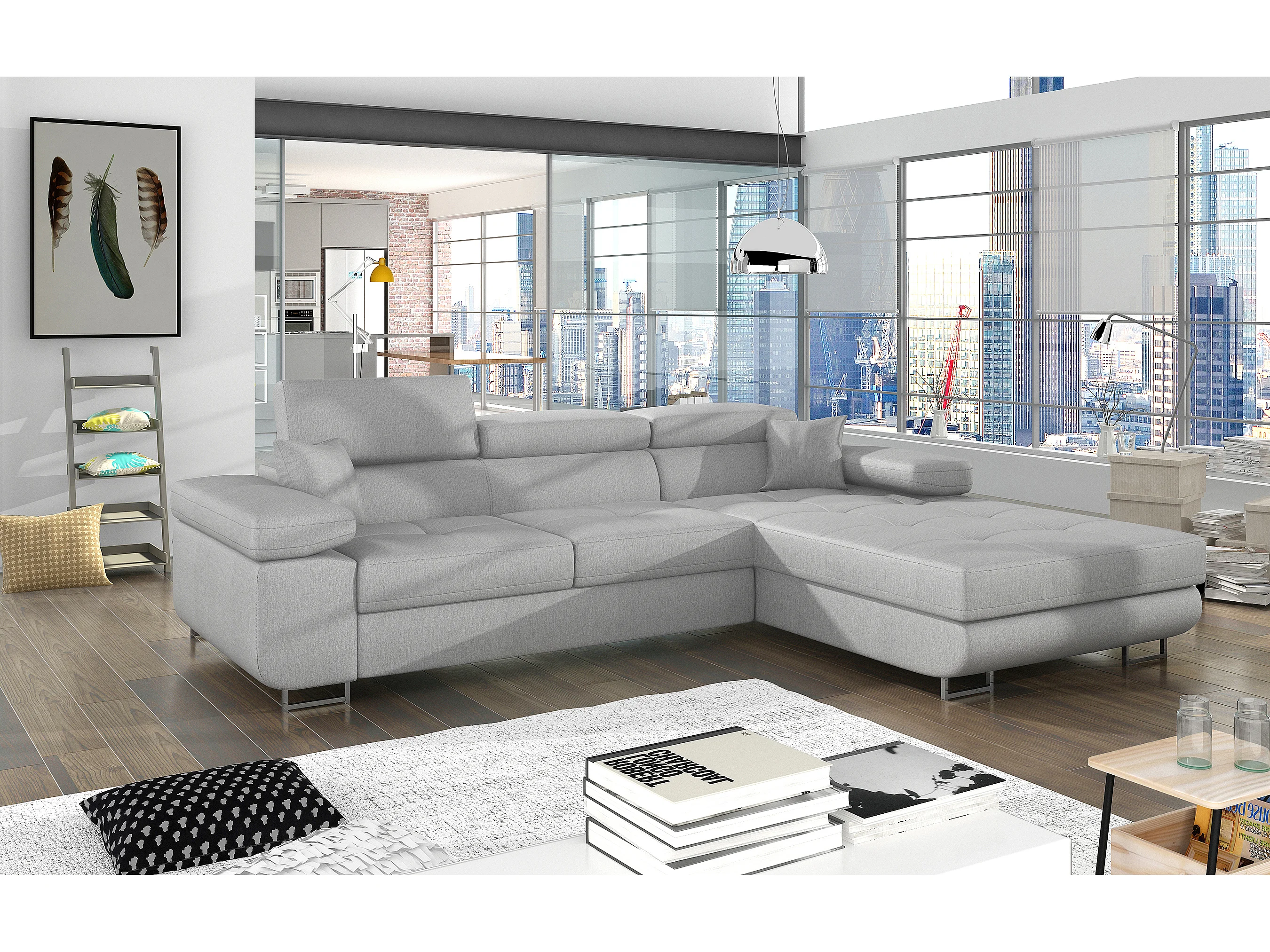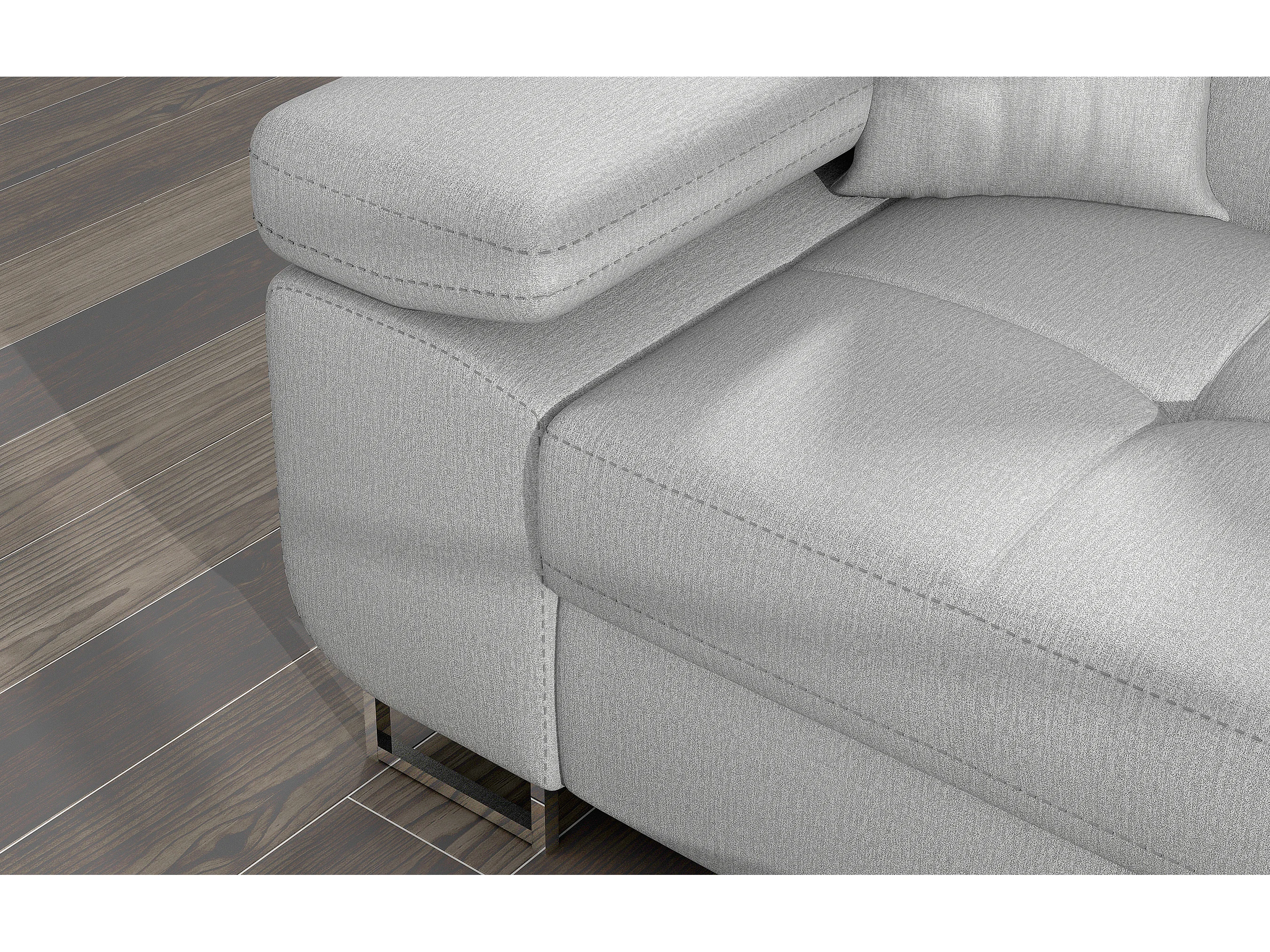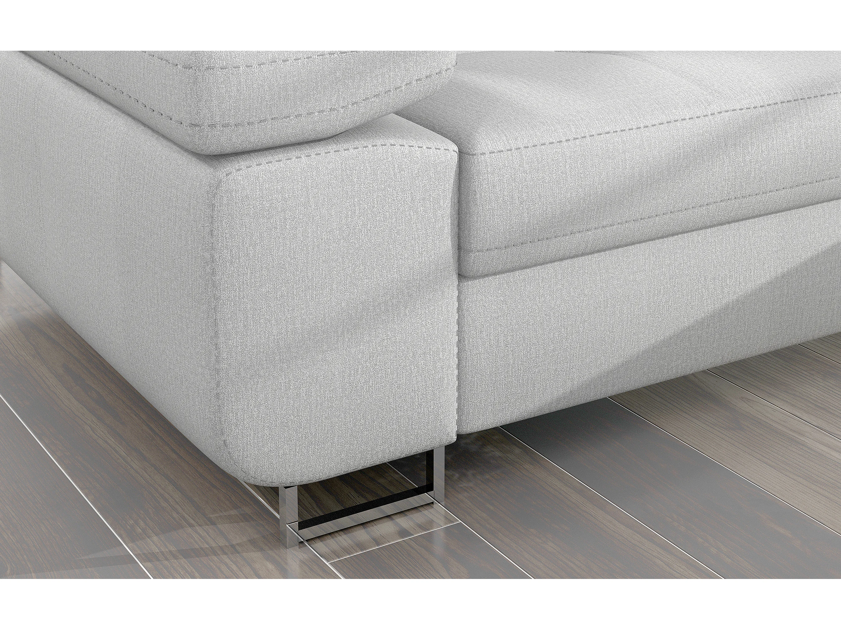 Canapé d'angle convertible velours appuis-tête réglables KALIZO - Coffre et pieds acier chromé-Gris clair-angle droit