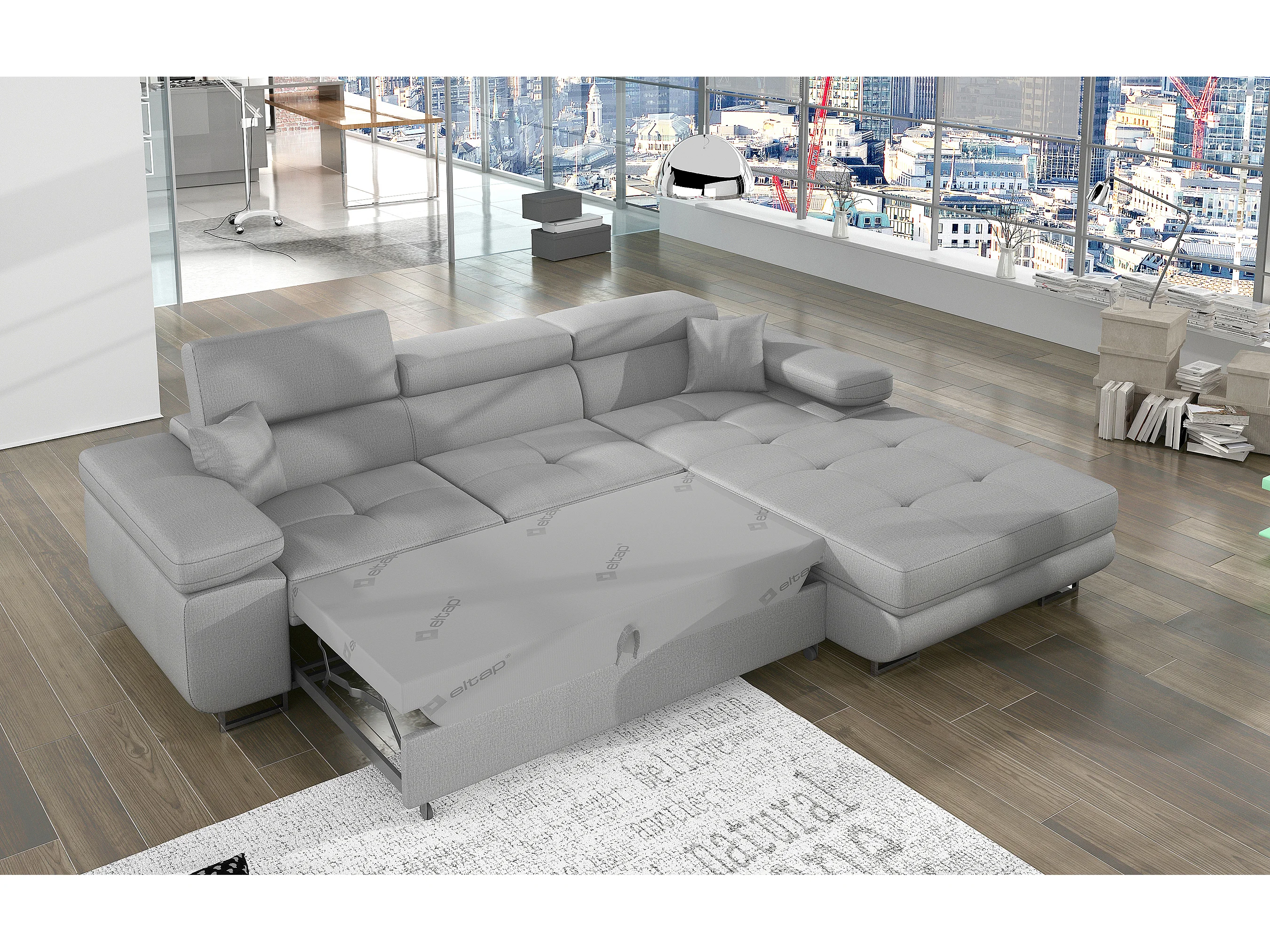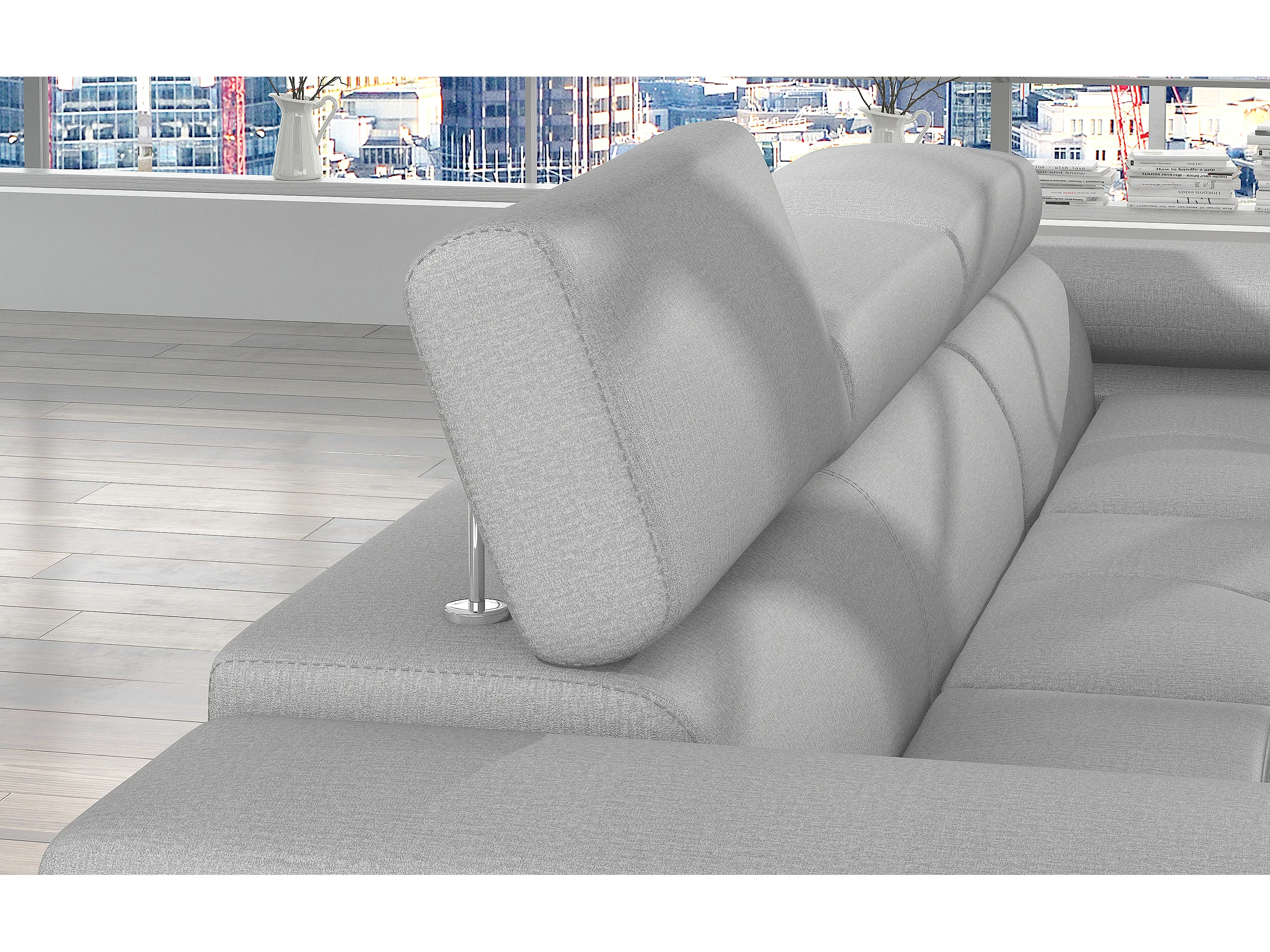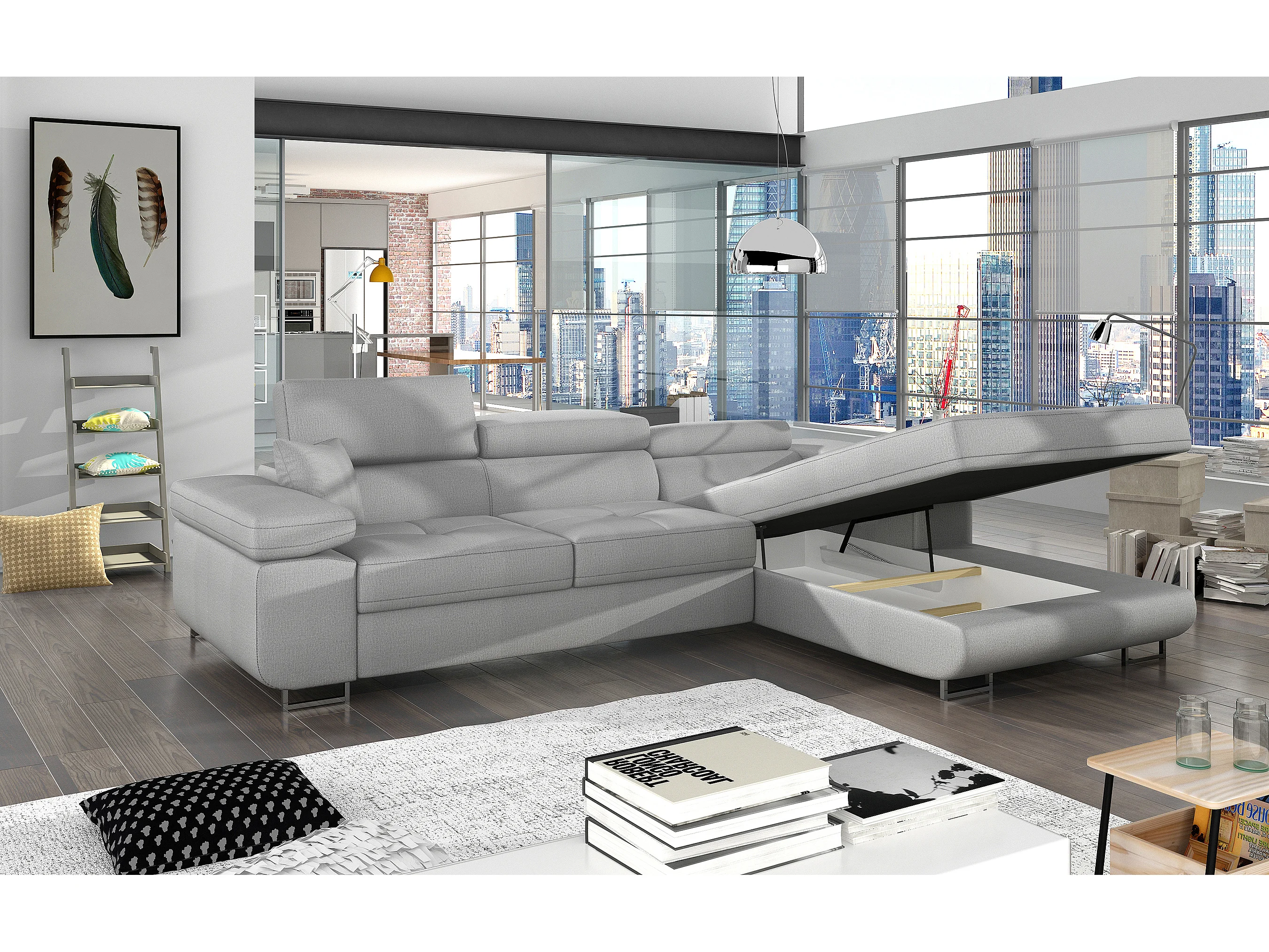 Canapé d'angle convertible velours appuis-tête réglables KALIZO - Coffre et pieds acier chromé-Gris clair-angle droit