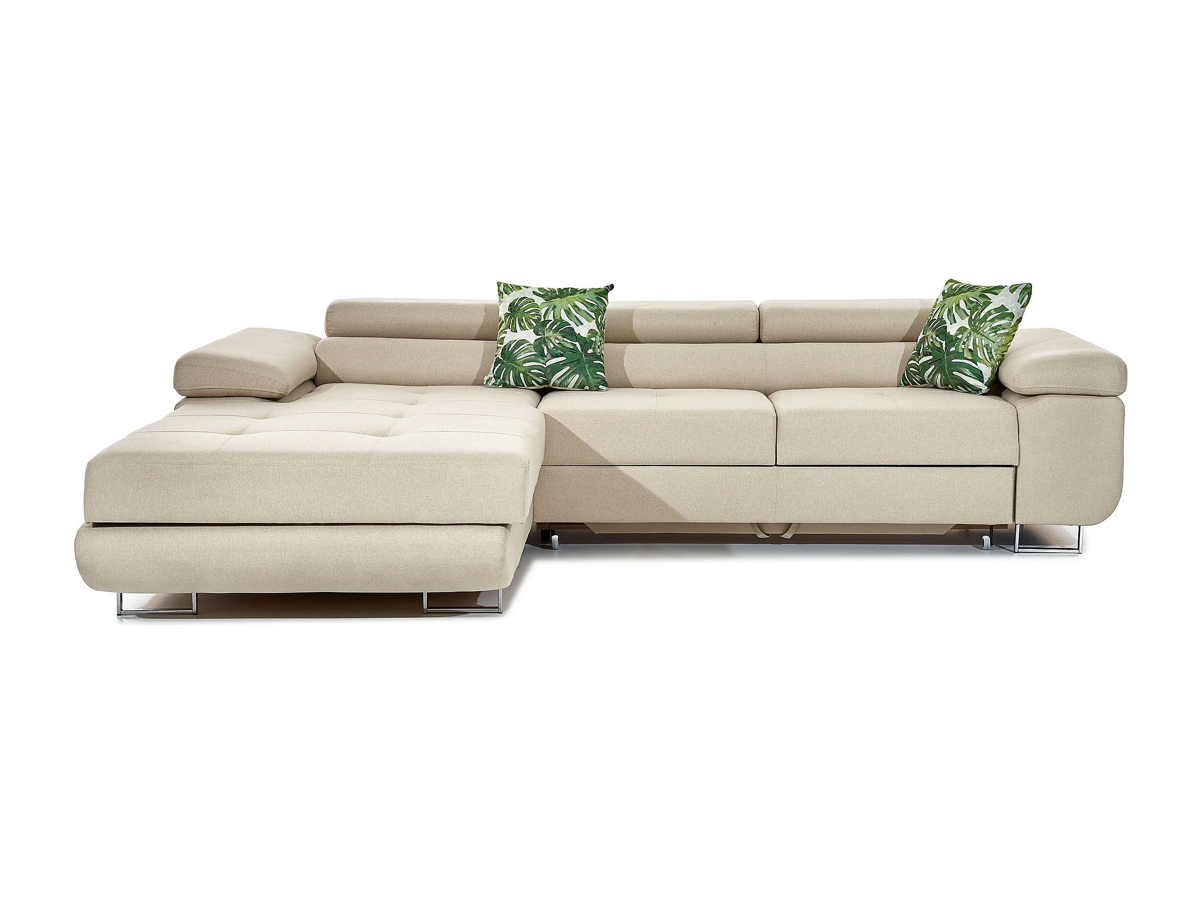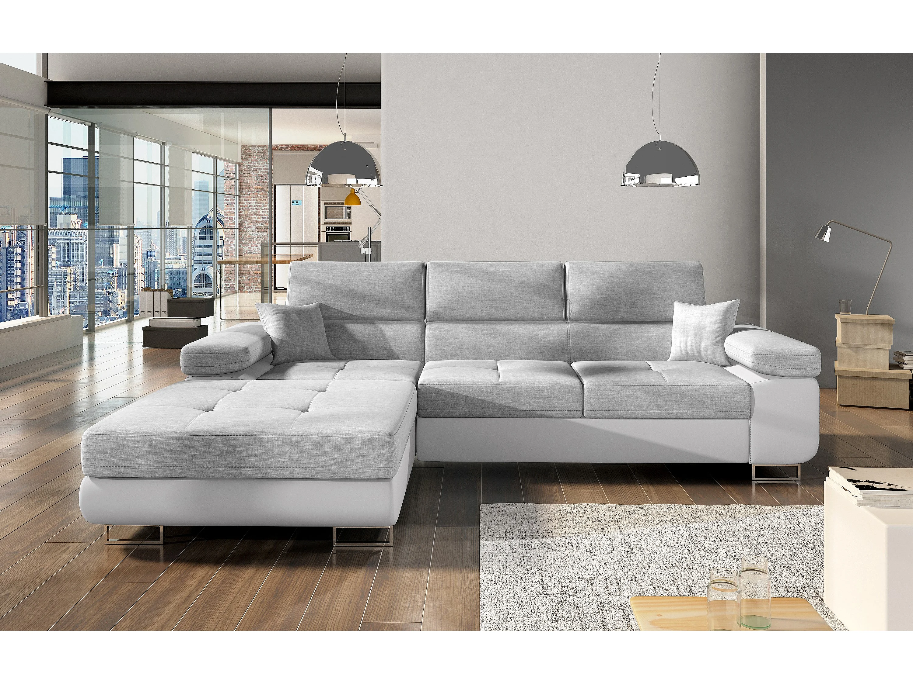 Canapé d'angle convertible appuis-tête réglables KALIZO - Coffre et pieds acier chromé-Blanc/Gris clair-angle gauche