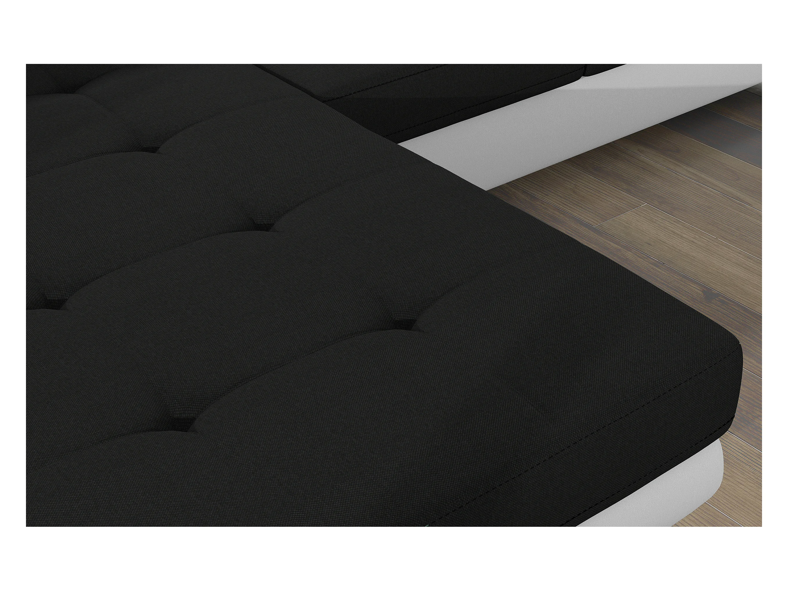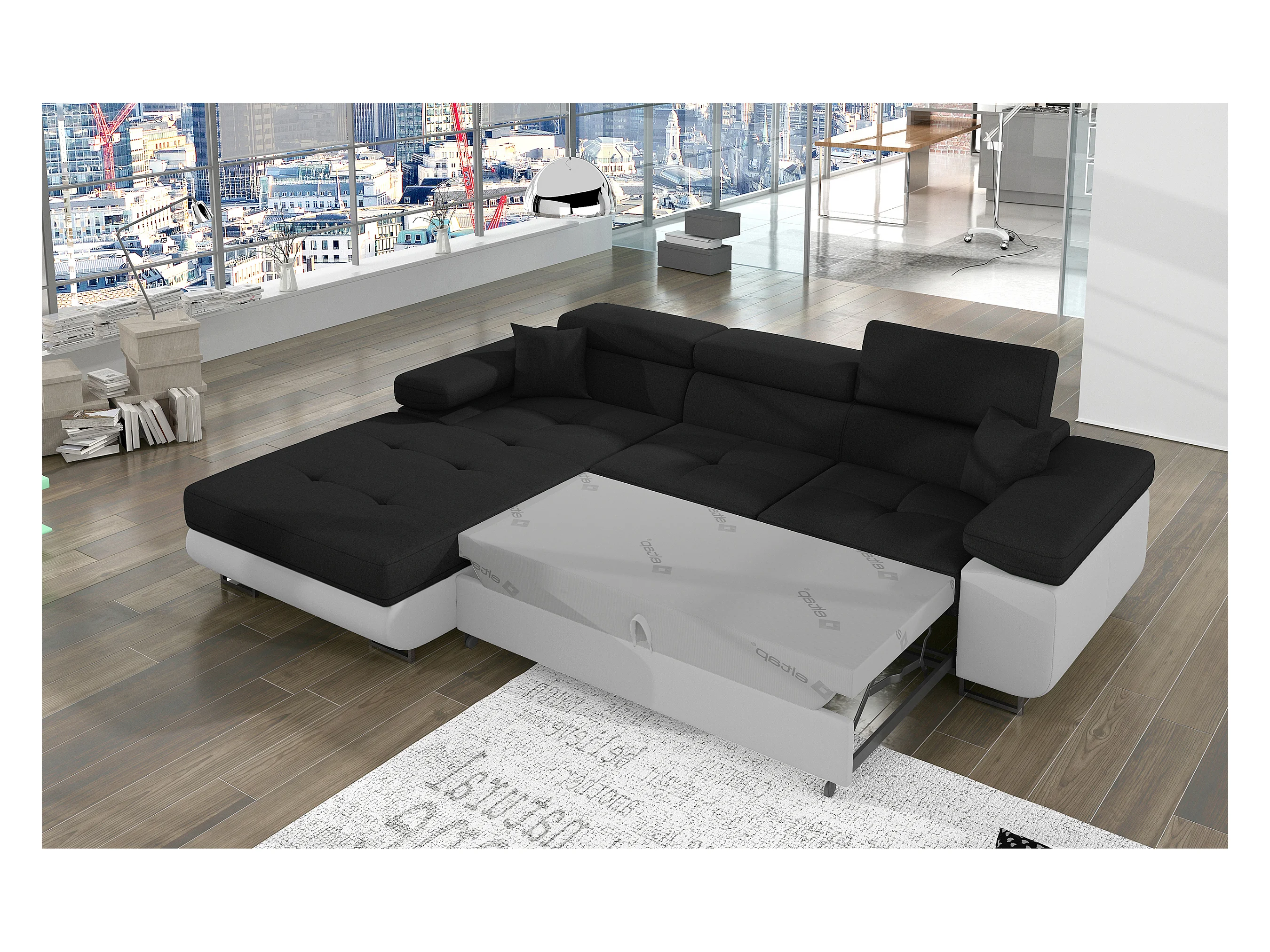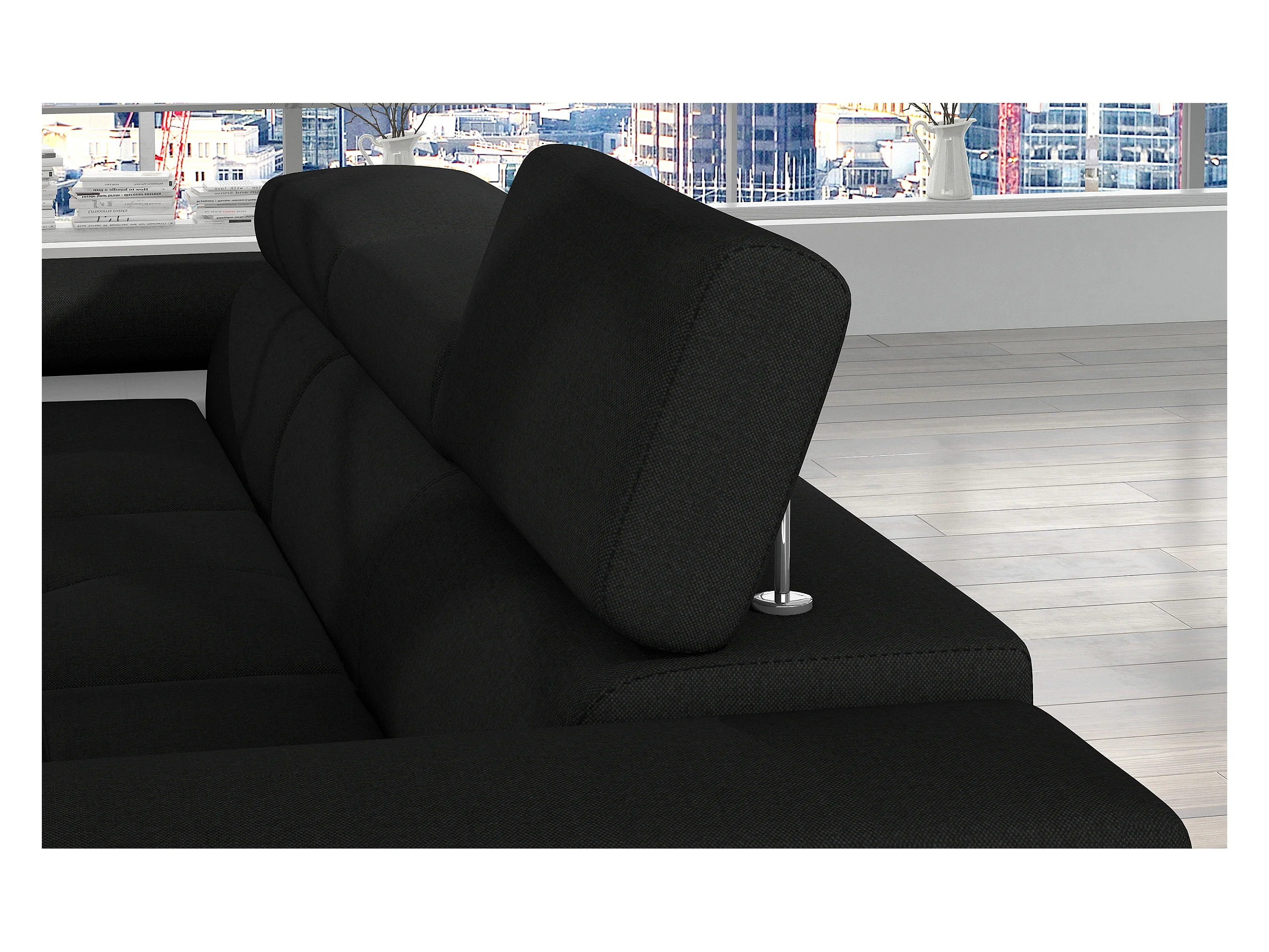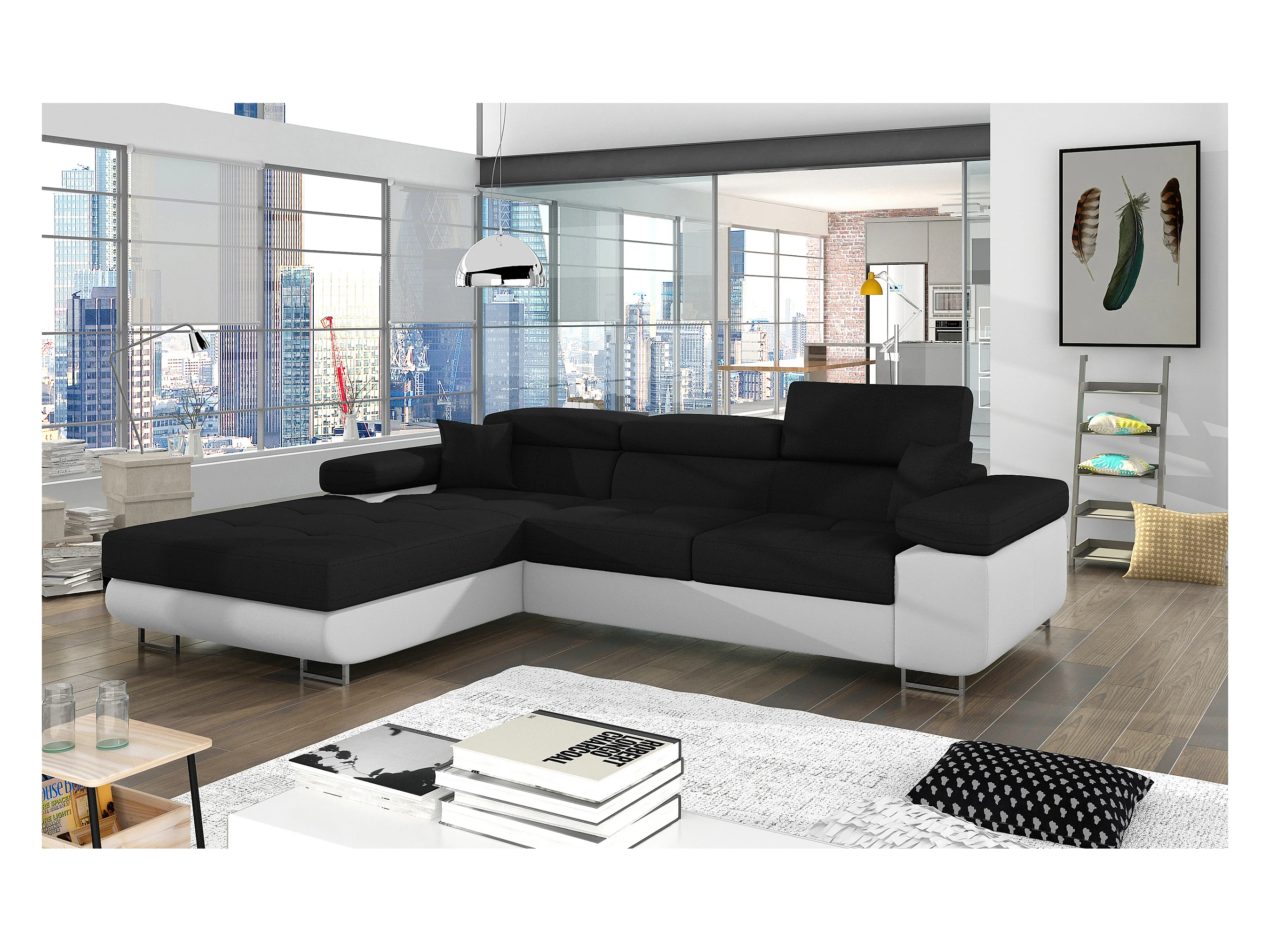 Canapé d'angle convertible Bi matière appuis-tête réglables KALIZO - Coffre et pieds acier chromé-Blanc/Noir-angle gauche