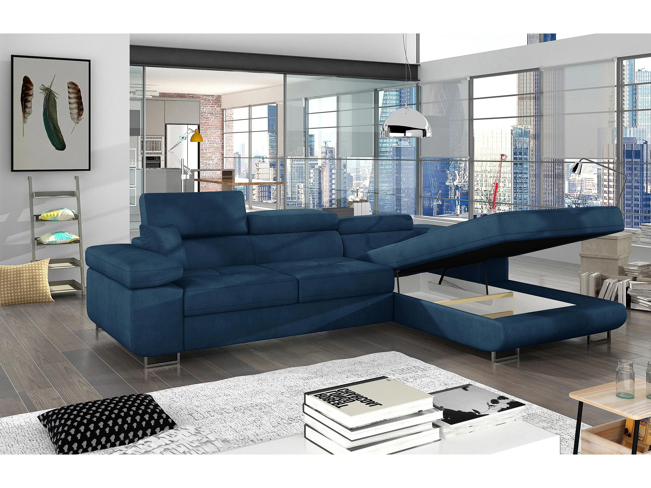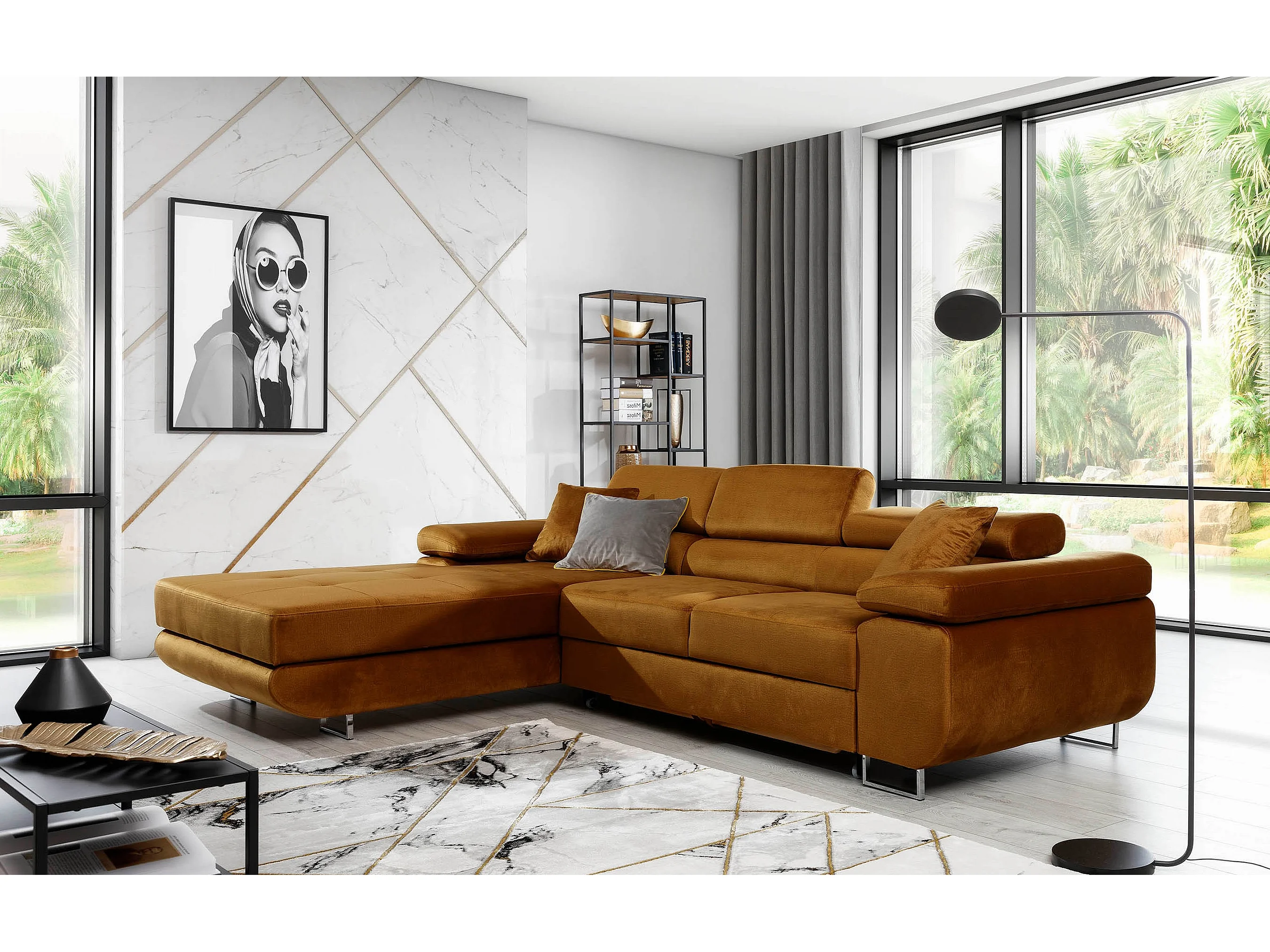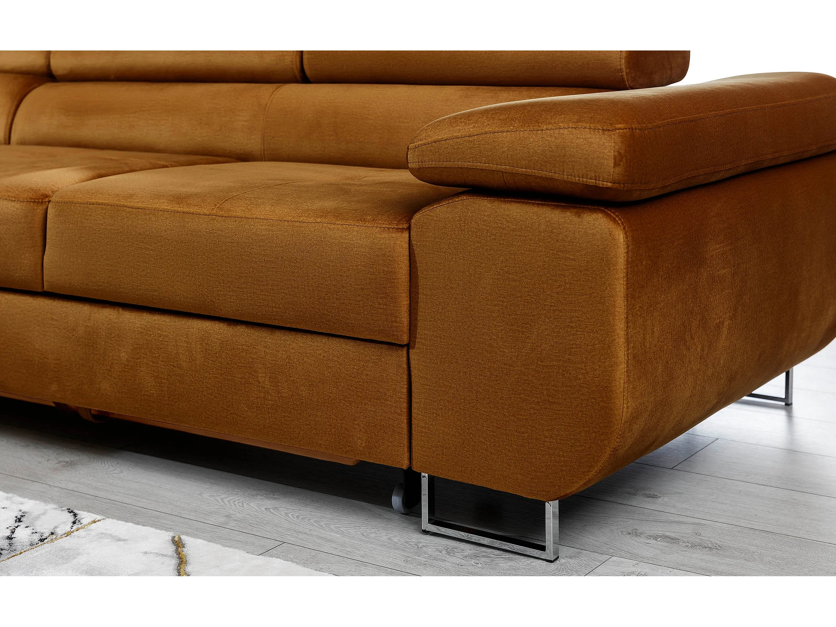 Canapé d'angle convertible velours appuis-tête réglables KALIZO - Coffre et pieds acier chromé-Marron clair-angle gauche