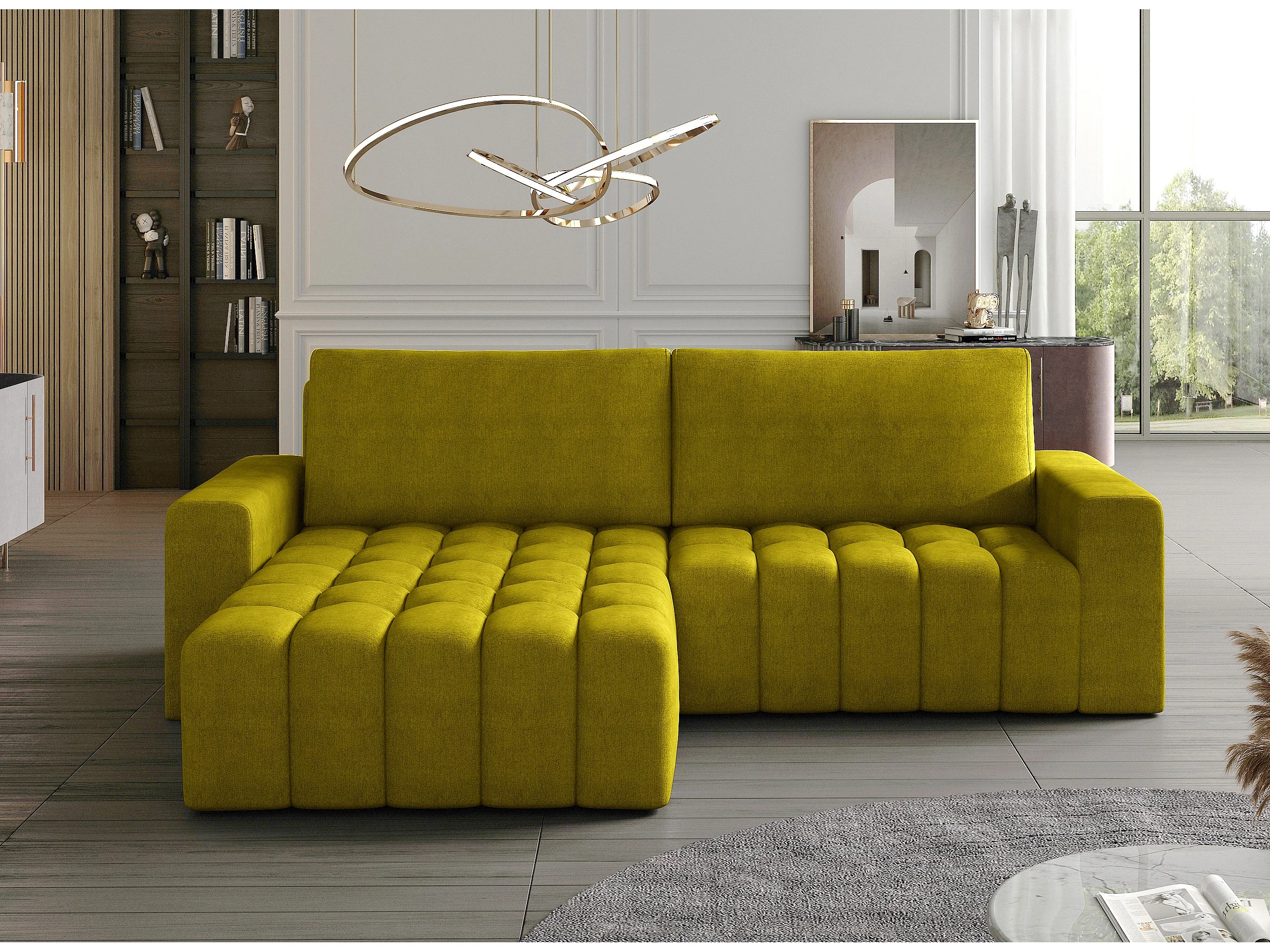 Canapé d’angle velours capitonné BOZEN – Convertible et rangement-Jaune moutarde-angle gauche