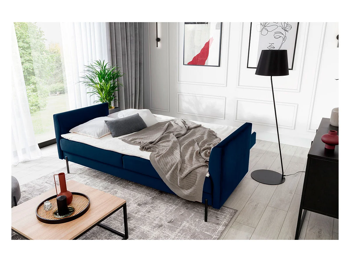 Canapé convertible en velours ROBBY – Rangement et pieds métal noir-Bleu
