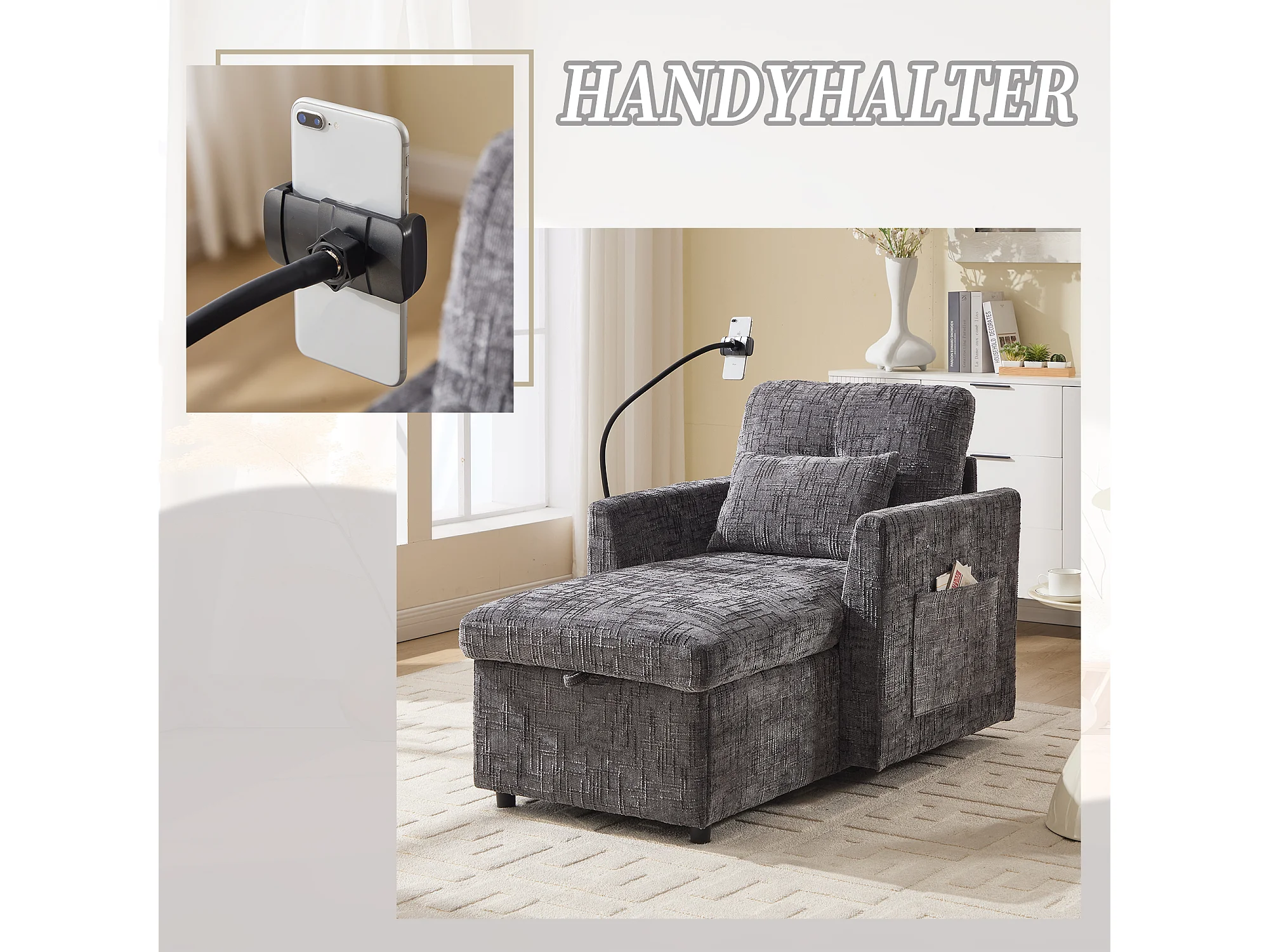Canapé fixe - Chaiselongue grise en tissu chenille - avec support pour téléphone et rangement intégré - Idéal pour salon, bureau ou chambre