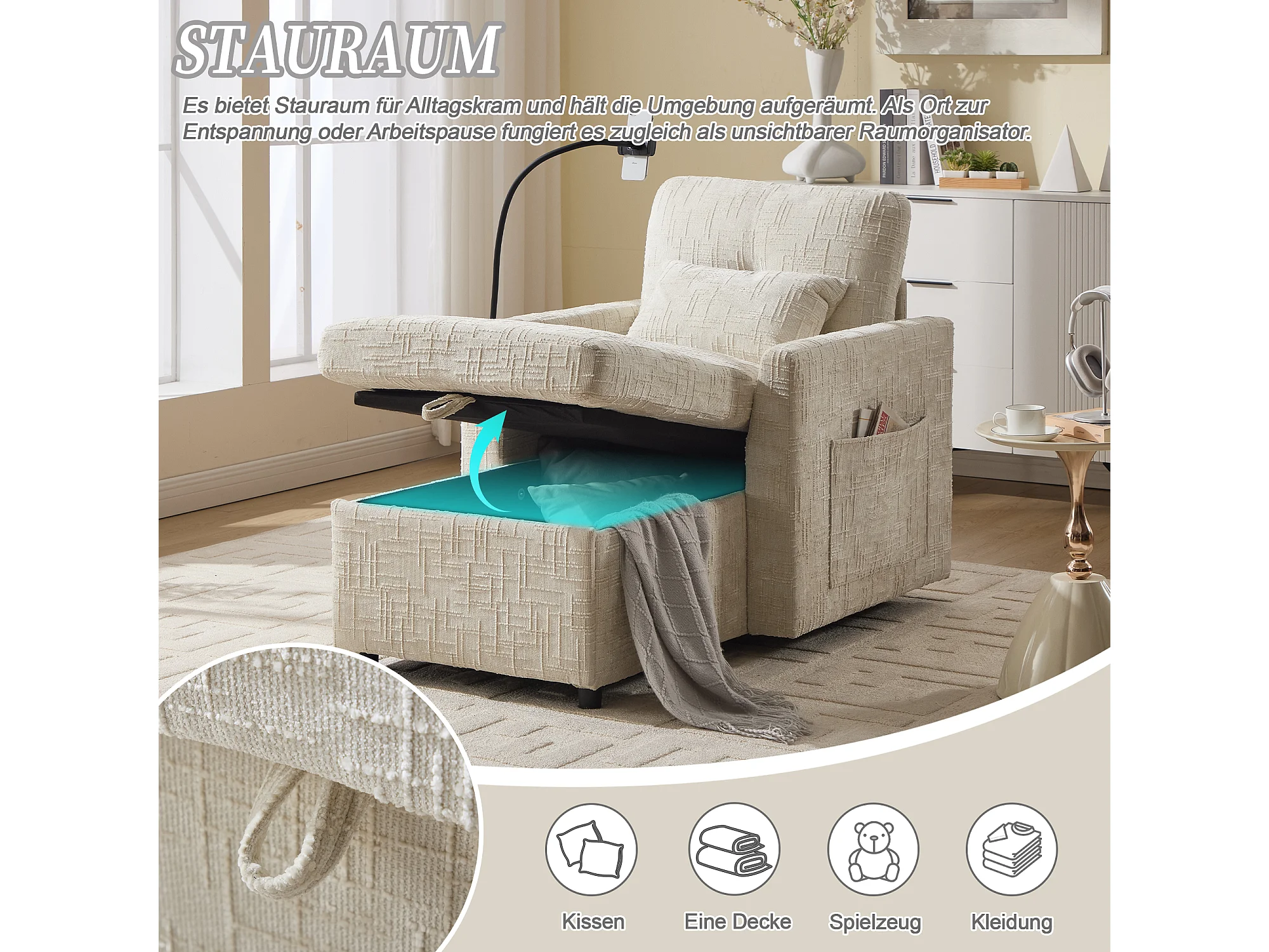 Canapé fixe - Chaiselongue beige en tissu chenille - avec support pour téléphone et rangement intégré - Idéal pour salon, bureau ou chambre