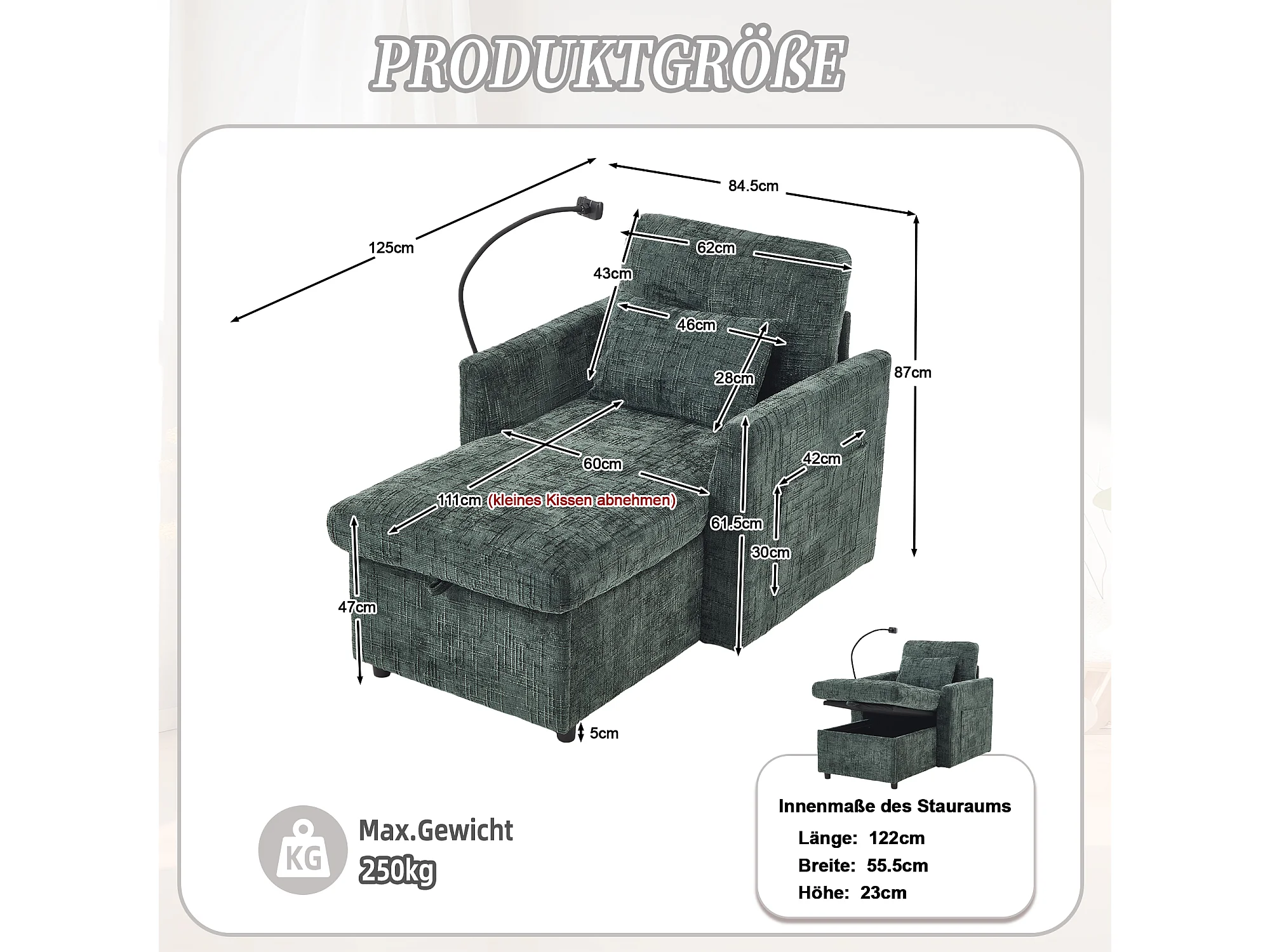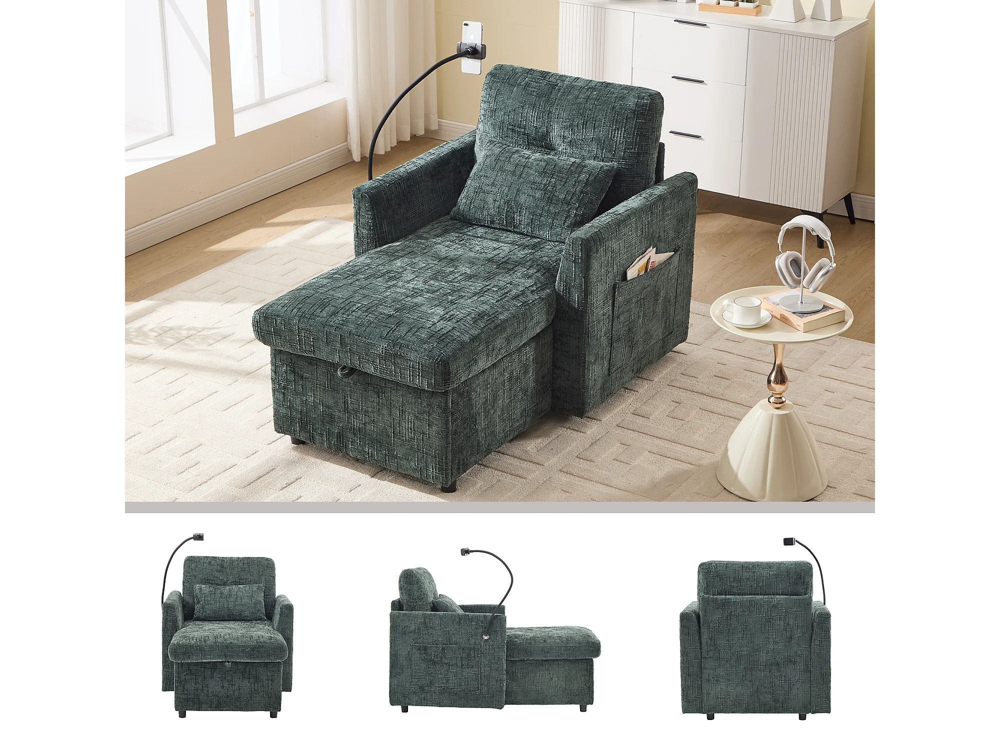Canapé fixe - Chaiselogue verte en tissu chenille - avec support pour téléphone et rangement intégré - Idéal pour salon, bureau ou chambre