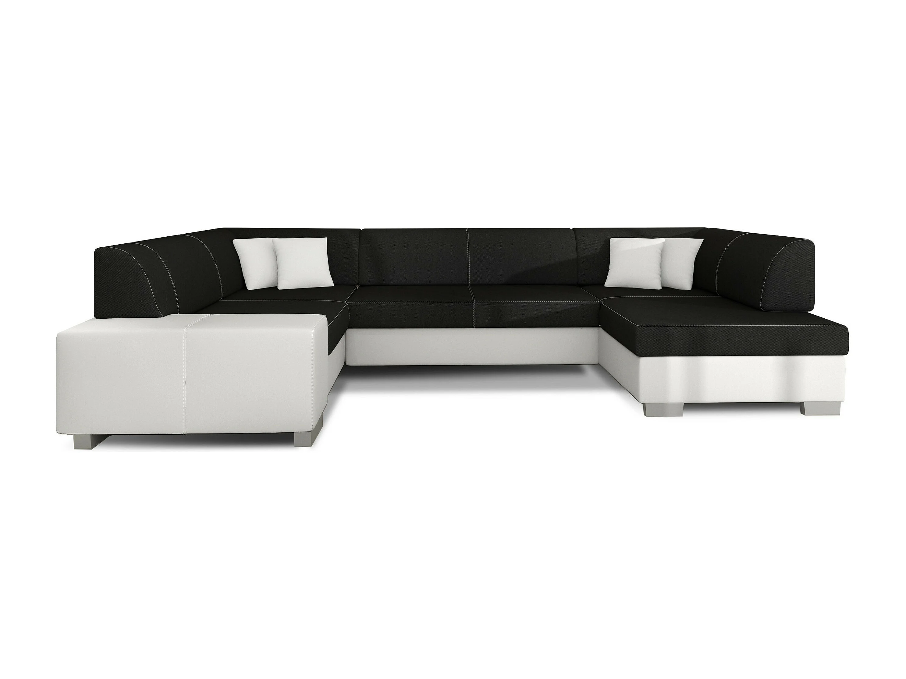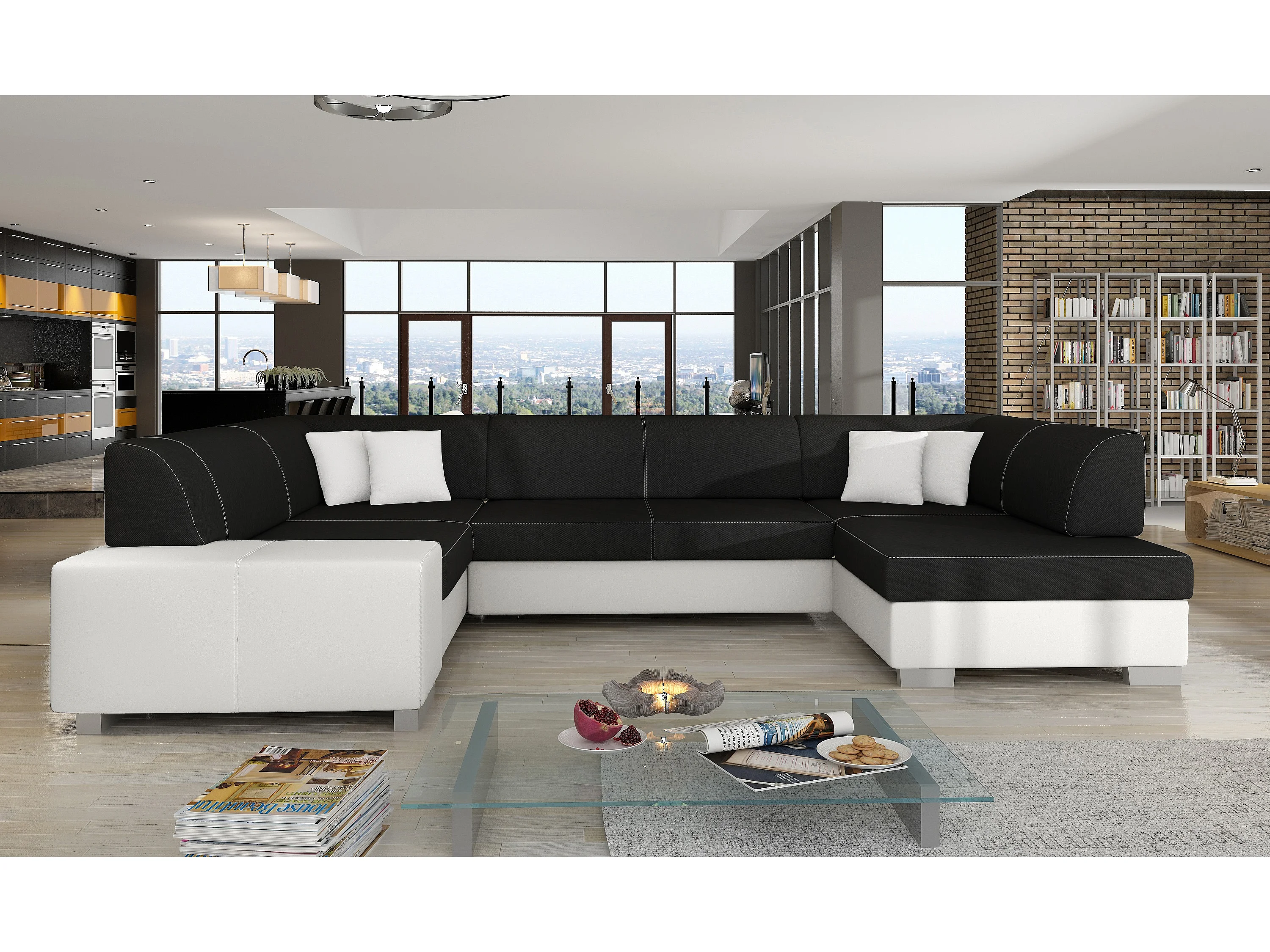 Canapé convertible panoramique bi matières tissu noir et simili cuir blanc avec coffre de rangement Houston 320cm-Coffre de rangement à droite