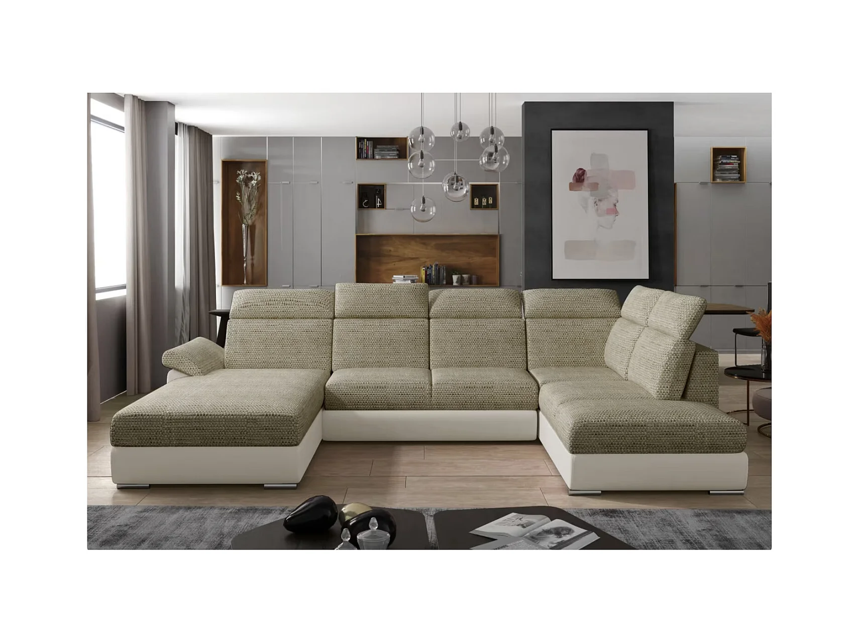 Canapé Convertible Panoramique LEVANO Tissu et Simili Cuir, Têtières-Beige clair/Beige chiné-Coffre à gauche