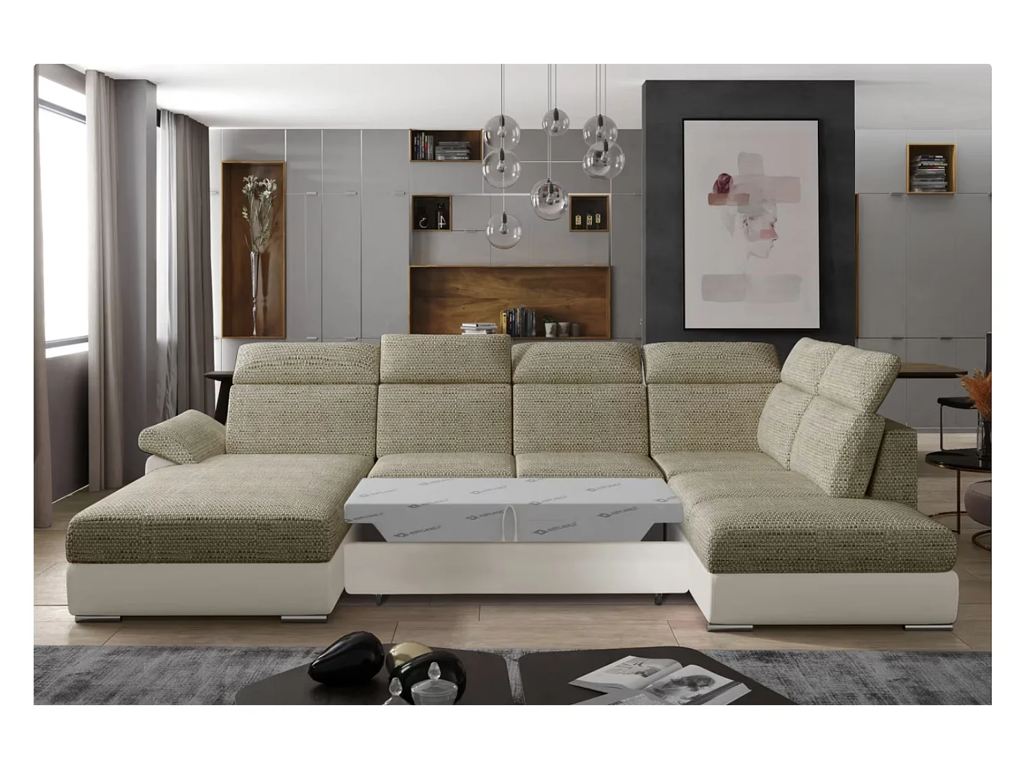 Canapé panoramique convertible LEVANO tissu - Rangement et appuie-têtes réglables-Beige-Coffre à droite