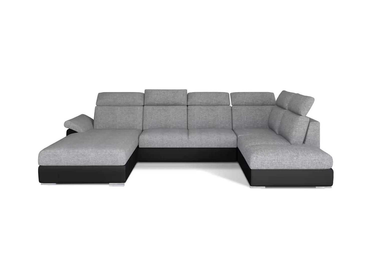 Canapé Convertible Panoramique LEVANO Tissu et Simili Cuir, Têtières-Noir/Gris clair chiné-Coffre à gauche