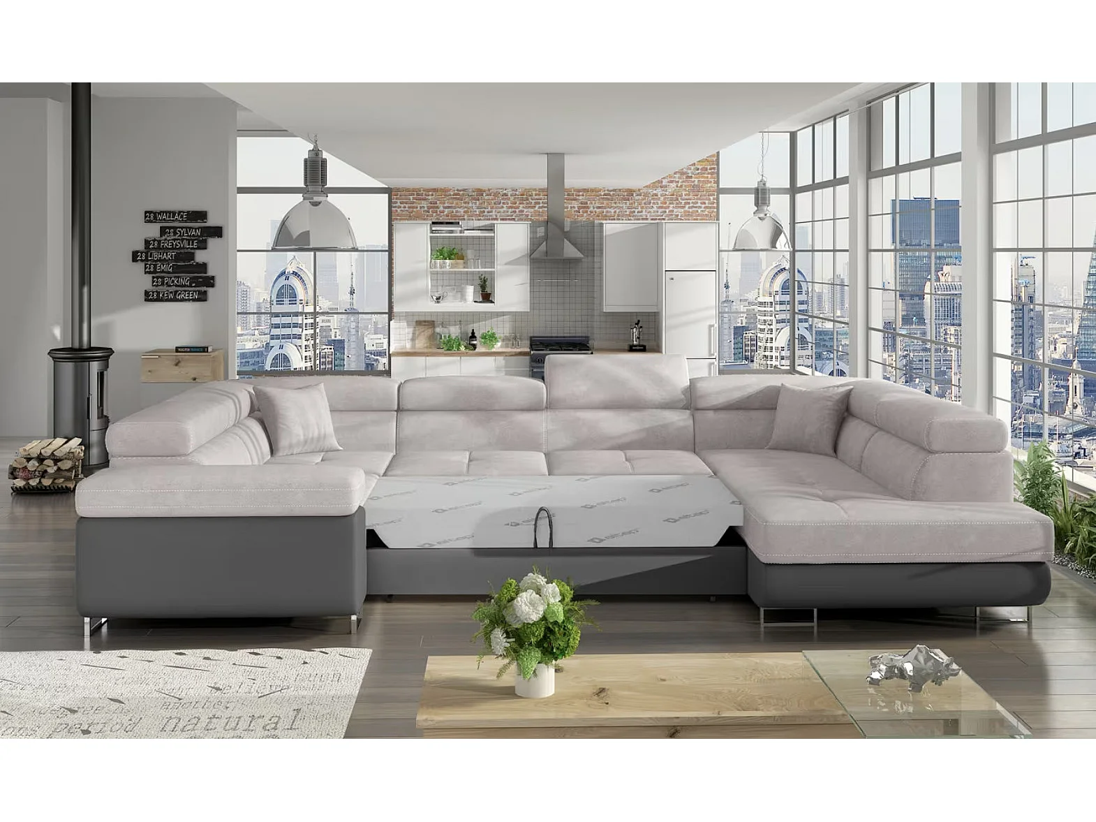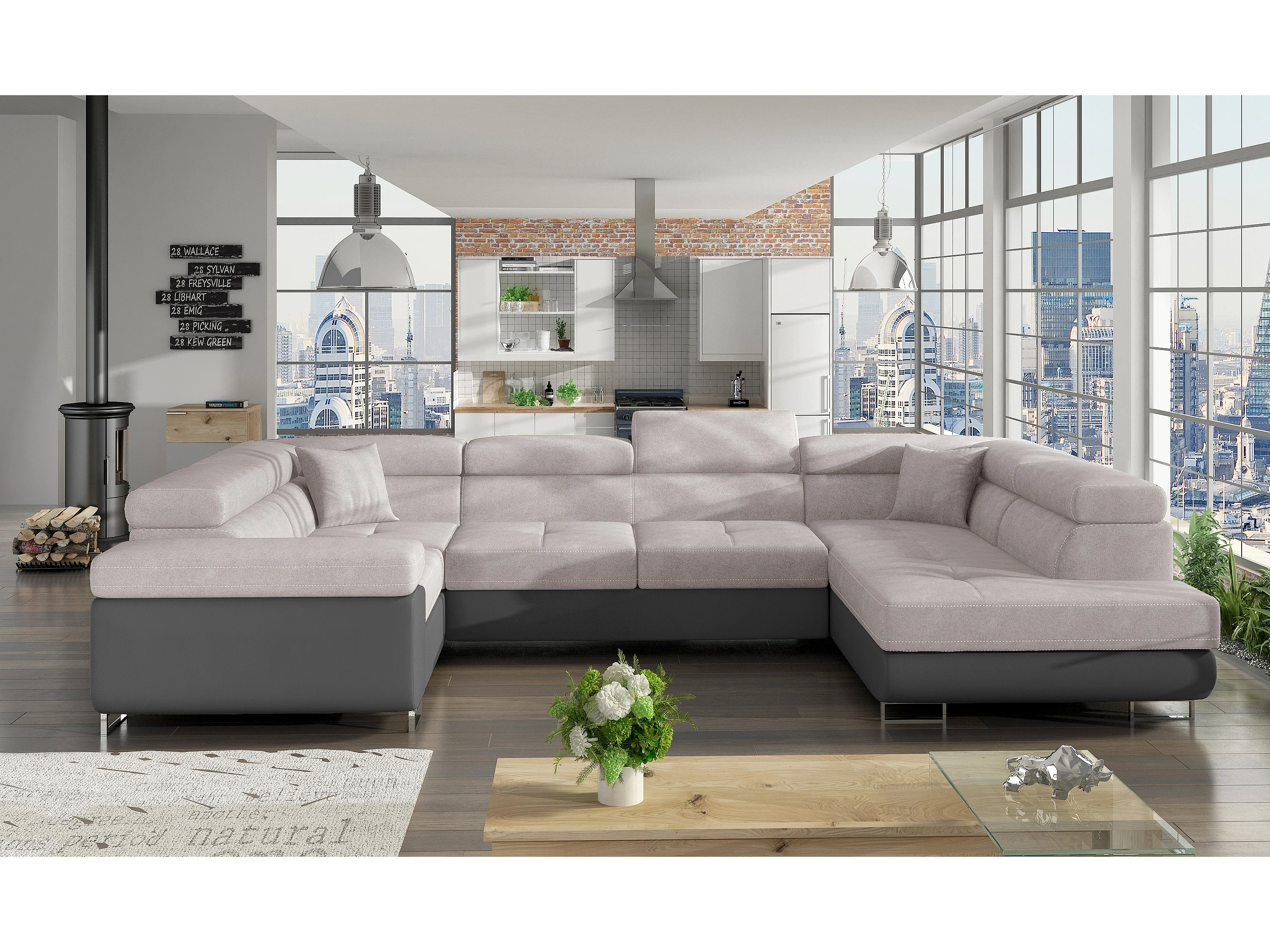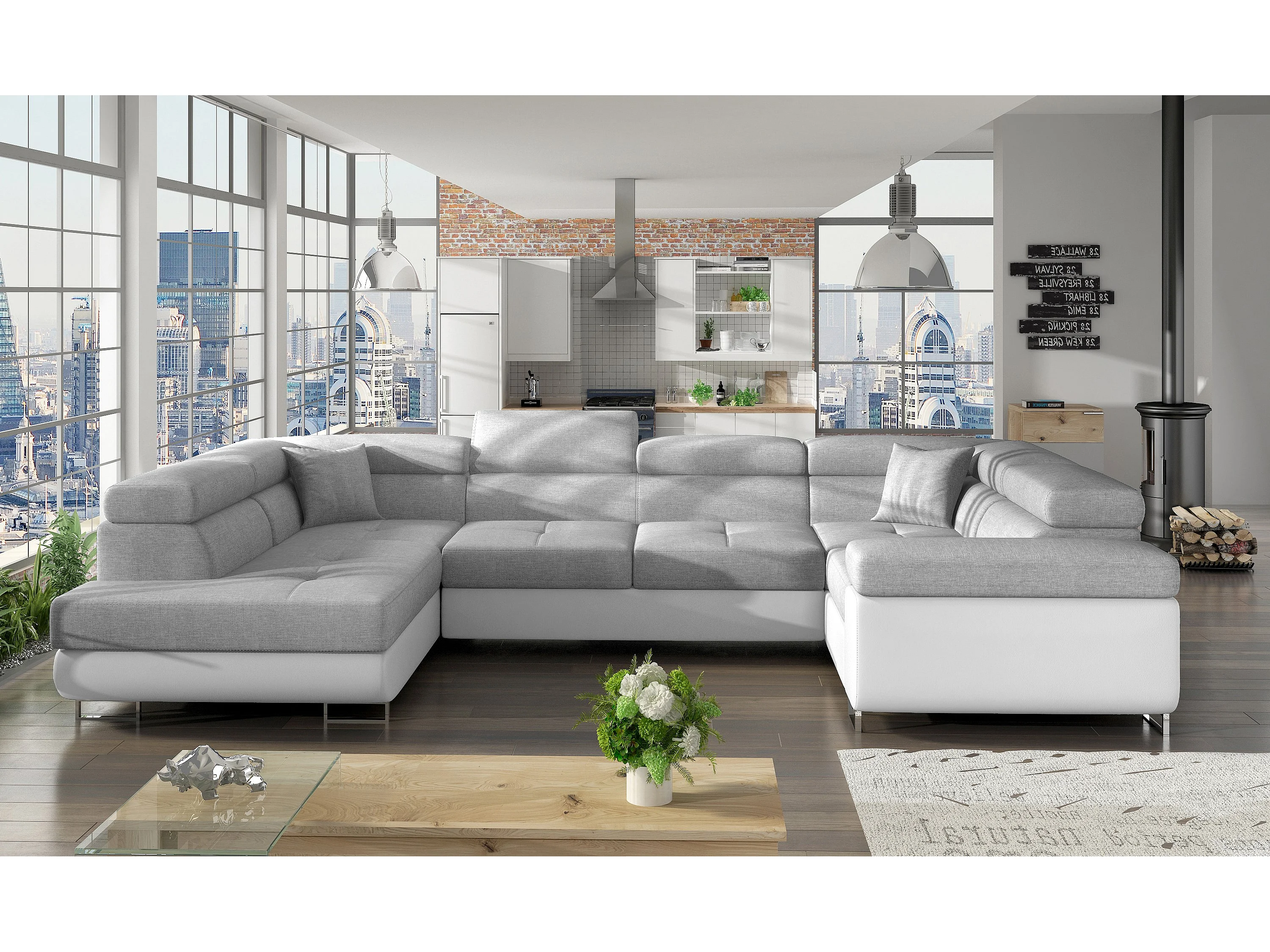 Canapé convertible panoramique TOVY tissu et simili cuir - têtières réglables-Gris/Gris clair-Coffre à gauche