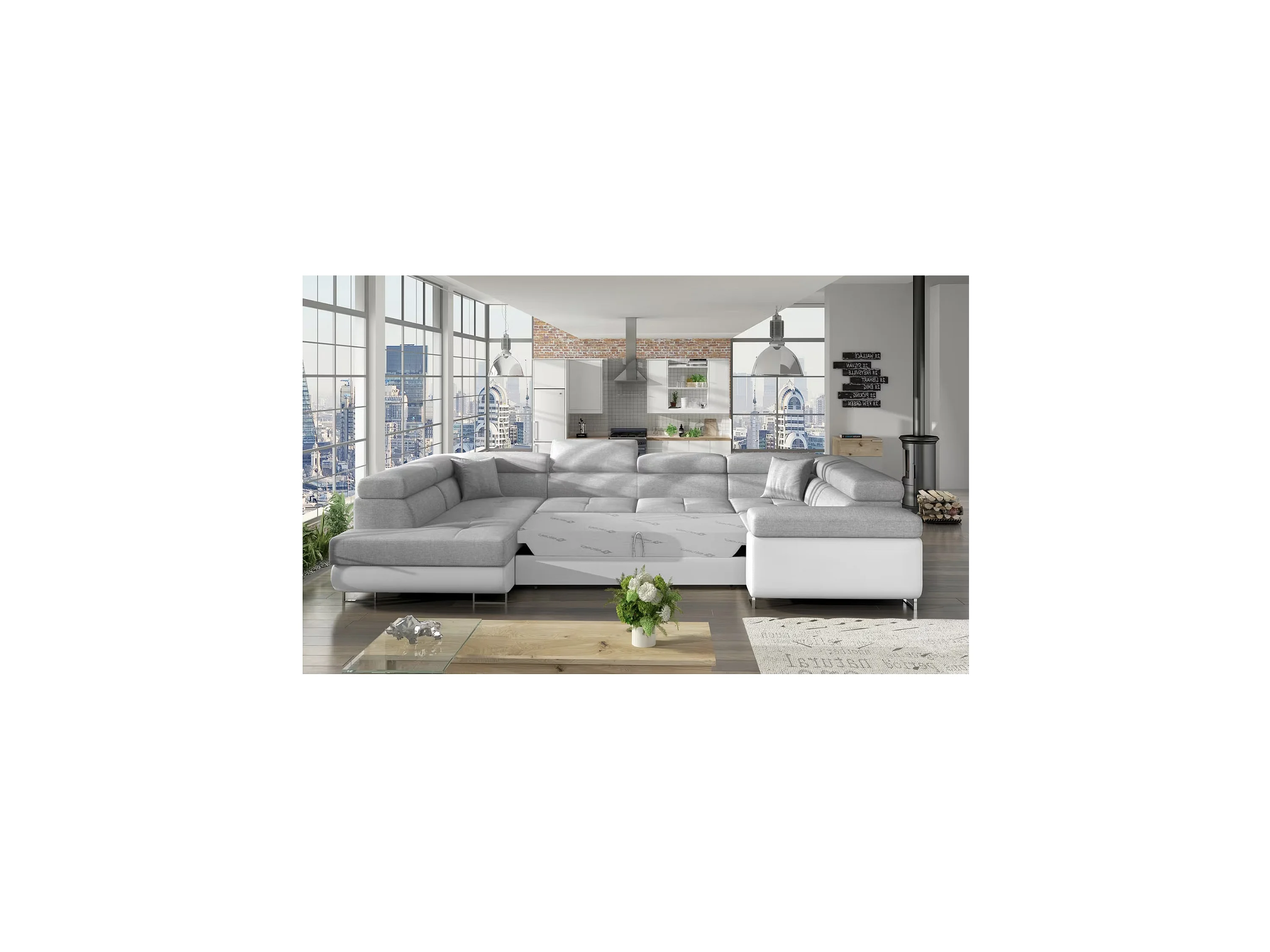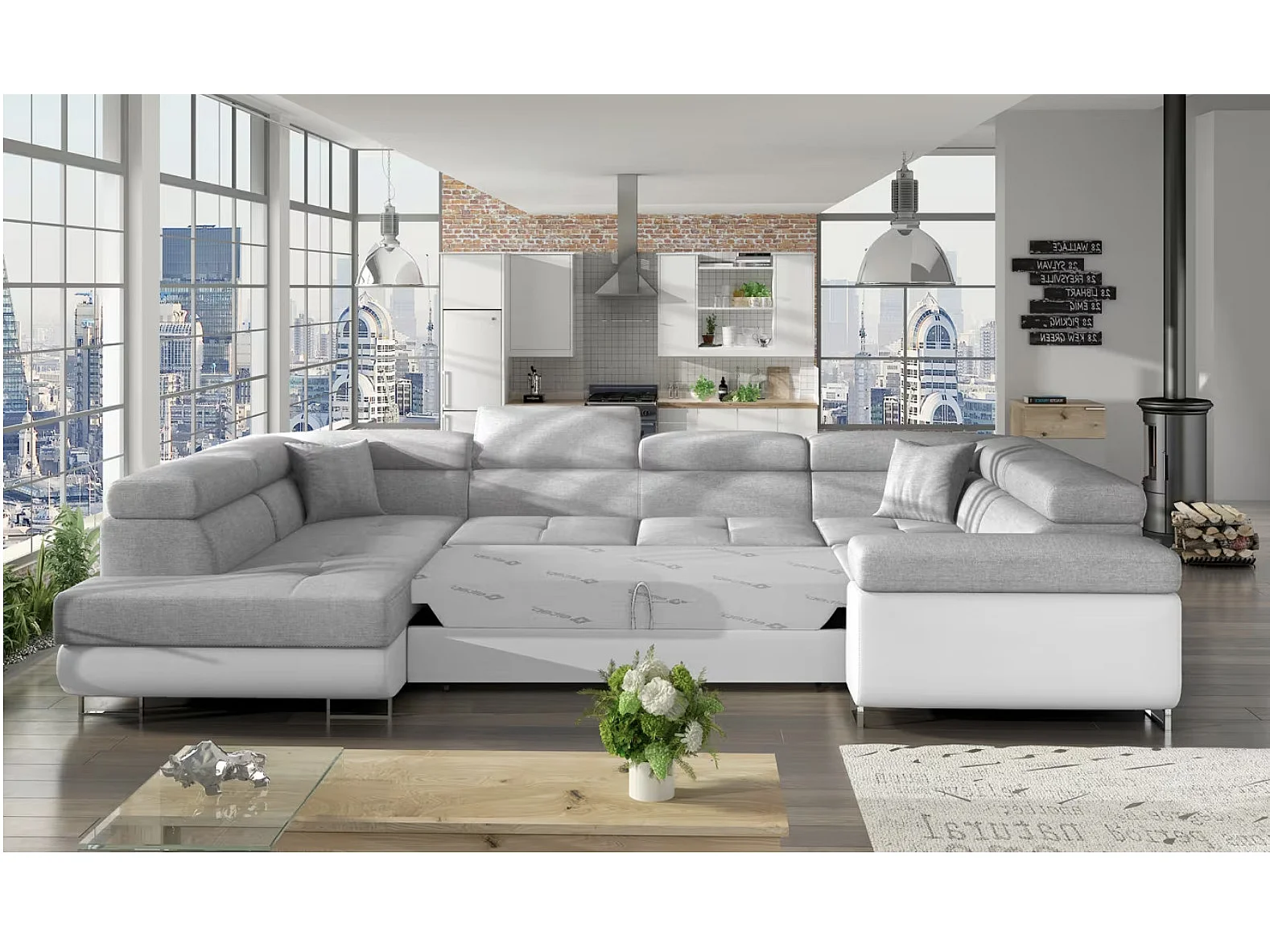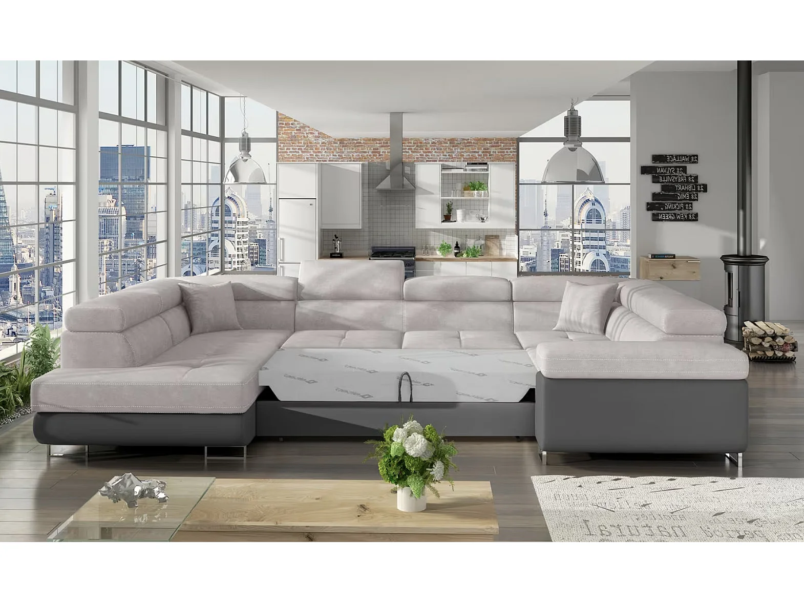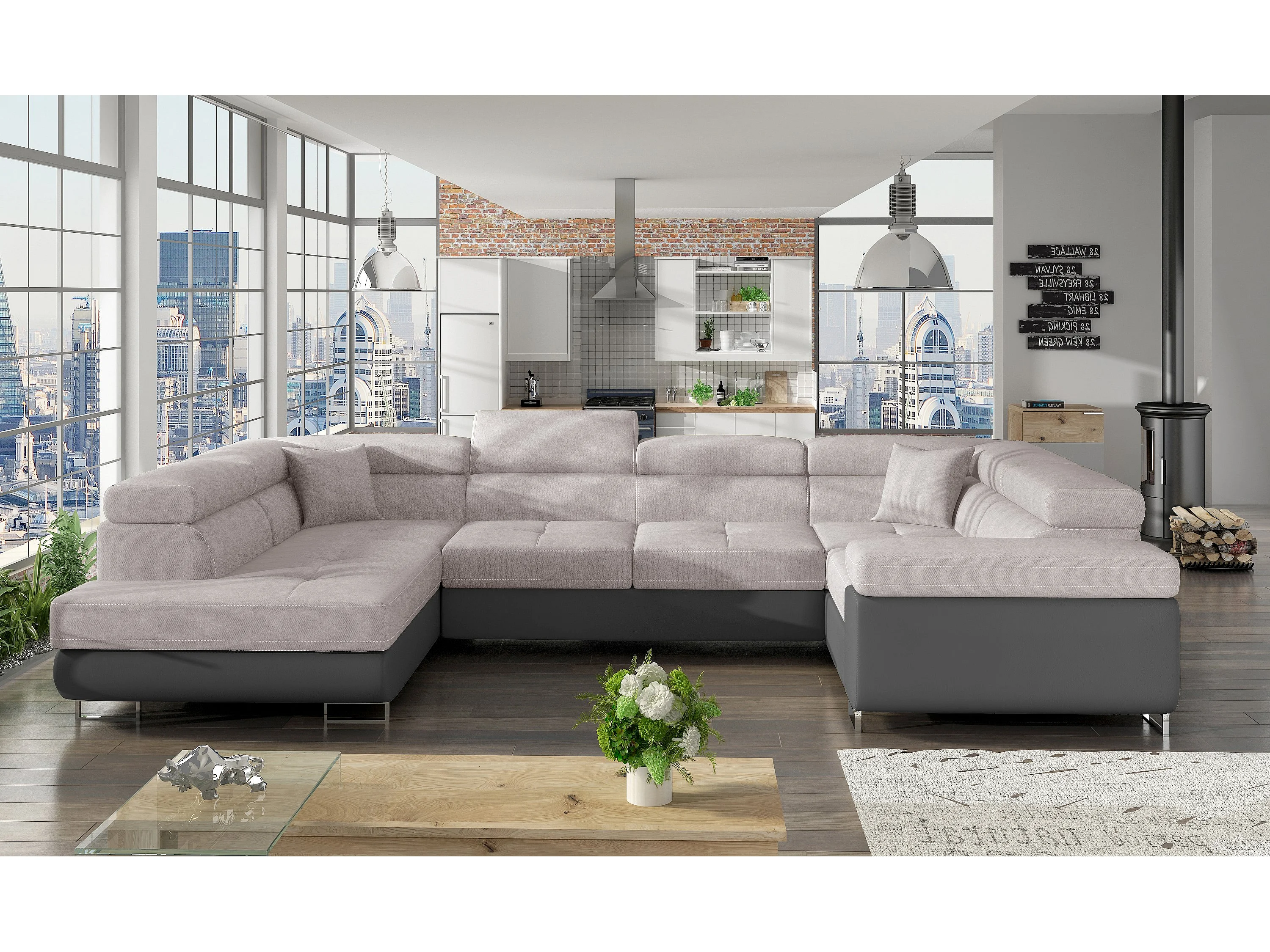Canapé convertible panoramique TOVY tissu et simili cuir - têtières réglables-Gris/Gris clair-Coffre à gauche