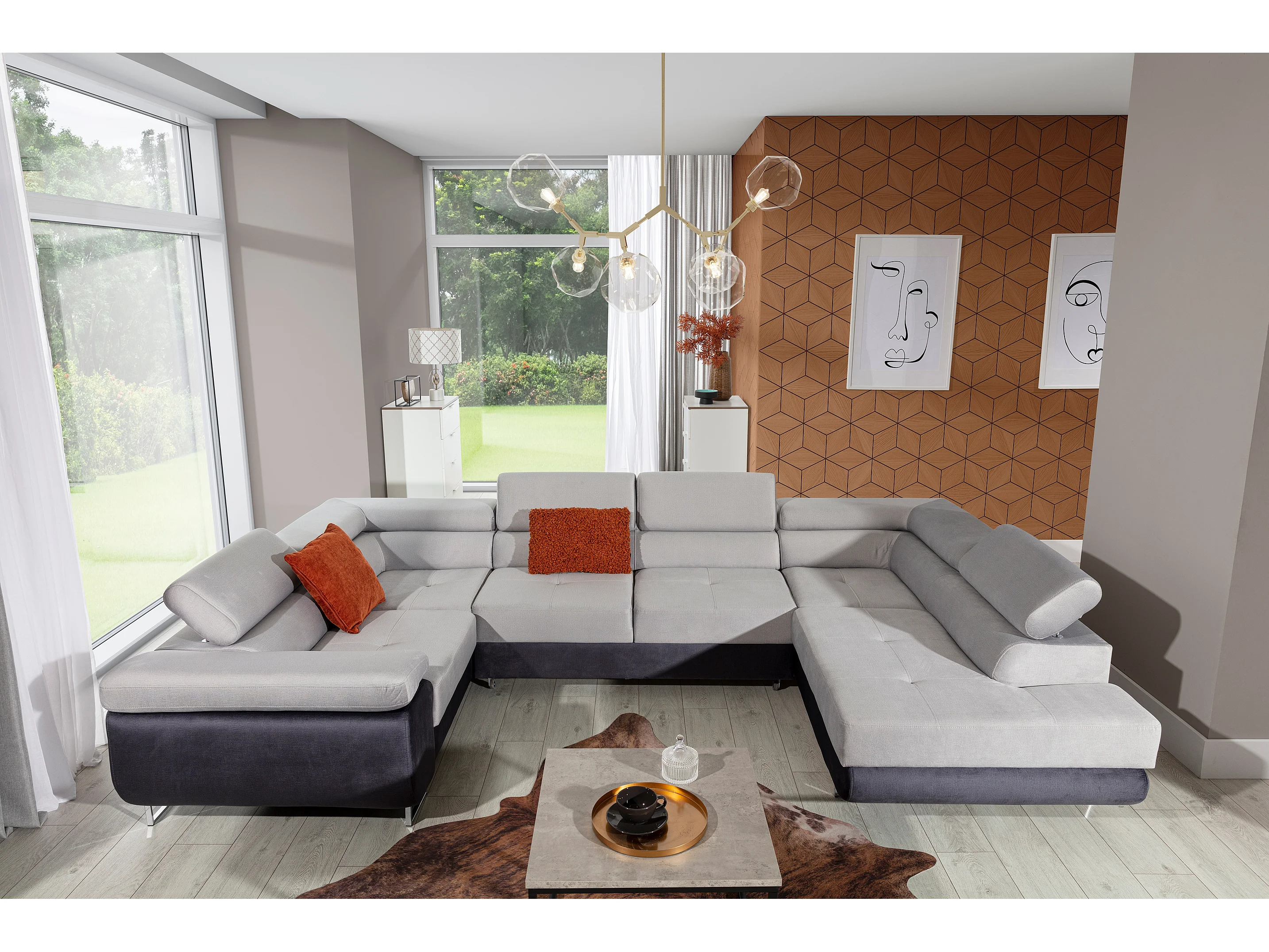 Canapé panoramique convertible KUTTY - Rangement et appuie-têtes réglables-Gris/Gris foncé-Coffre à droite