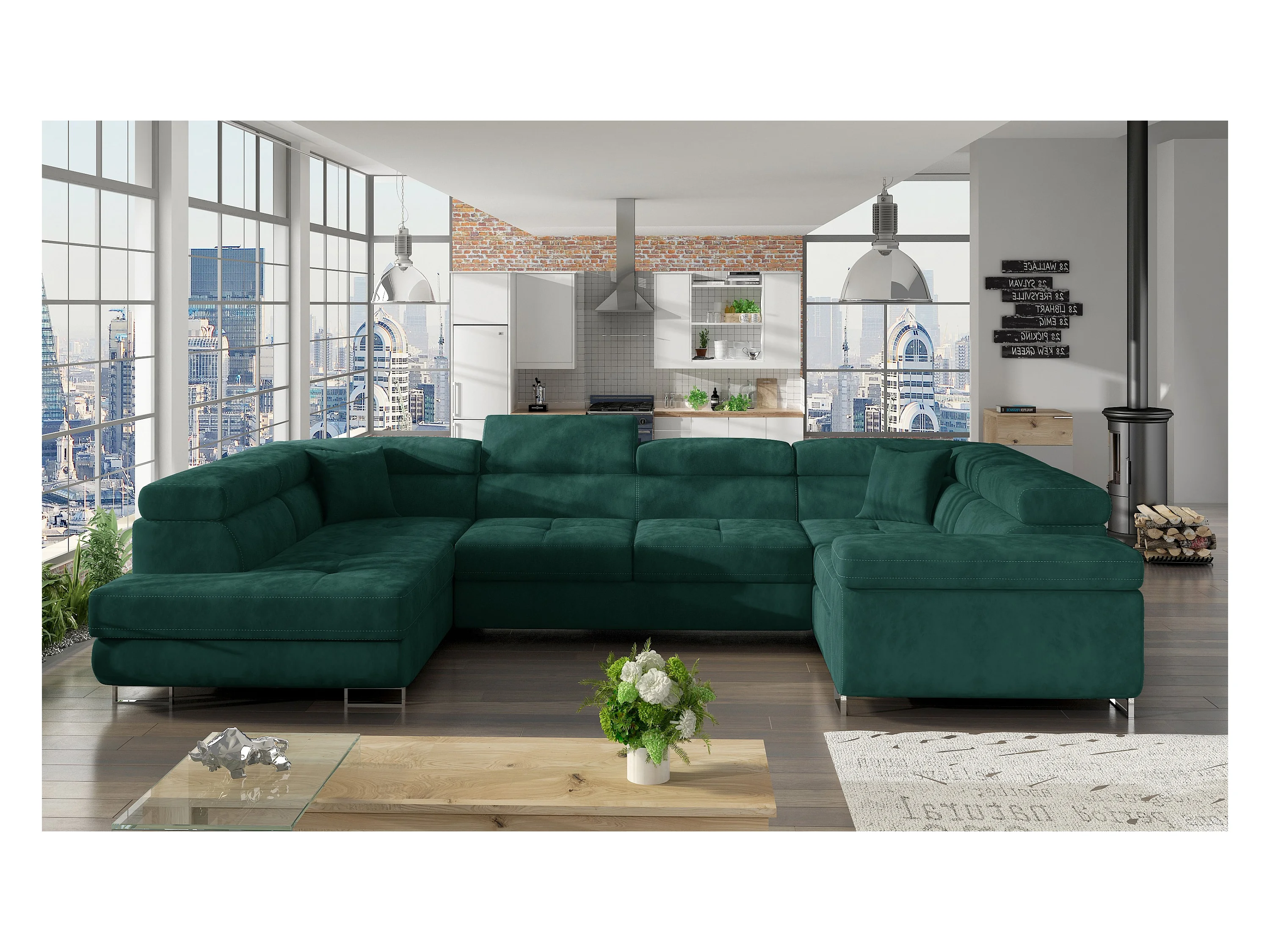 Canapé panoramique convertible tissu vert emeraude avec coffre de rangement Louve 340cm-Coffre de rangement à gauche