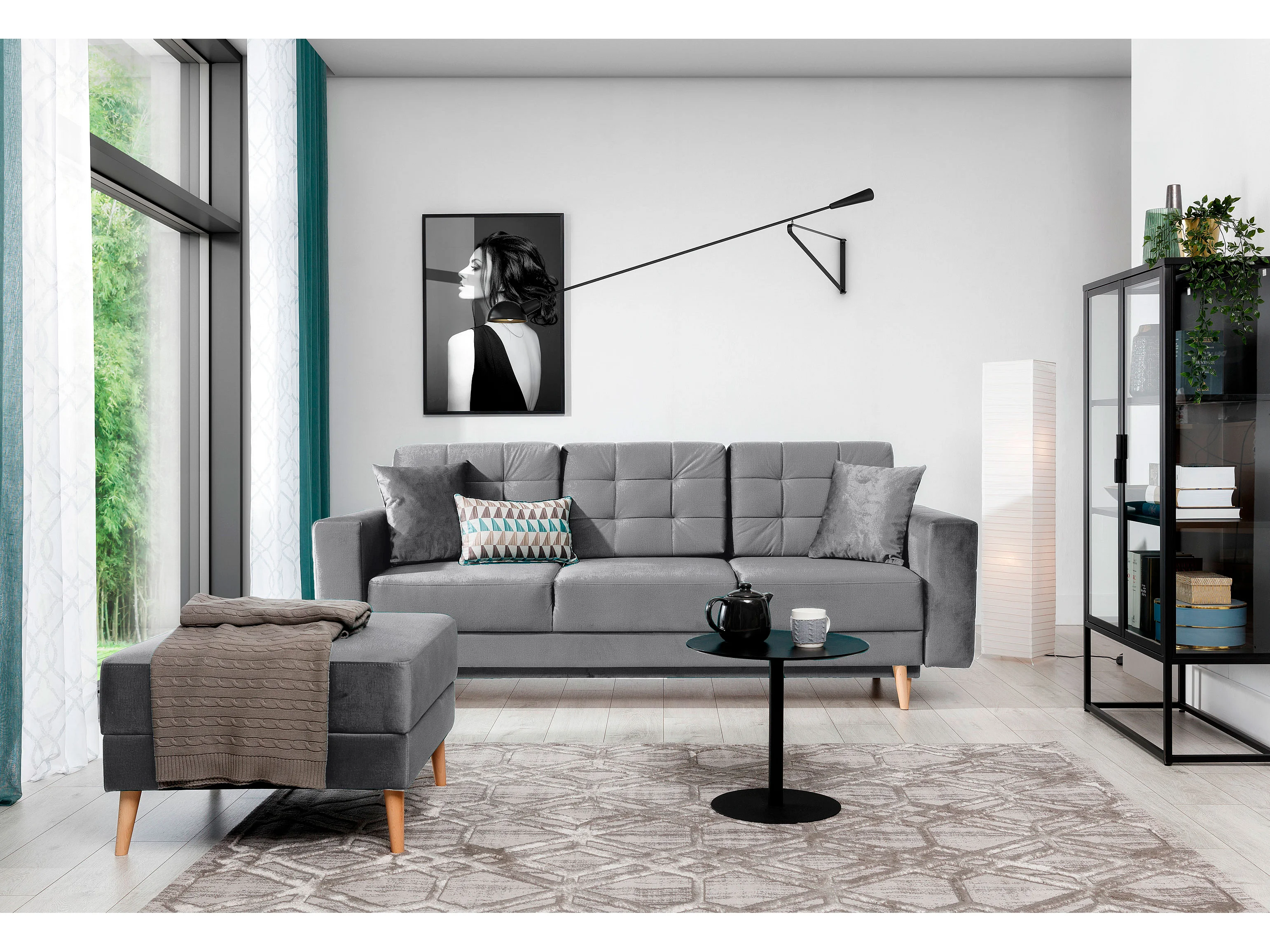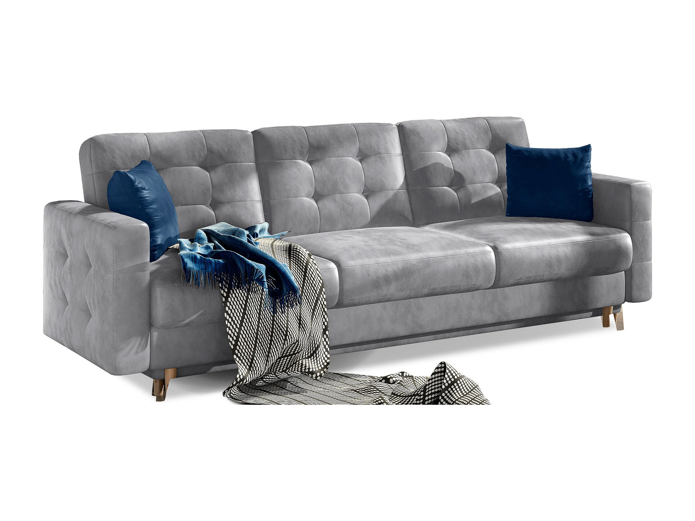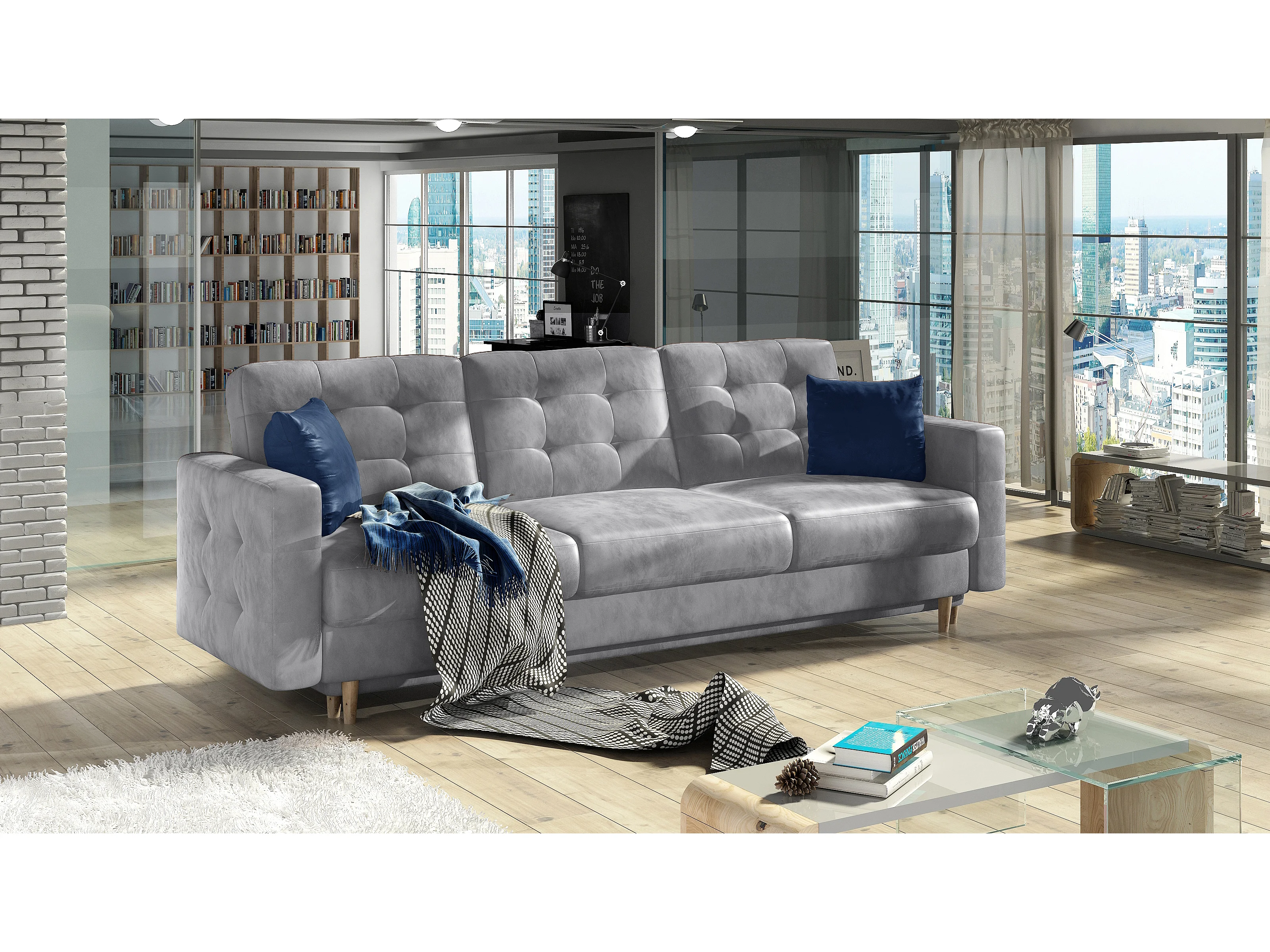 Canapé convertible 3 places velours gris souris capitonné et pieds bois noir Bizza 220cm