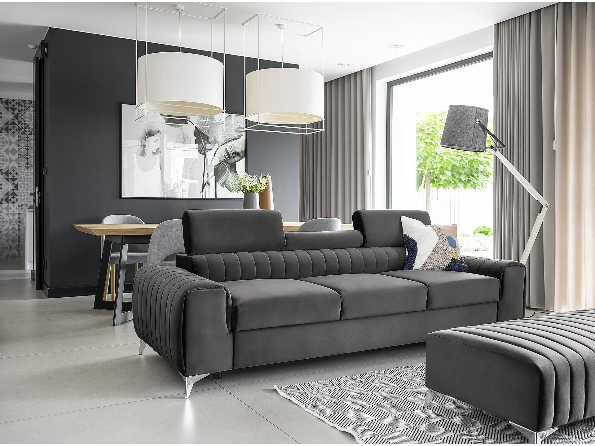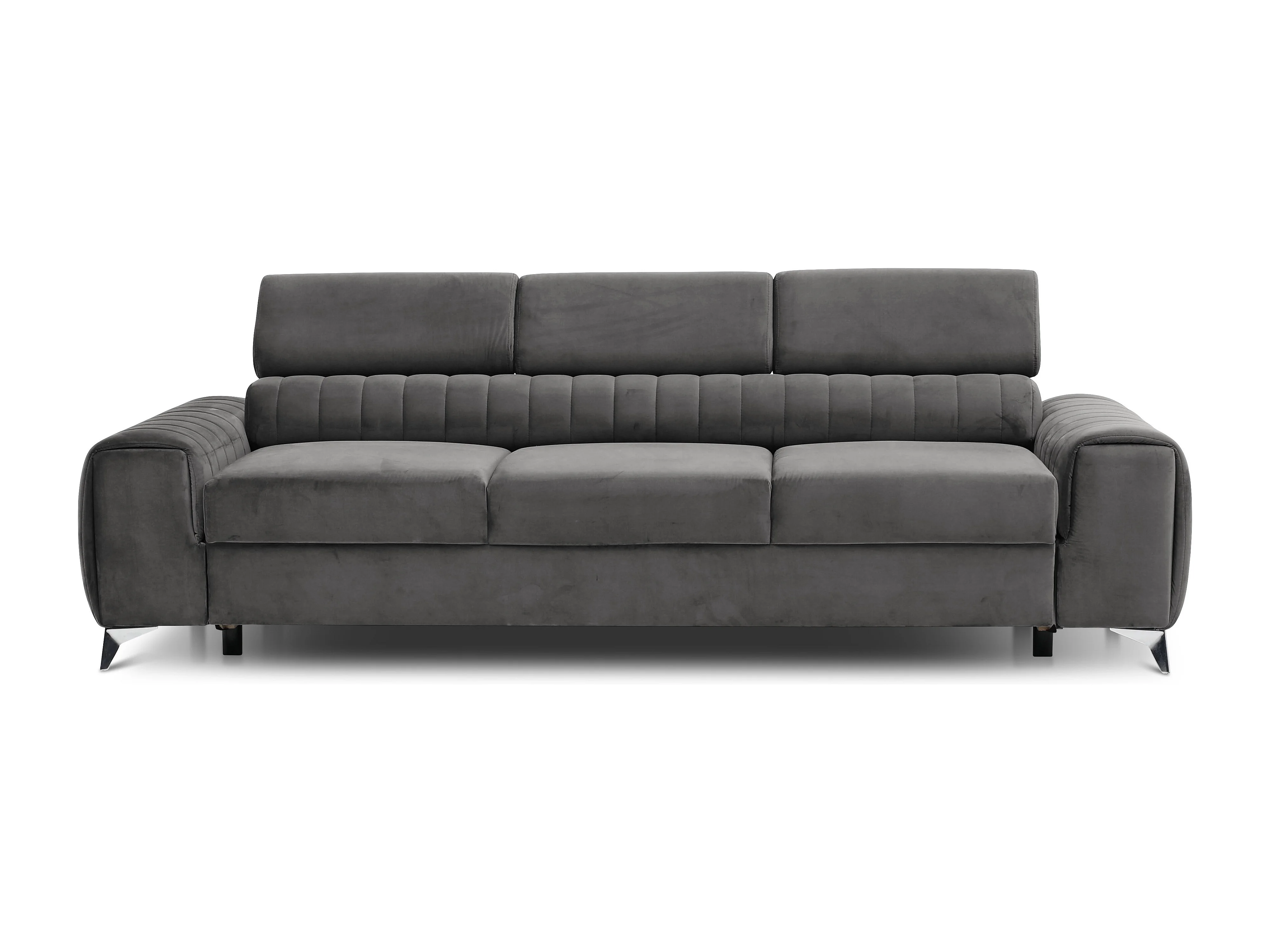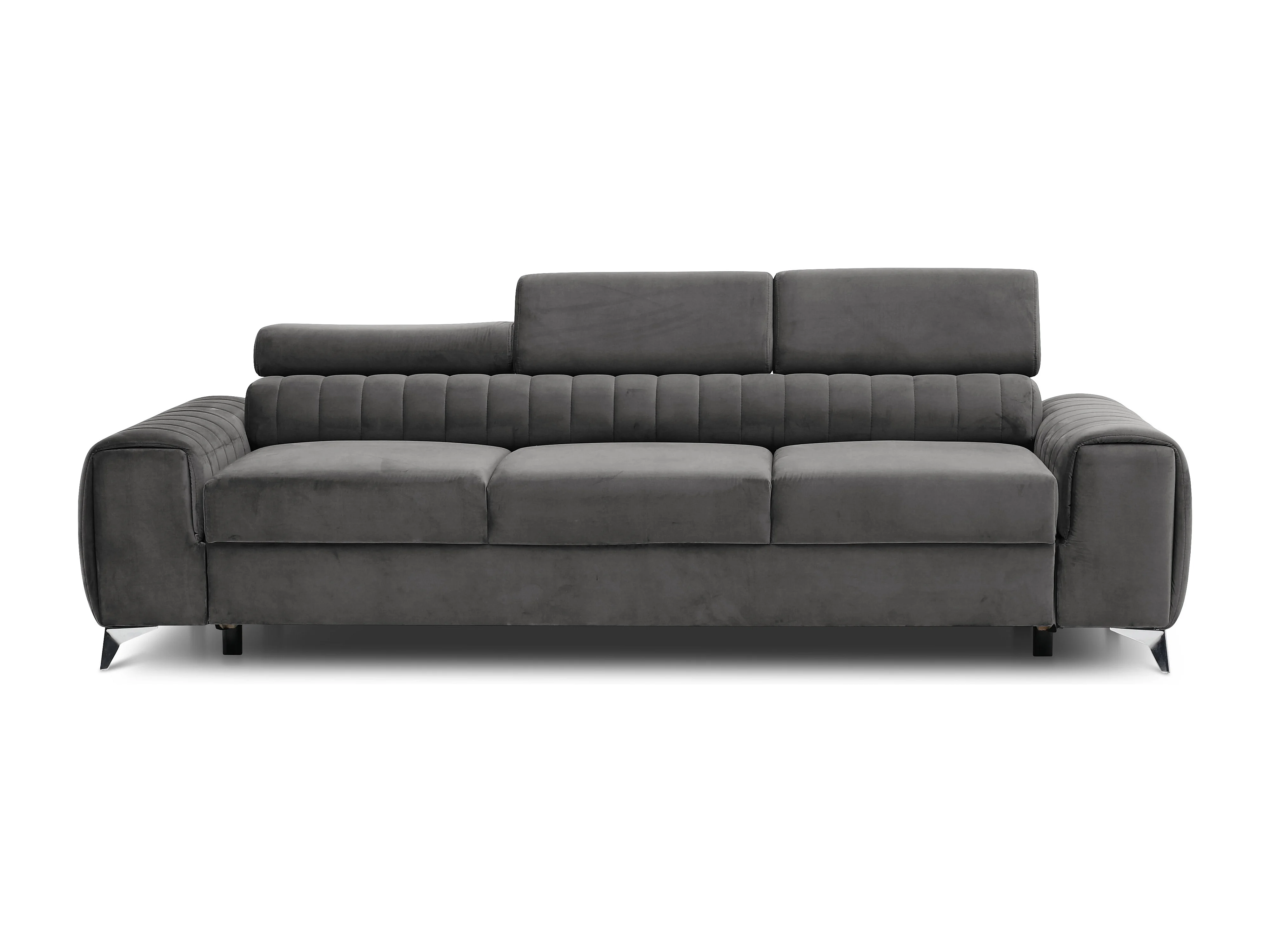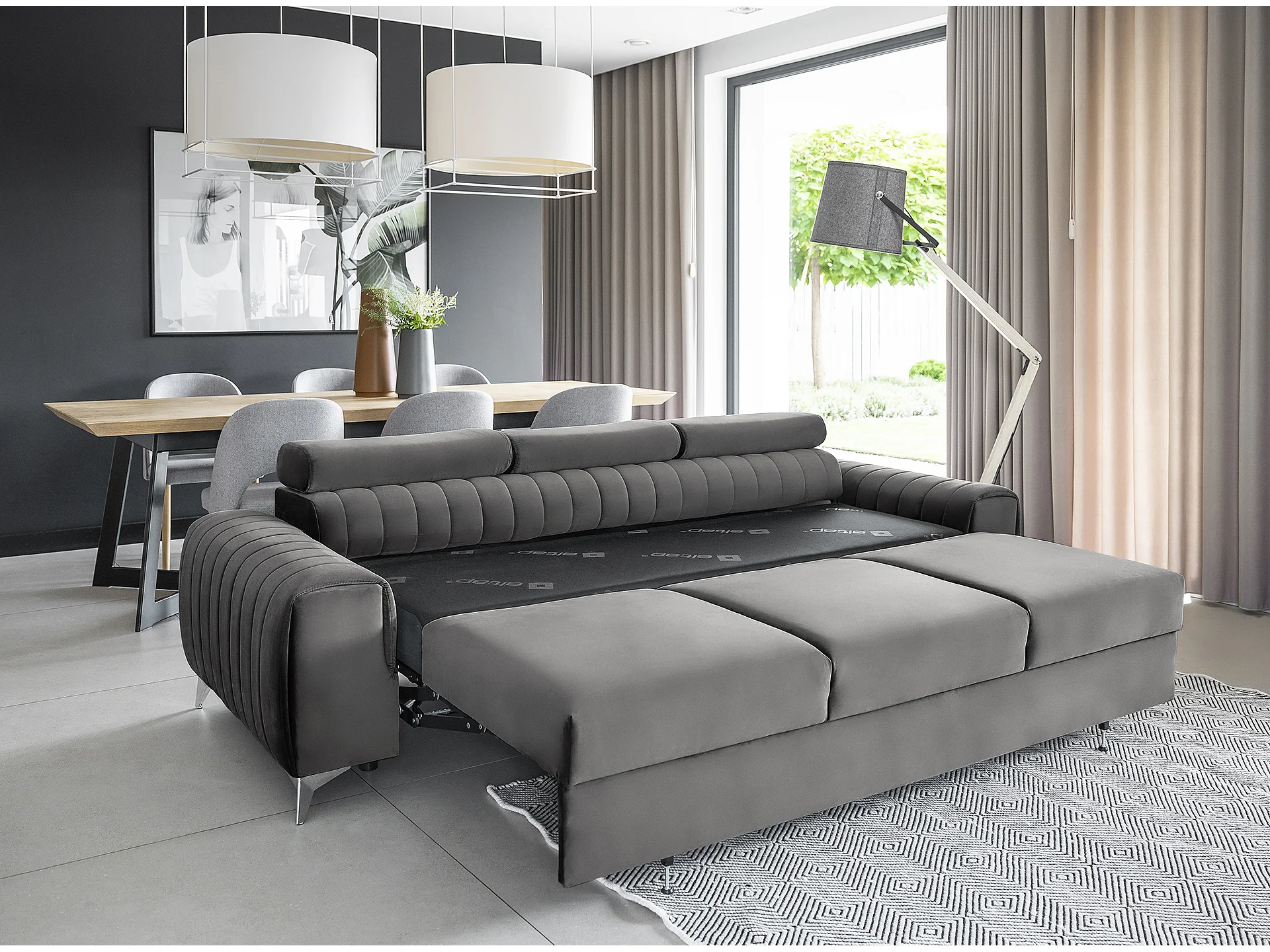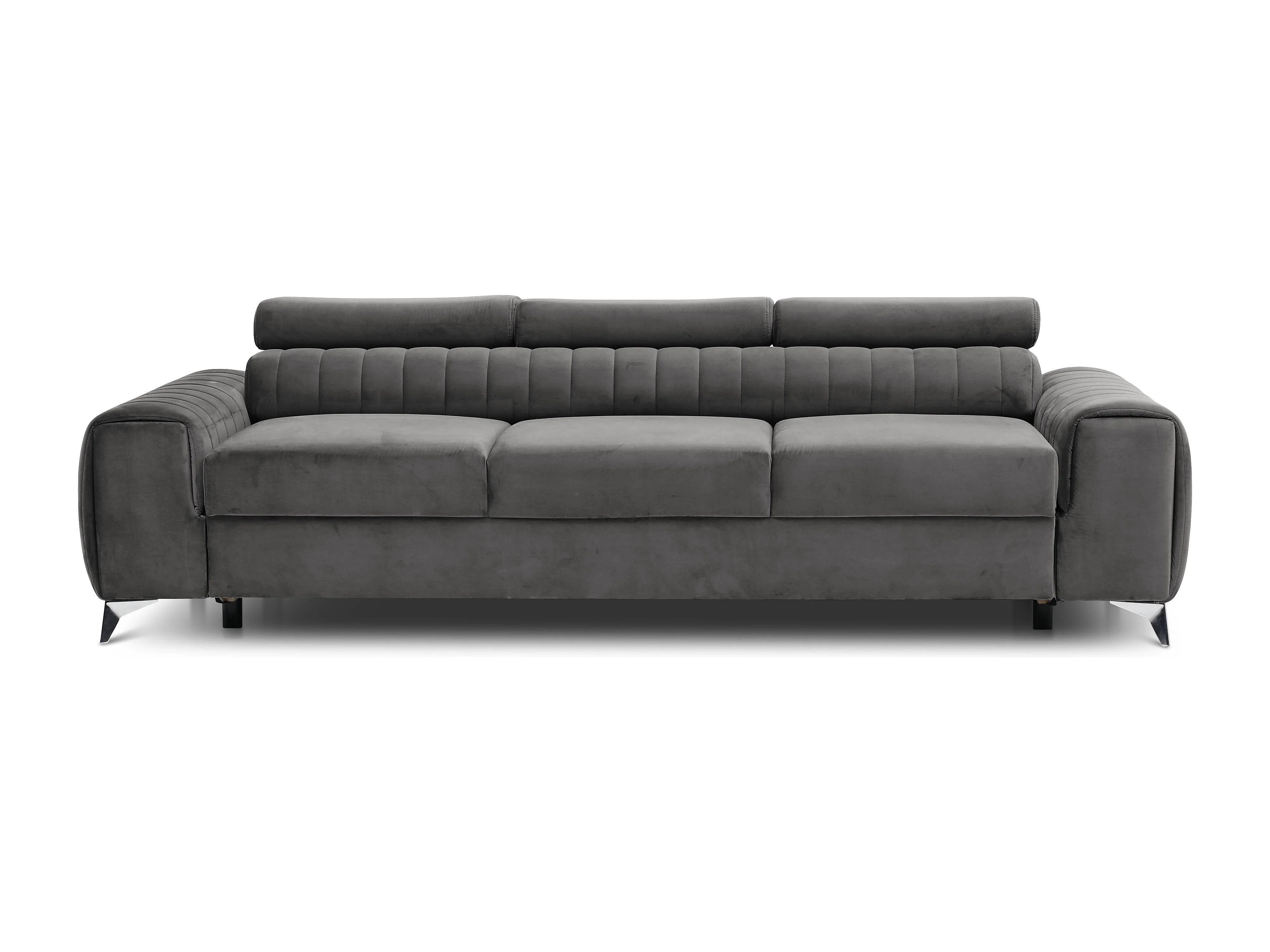 Canapé convertible velours LOZA - Appuis-tête réglables et pieds acier chromé-Gris