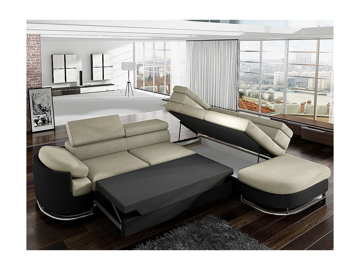 Canapé d'angle convertible en tissu et simili MYSEN - Noir et beige - Angle droit