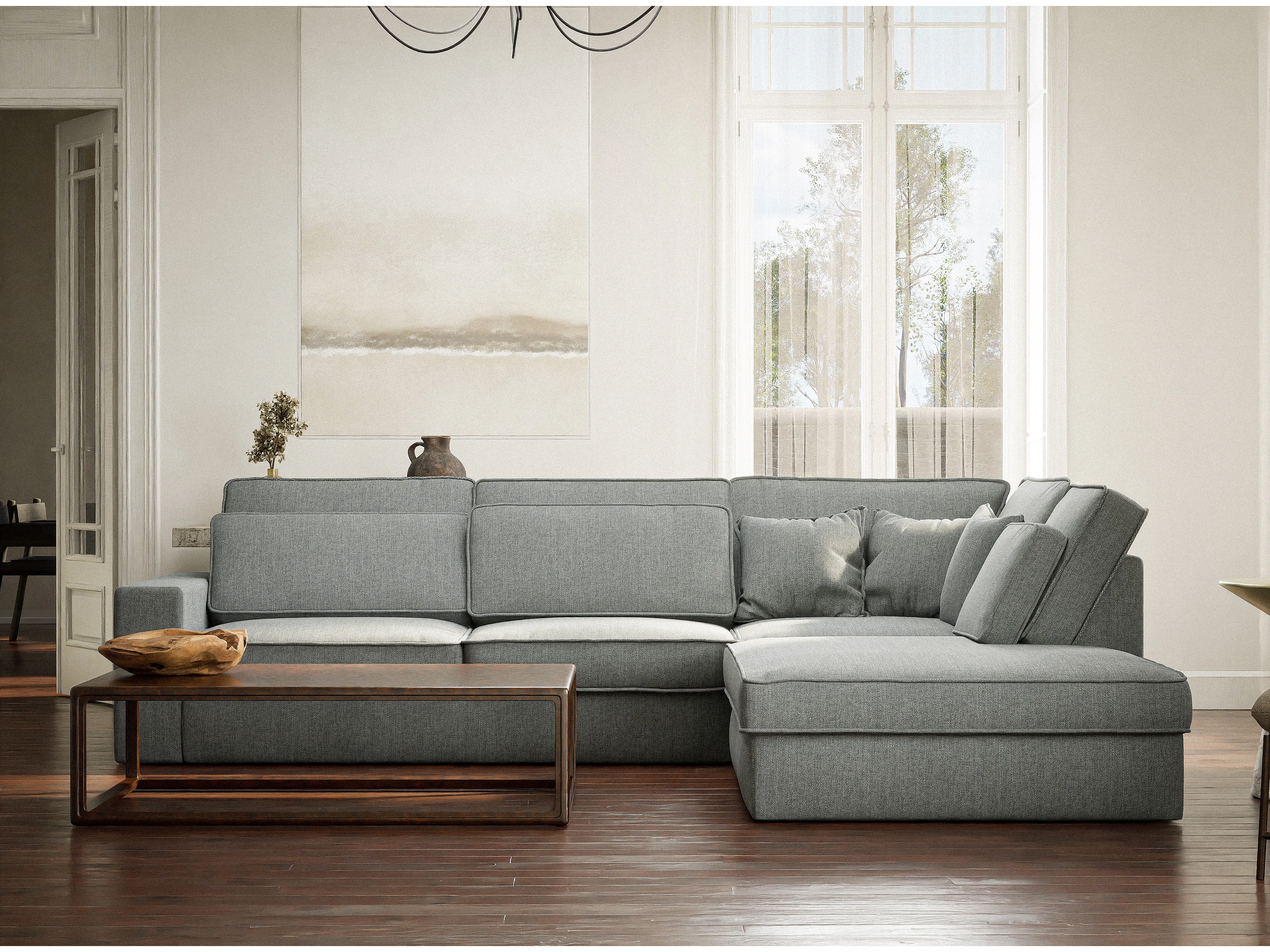 Canapé d'angle droit 5 places en tissu tressé bleu gris KIROU