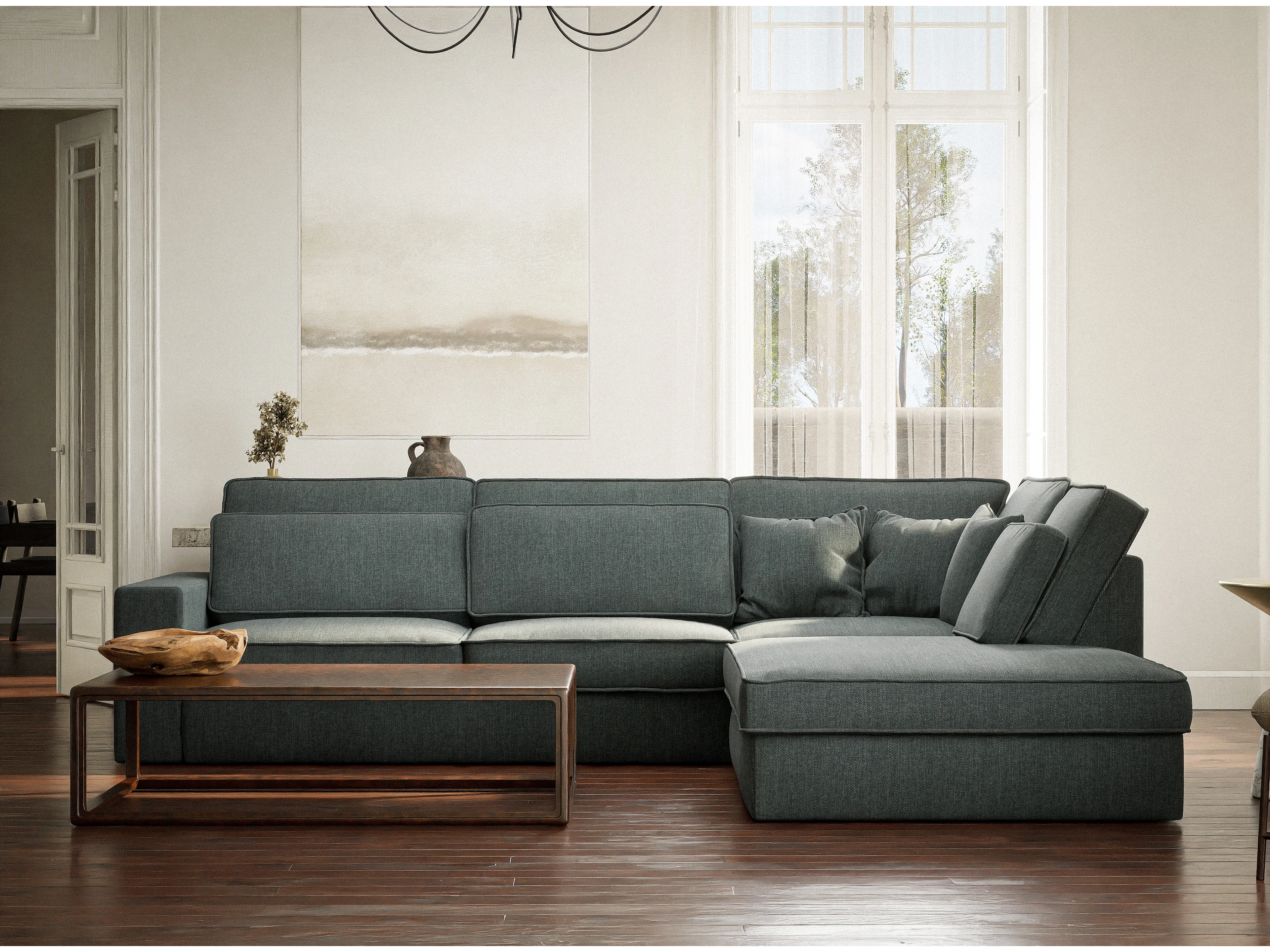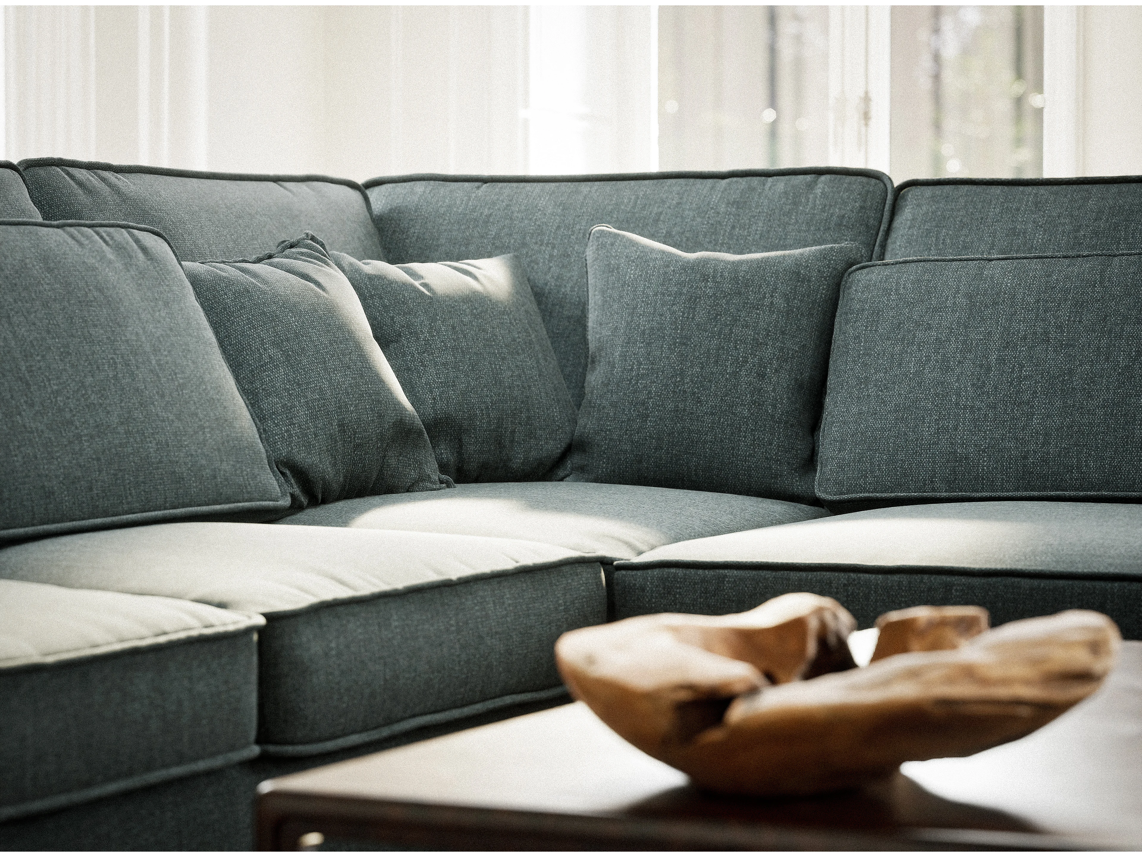 Canapé d'angle droit 5 places en tissu tressé bleu KIROU