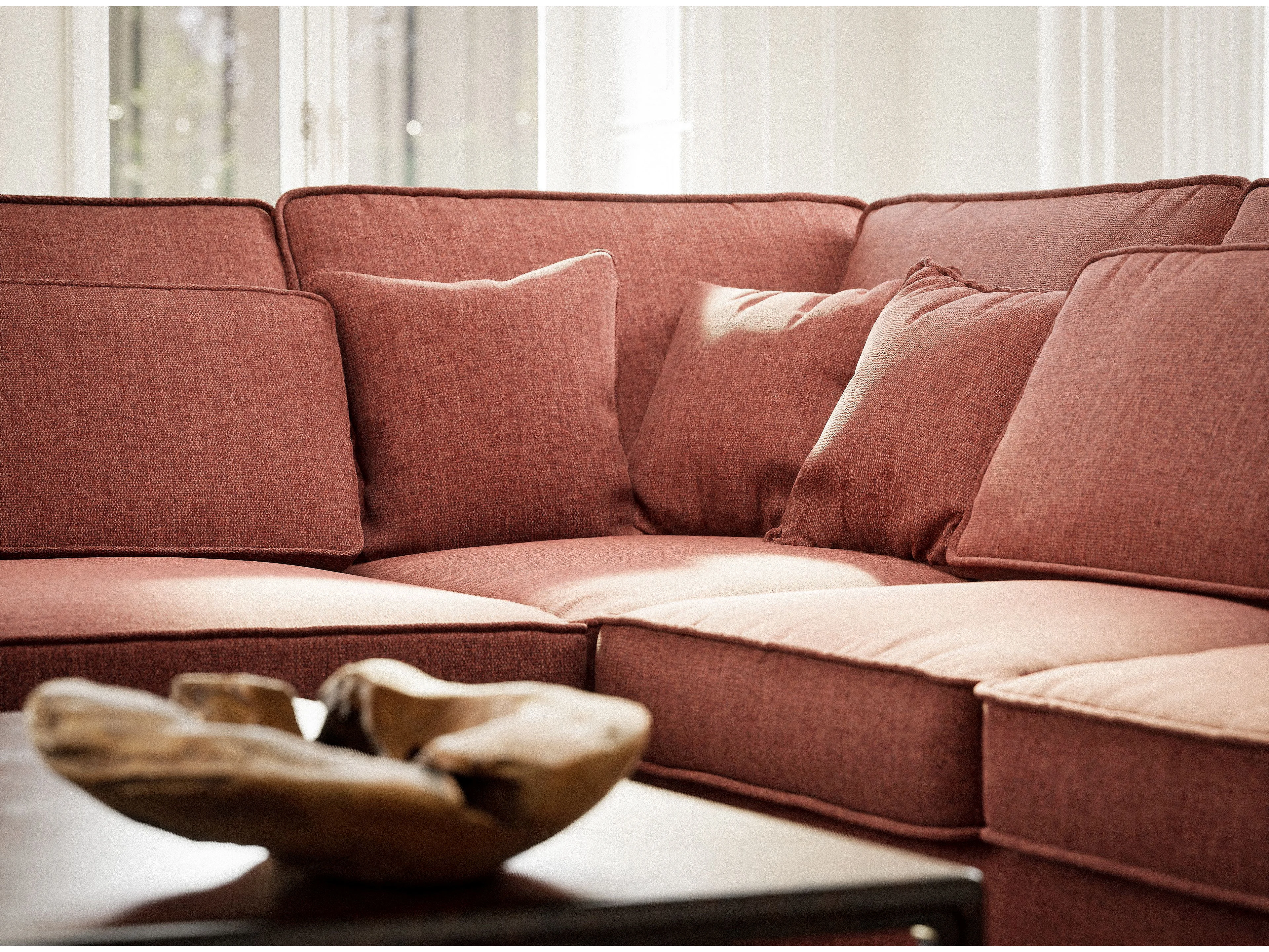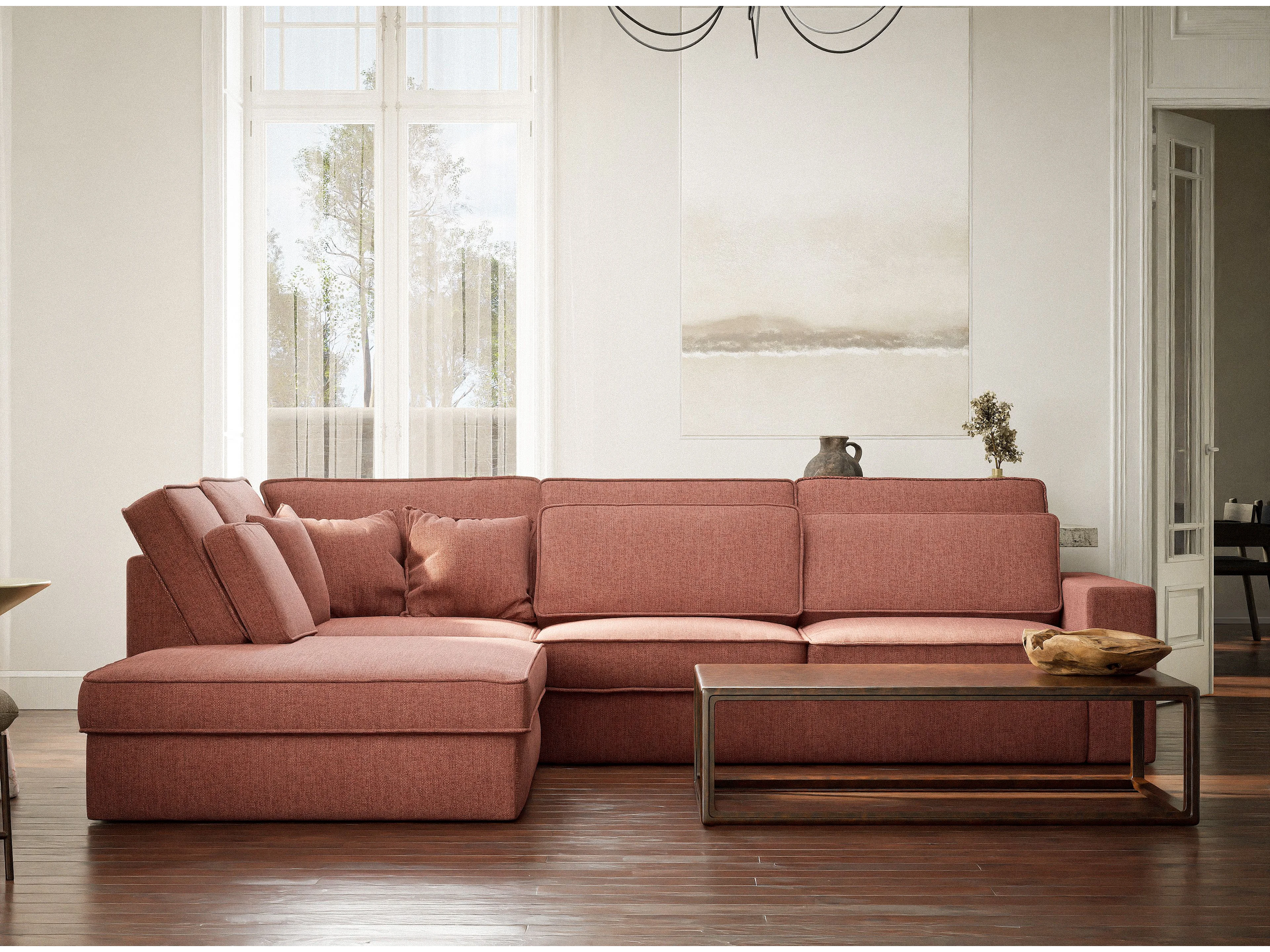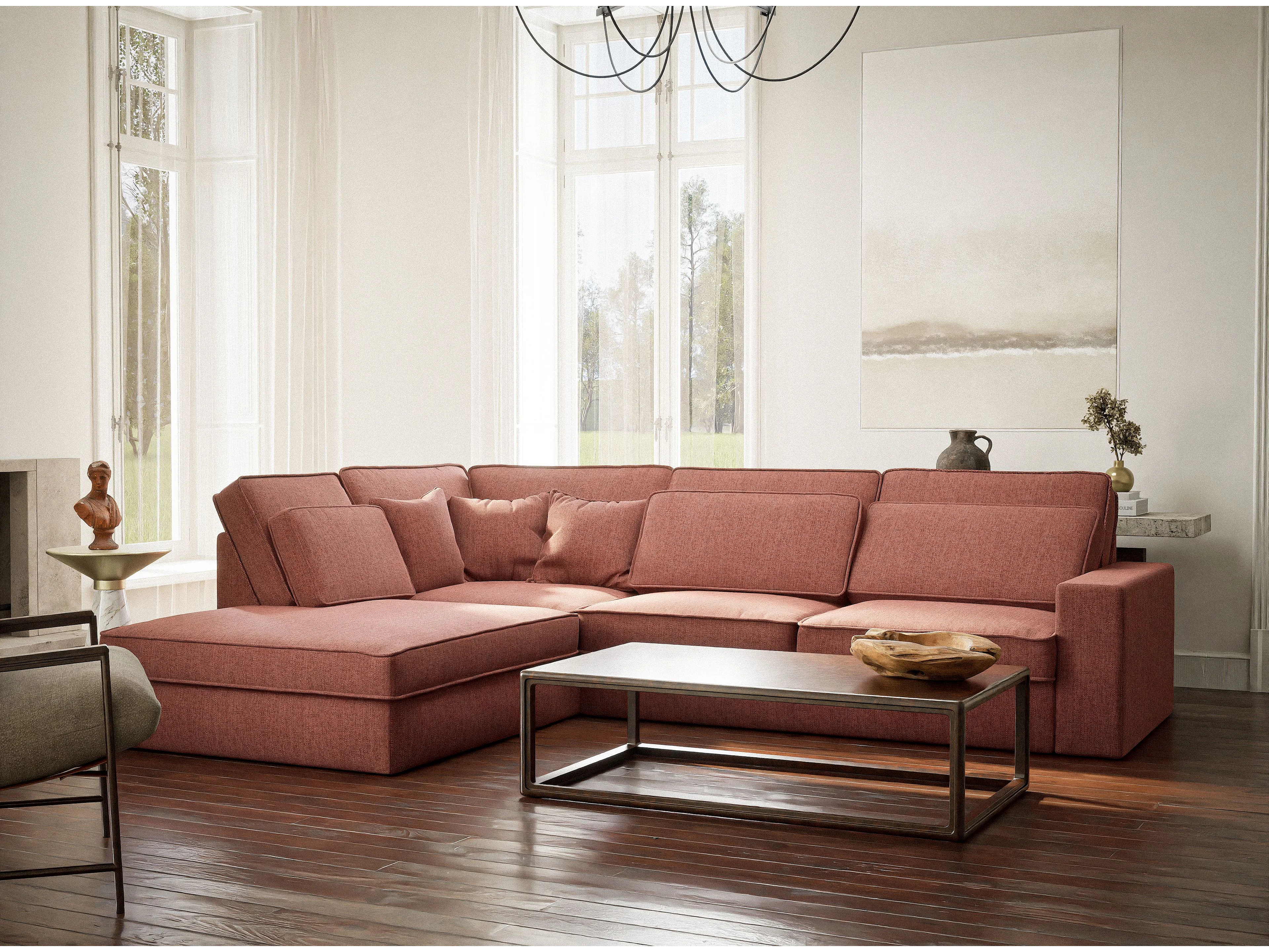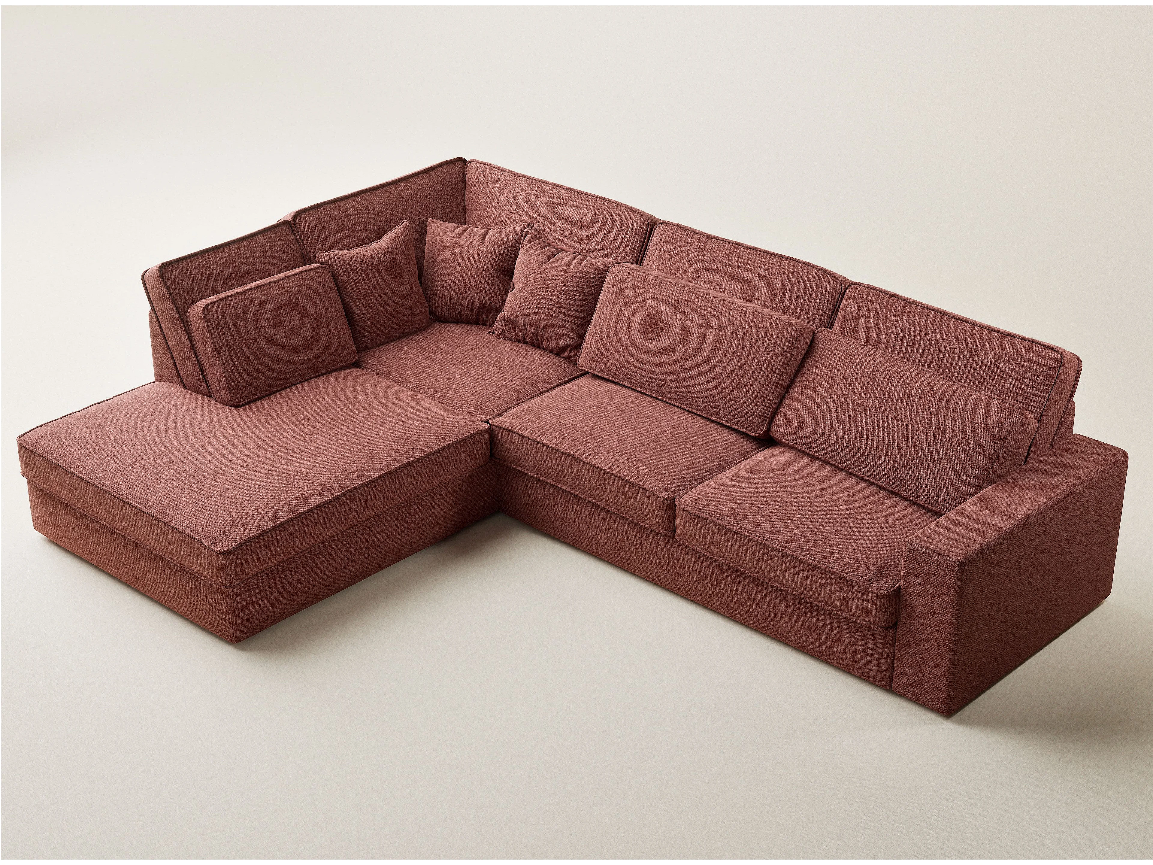 Canapé d'angle gauche 5 places en tissu tressé corail KIROU
