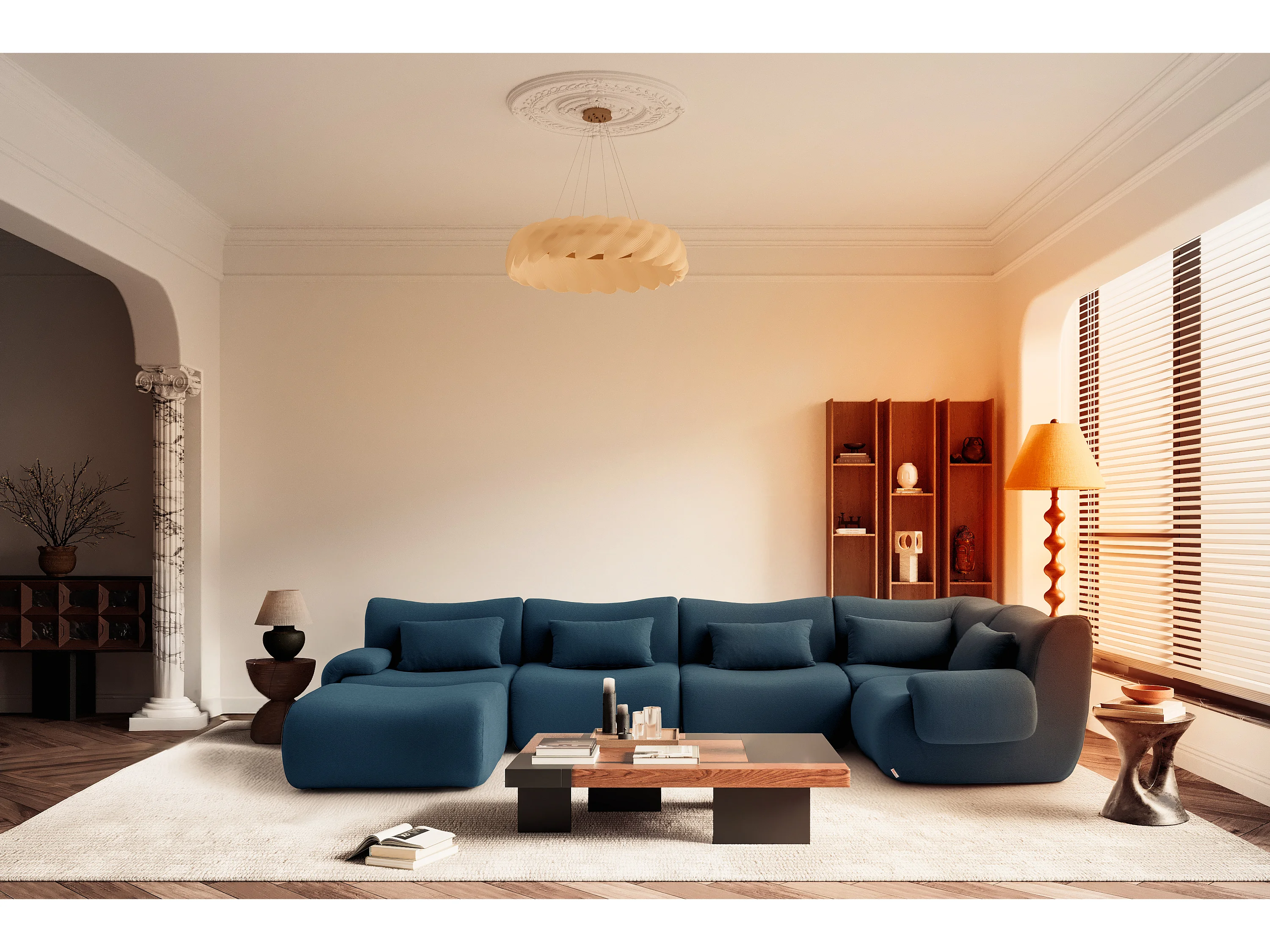 Canapé d'angle modulaire MILYSOFA SOFATIME 5 places avec méridienne Tissu fine bouclette Bleu profond