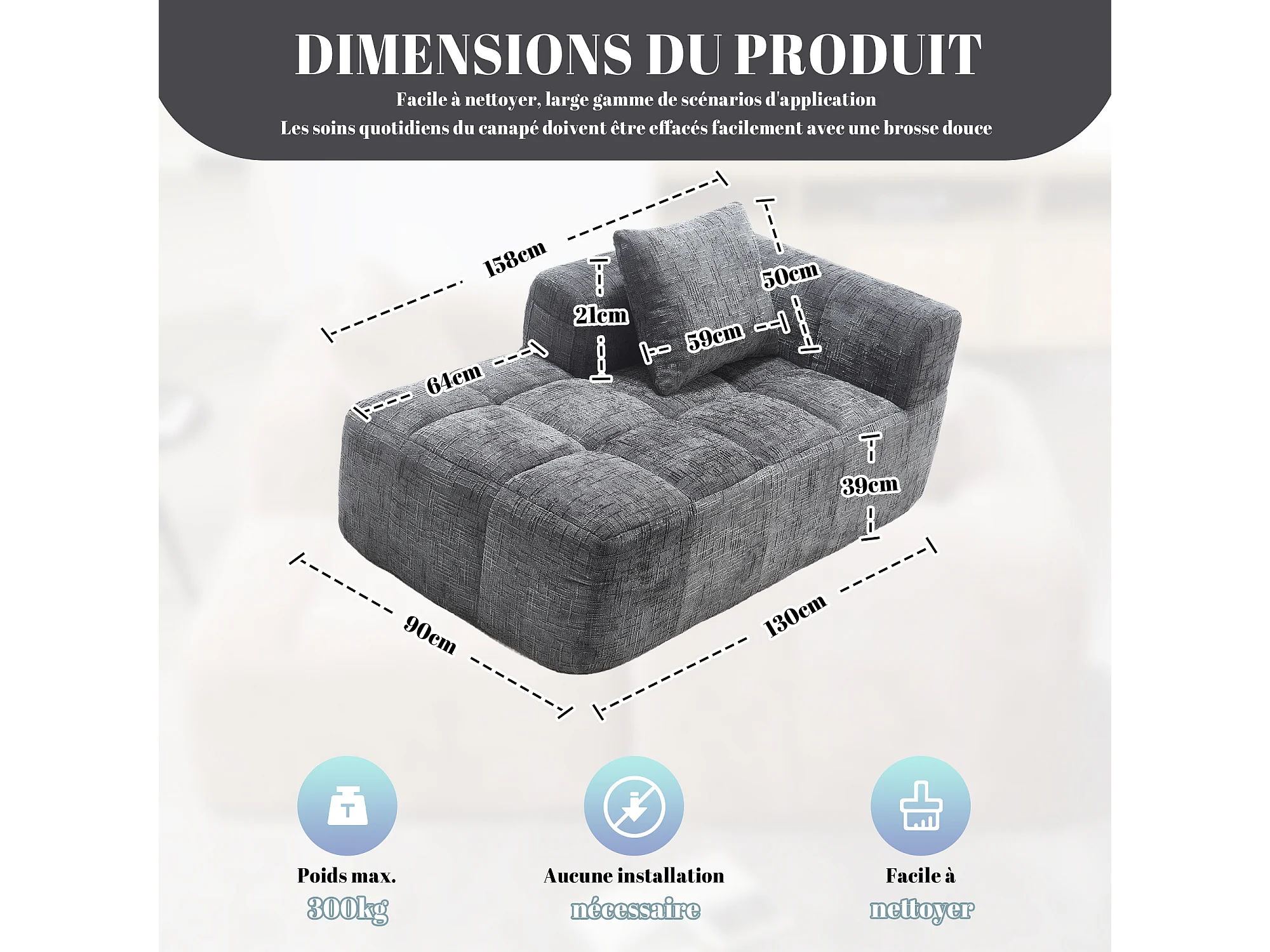 Canapé d'angle 1 places en chenille - module d'angle - gris - avec poche de rangement latérale - Parfait pour Salon et Studio