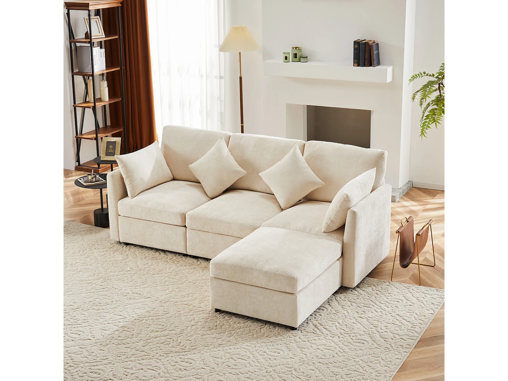 Canapé d’angle 216x161x81 cm, avec pouf mobile, 4 coussins, coussins d’assise déhoussables, chenille beige