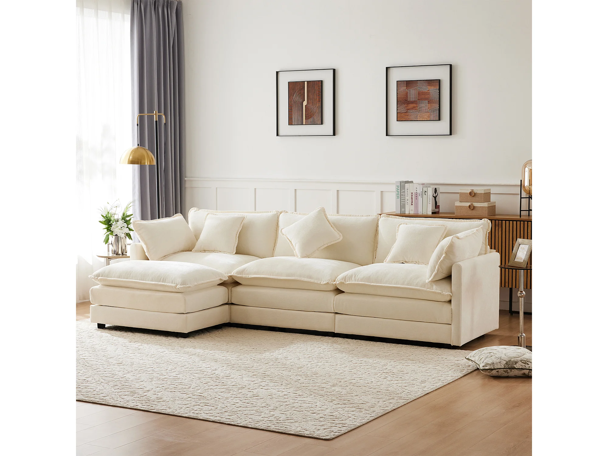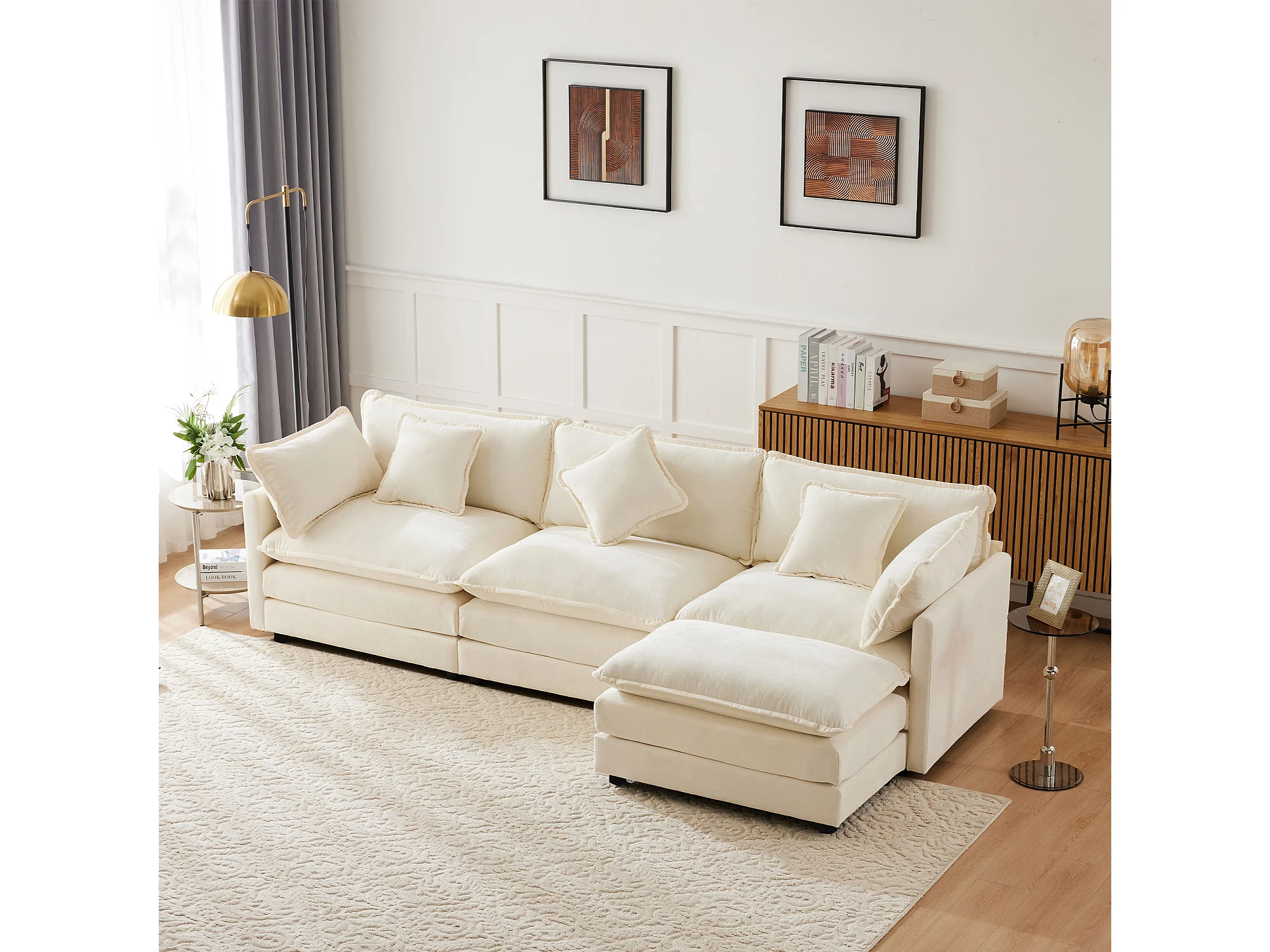 Canapé d'angle 3 places avec repose-pieds - 283 x 147 x 84 - Tissu chenille - Beige