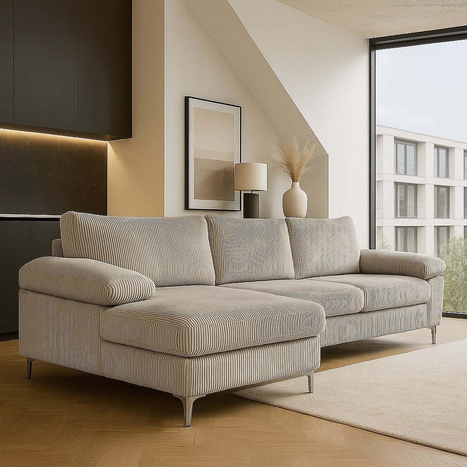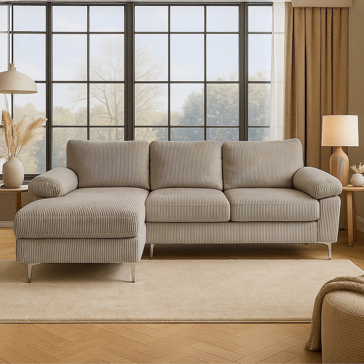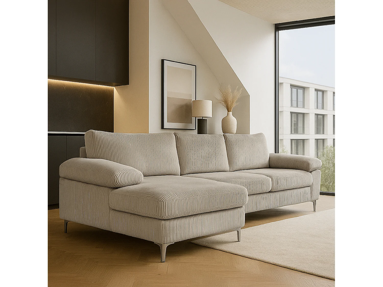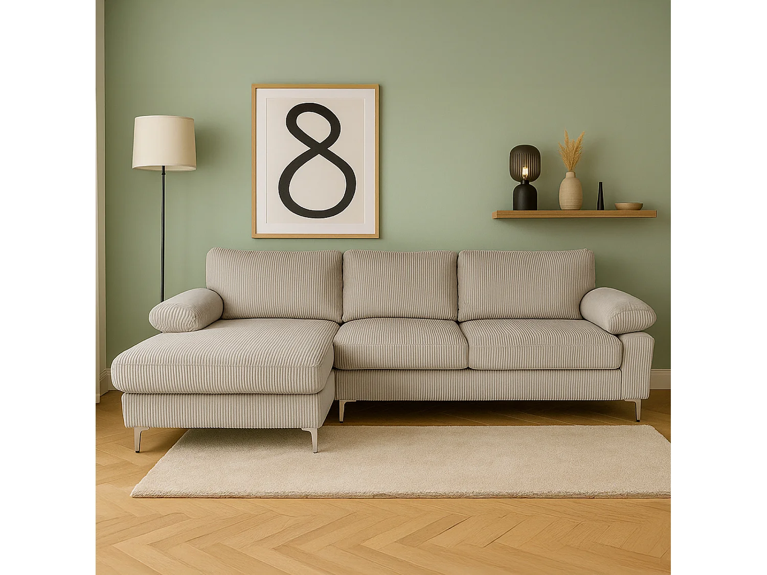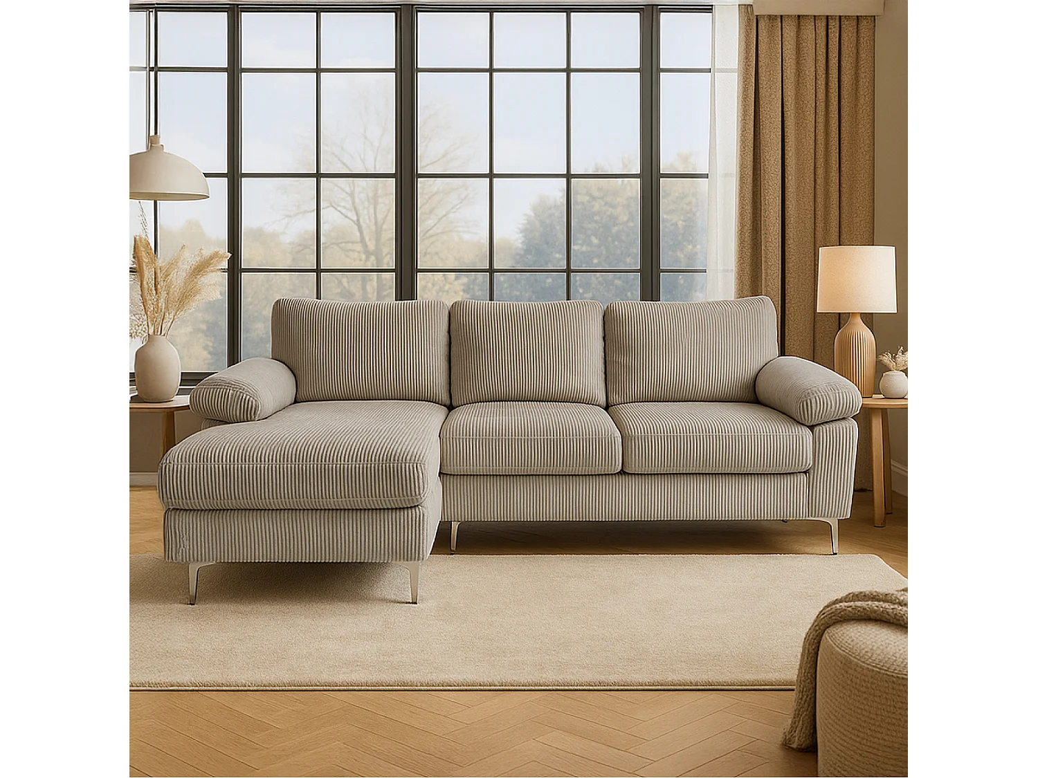 Canapé d'angle 4-5 places méridienne gauche velours côtelé beige GALWAY