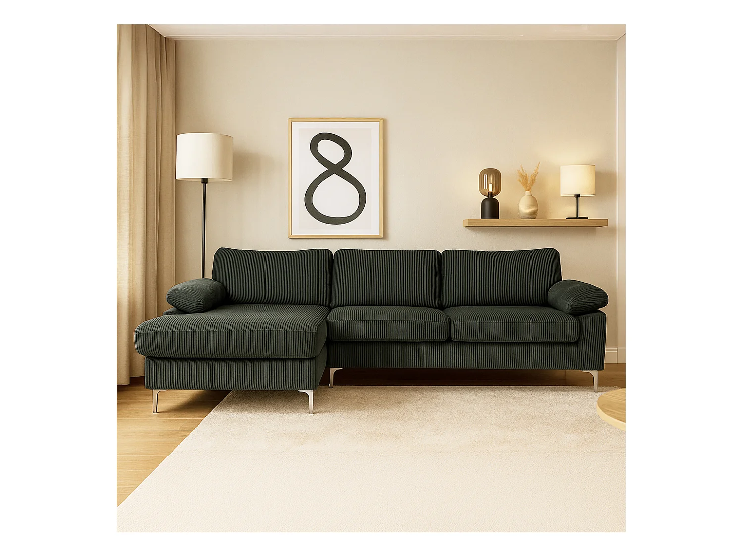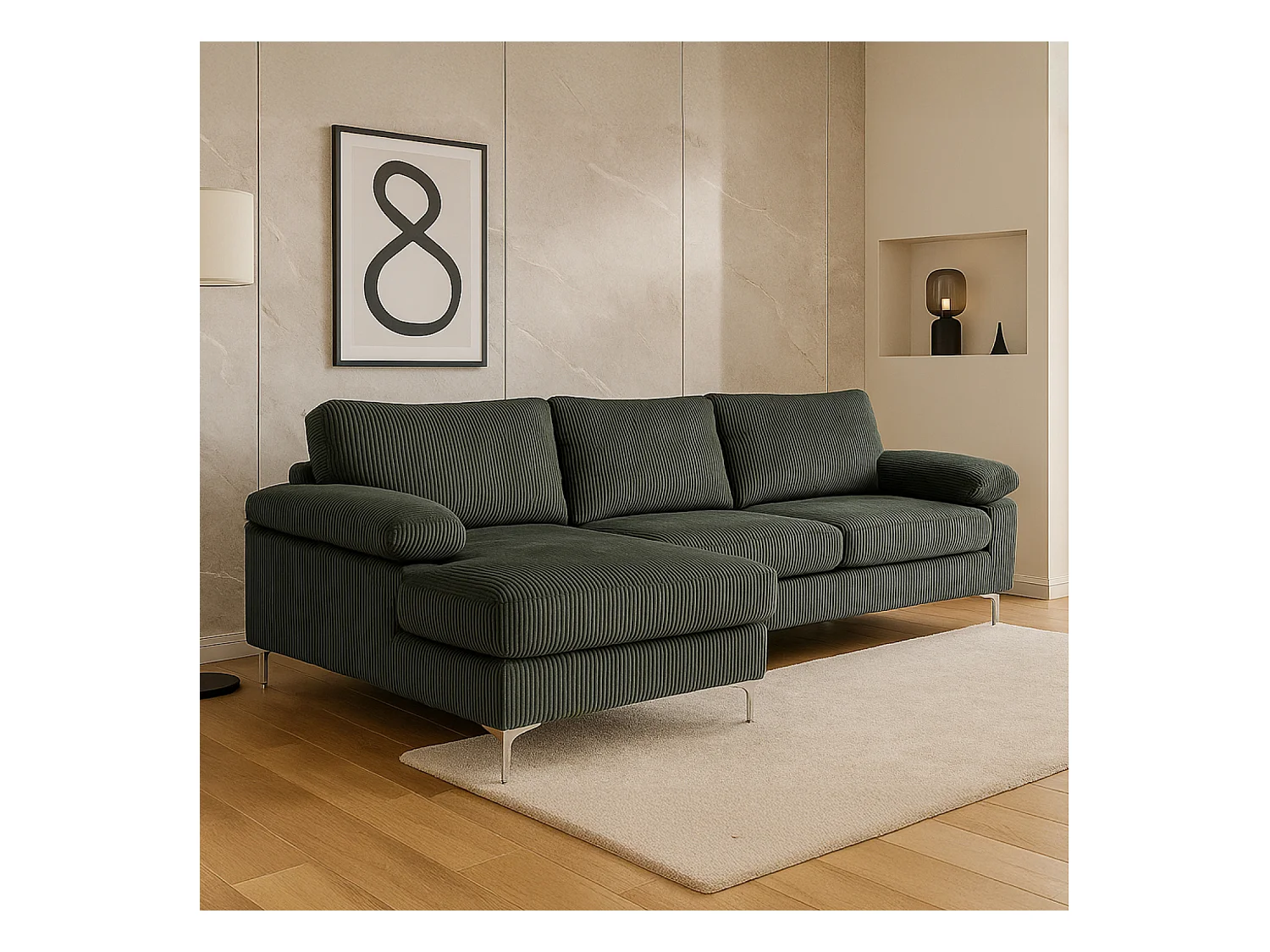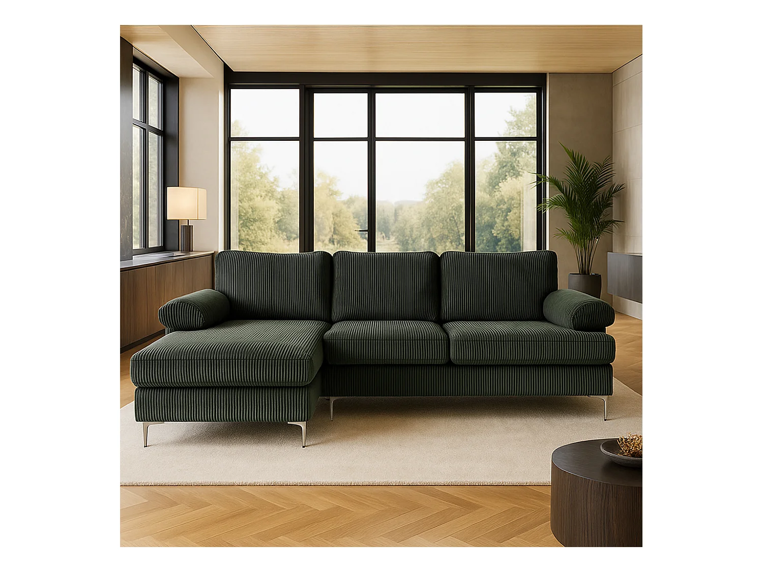 Canapé d'angle 4-5 places méridienne gauche velours côtelé vert GALWAY