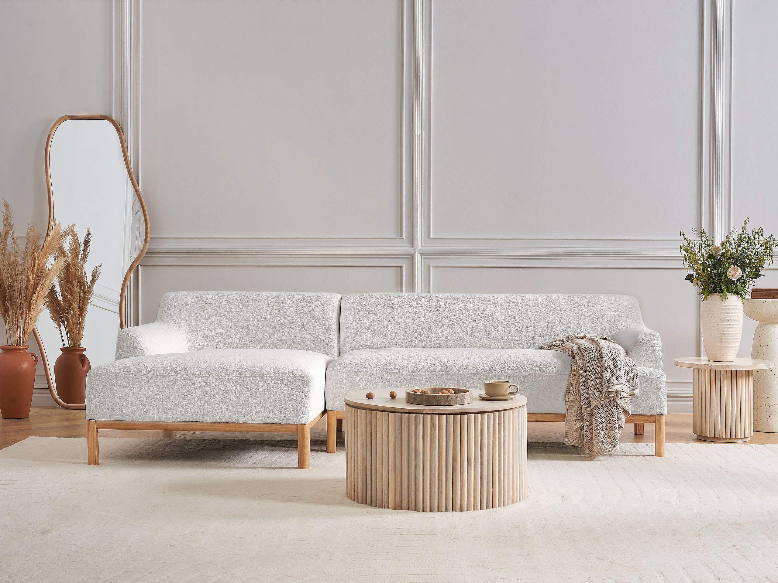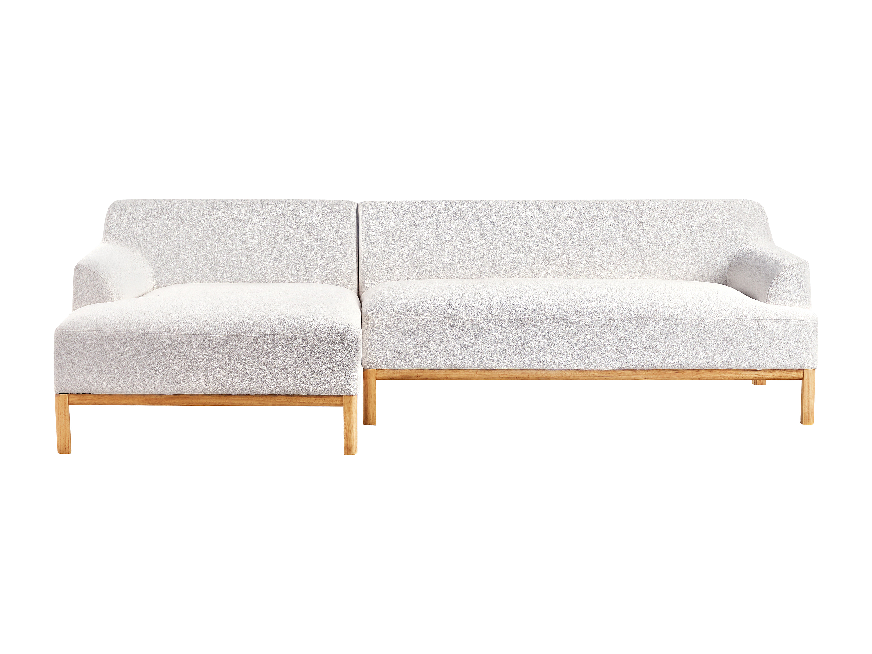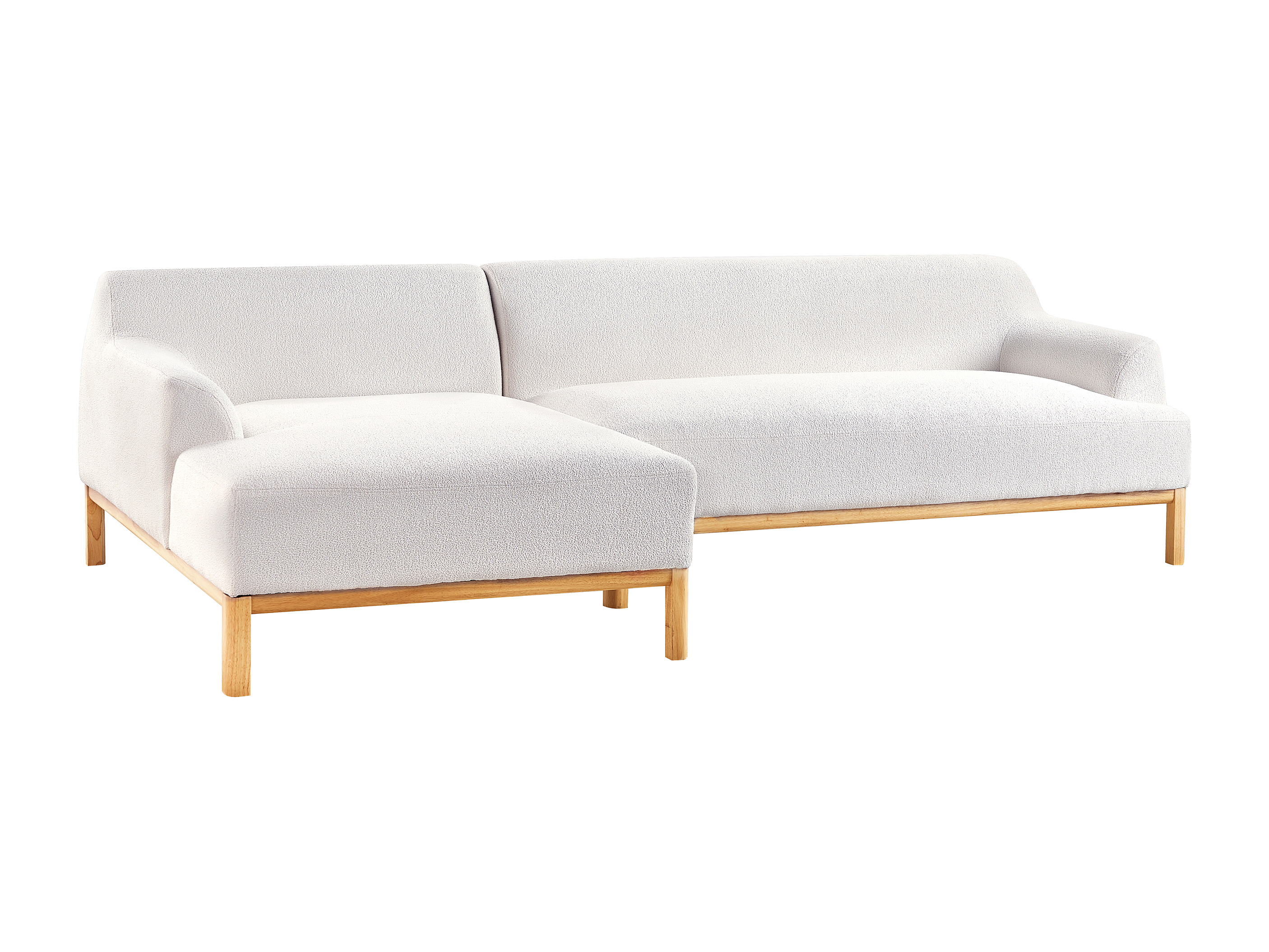 Canapé d'Angle à gauche Pieds en Bois Meuble Coin de Salon en Tissu Bouclé Blanc Cassé Sosjo