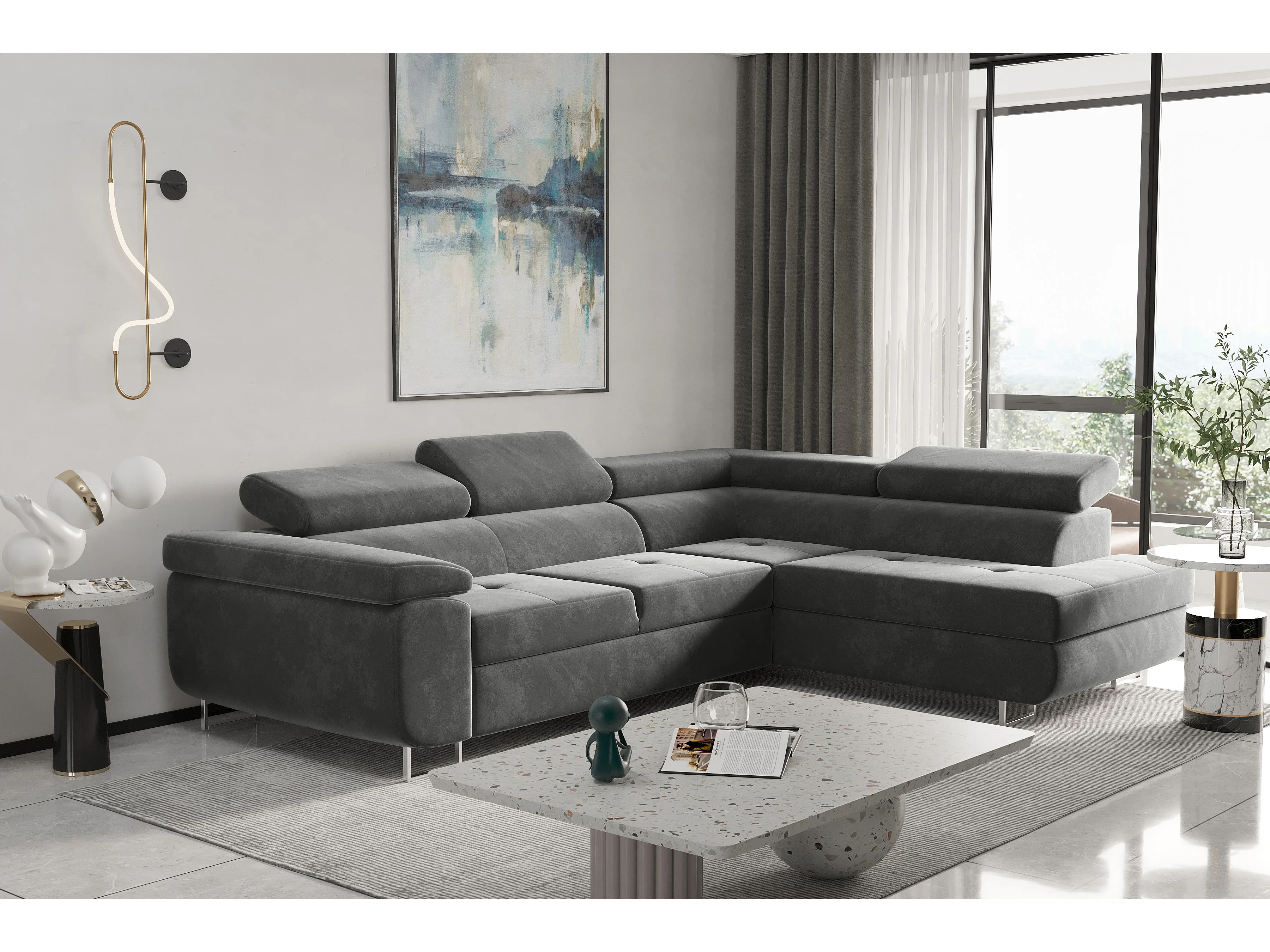 Canapé d'angle ATOM avec fonction couchage, tissu Monolith, gris, droit
