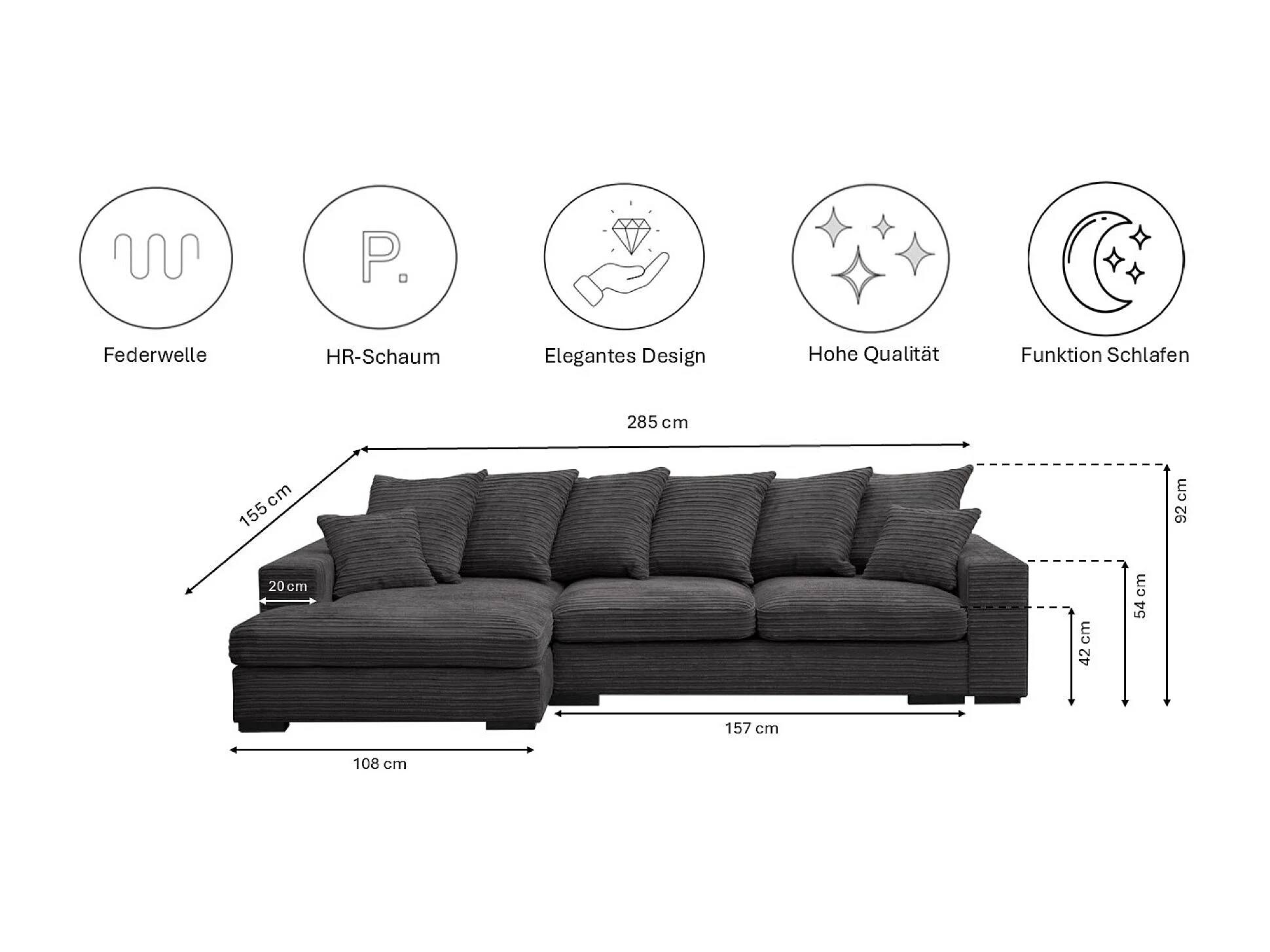 Canapé d'angle Carlos avec fonction couchage et coffre de lit Tissu élégant Poso Graphite